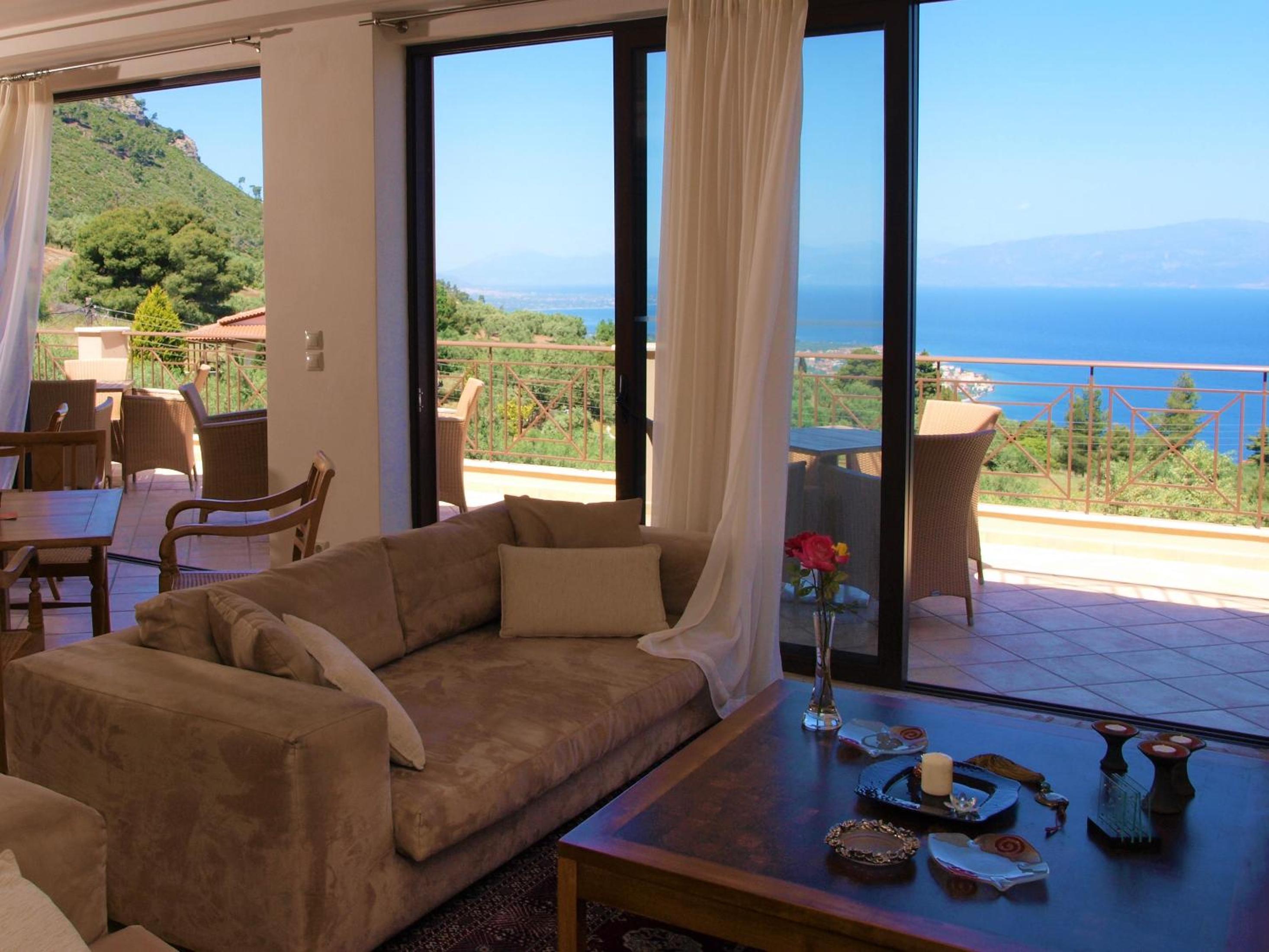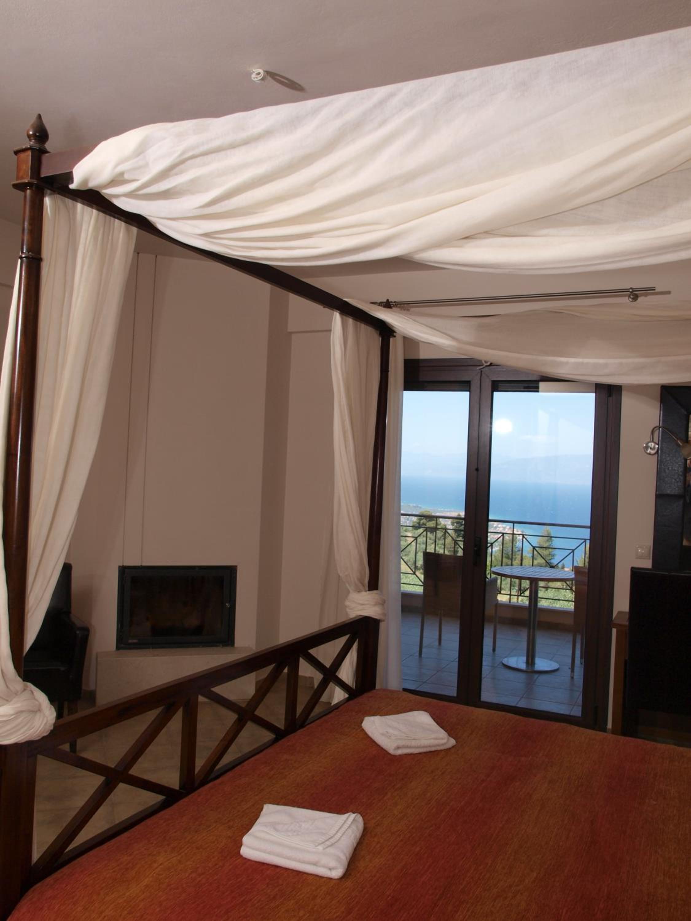Perched on mount Chelmos, Theasi offers panoramic views of the Corinthian Gulf from private balconies in each room. Most rooms feature a cozy fireplace, adding warmth to the stunning vistas.