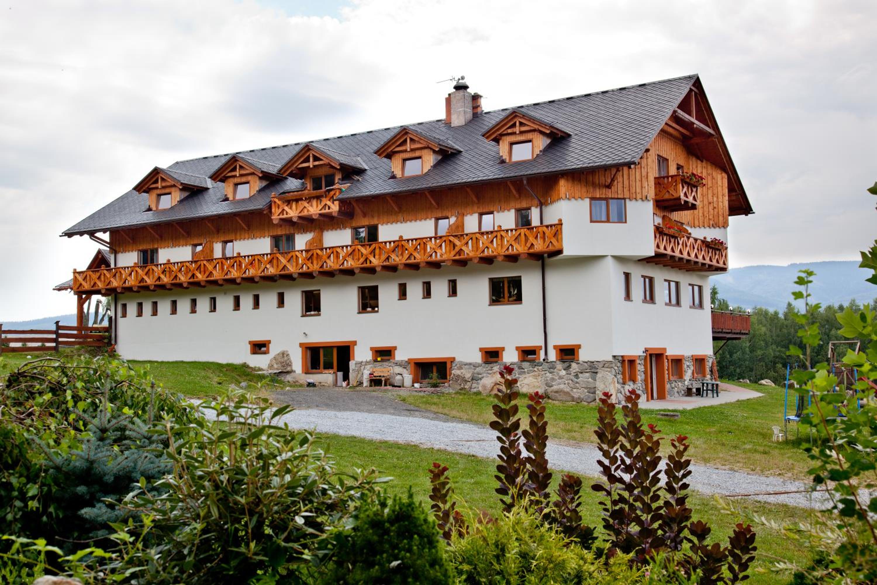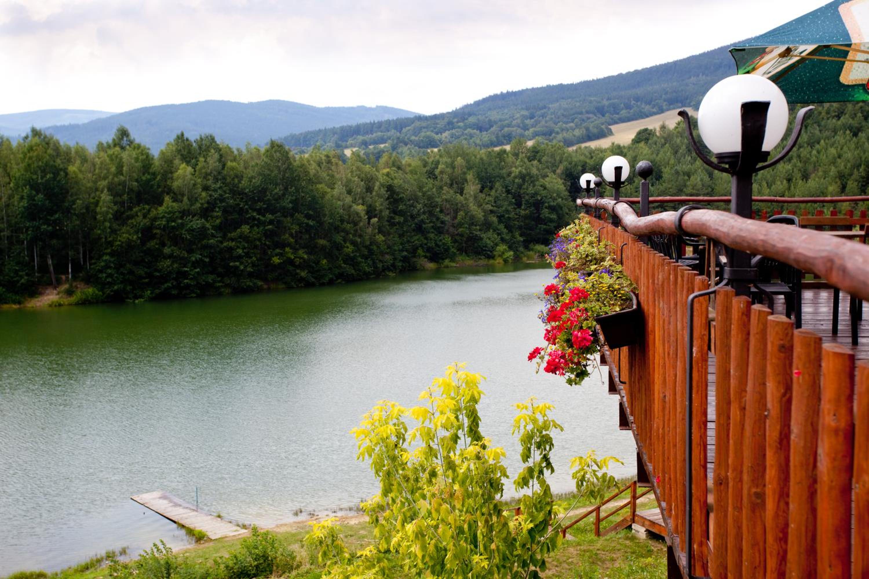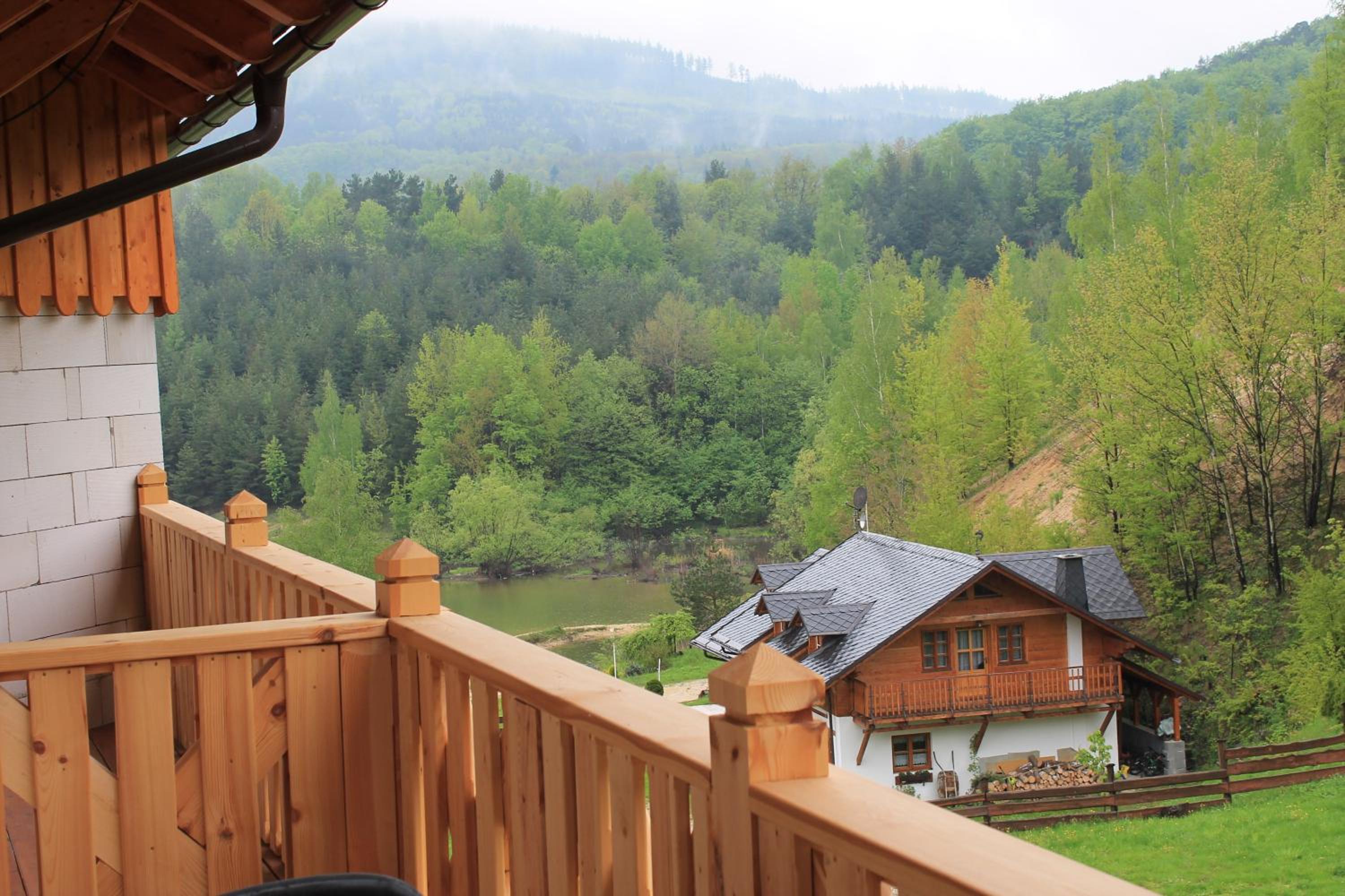 Scenic Views and Rustic Charm: Rezidence u Jezera offers rooms with balconies showcasing picturesque landscapes, rustic décor, and modern amenities including satellite TV and spa baths in some units.