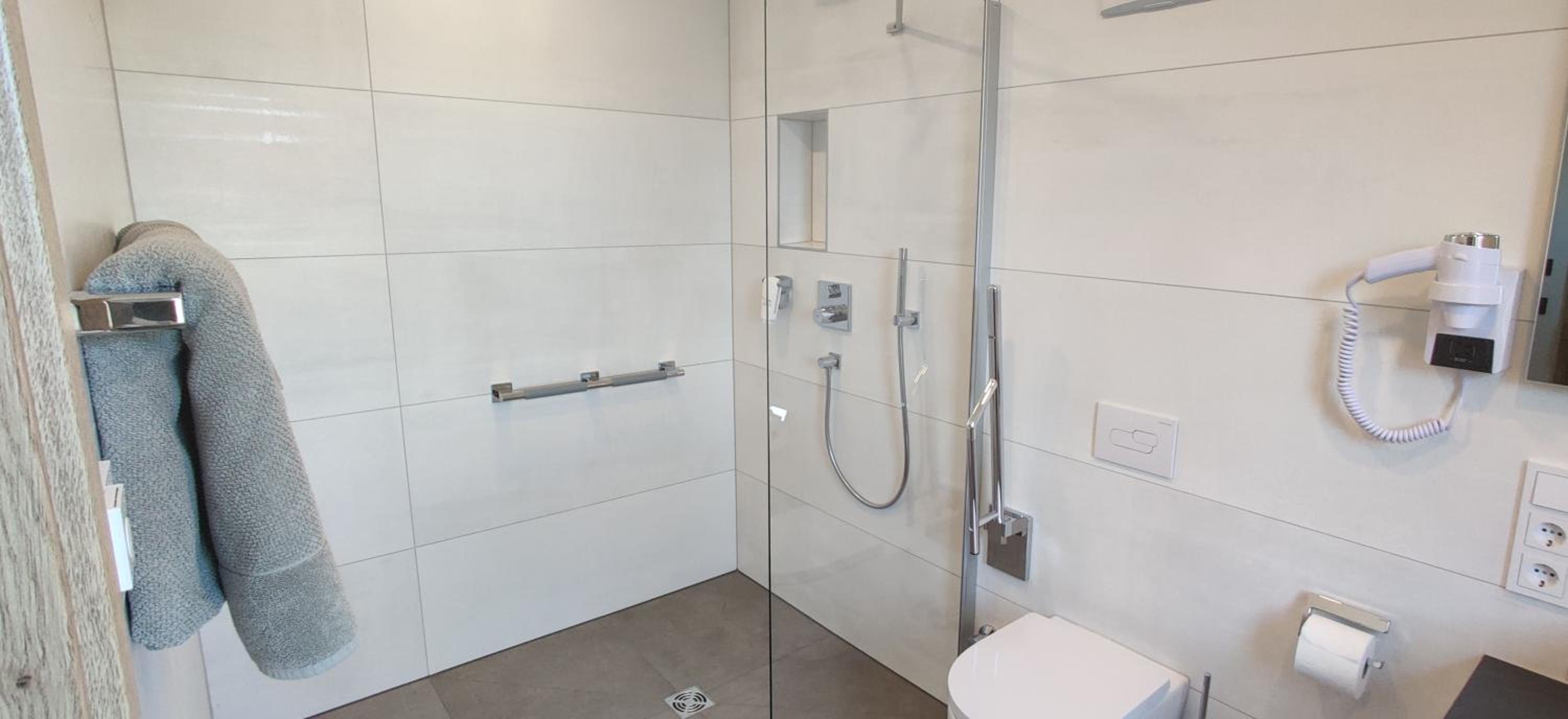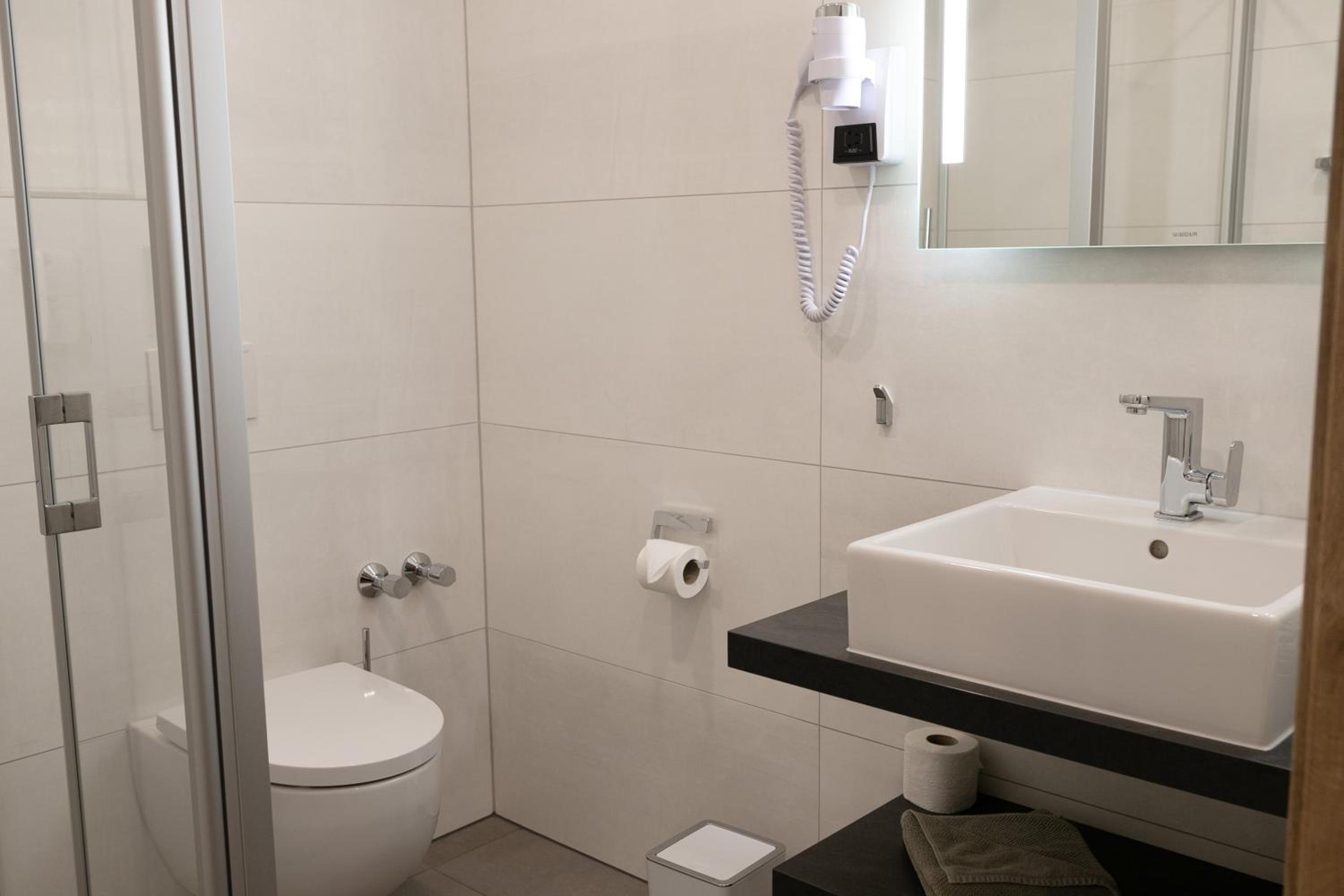 Waren im neuen Gebäude gegenüber vom Gasthof. Das Zimmer sauber, groß und modern. Das Bad groß und die Dusche ebenso. Nettes kleines Frühstück.