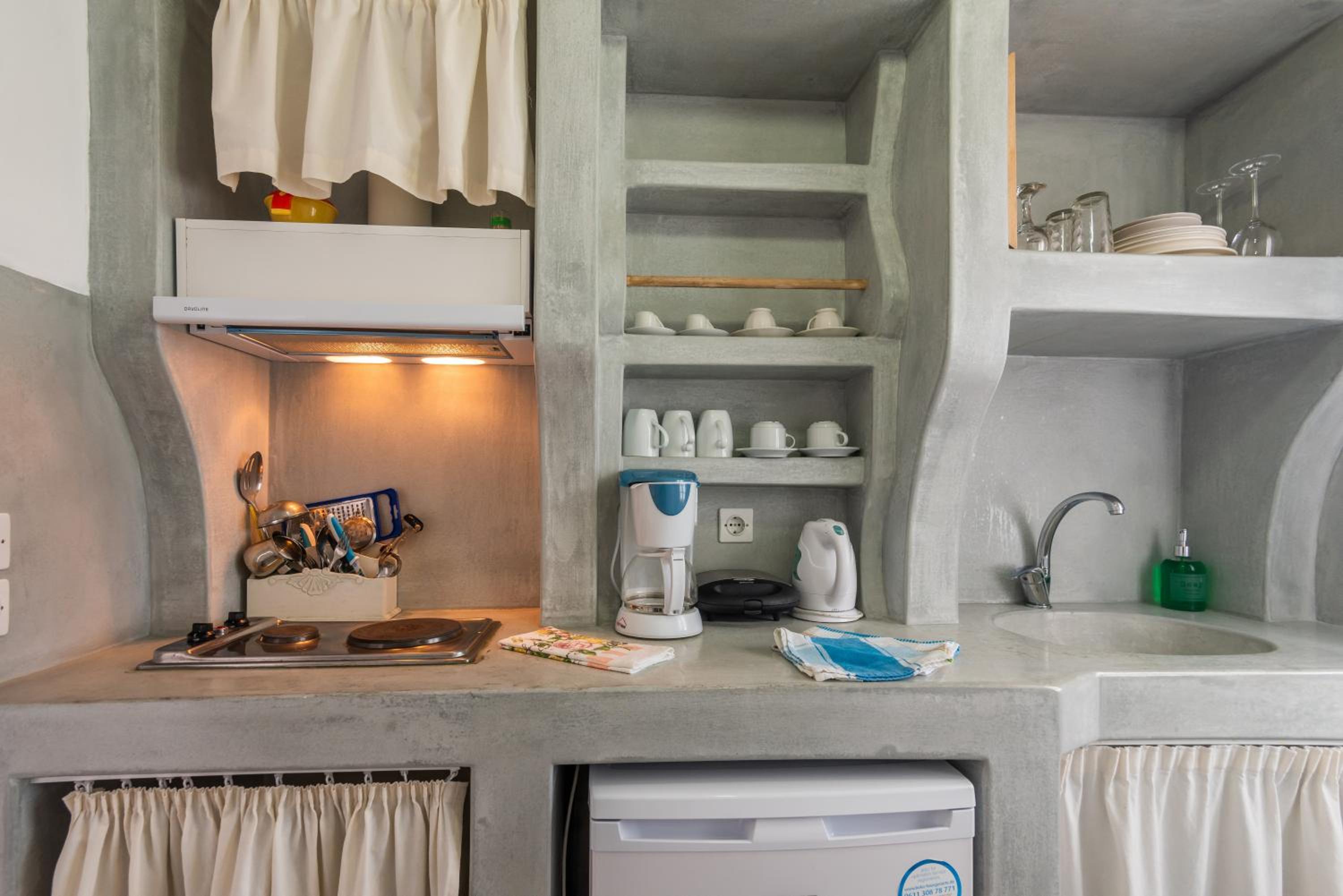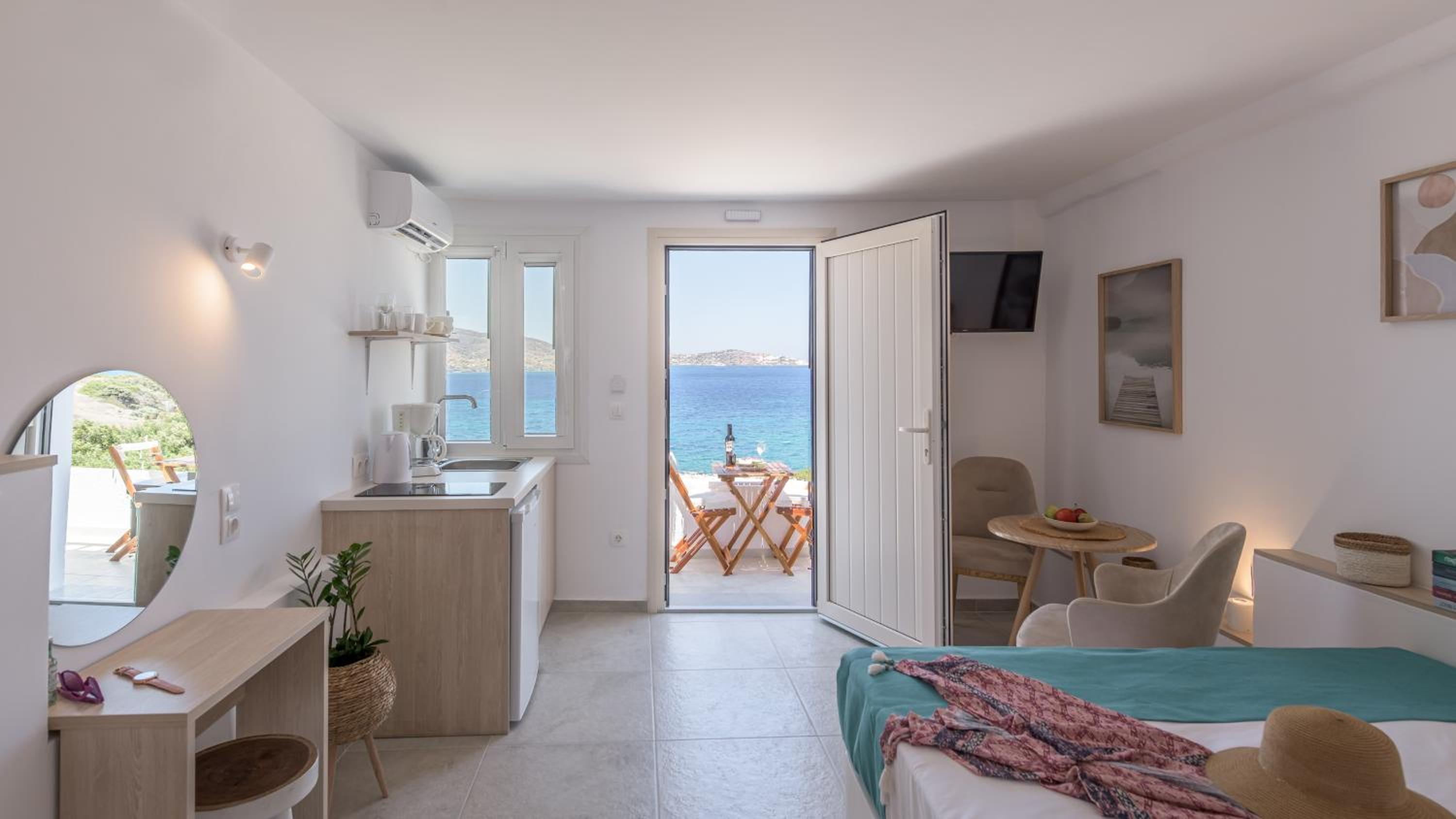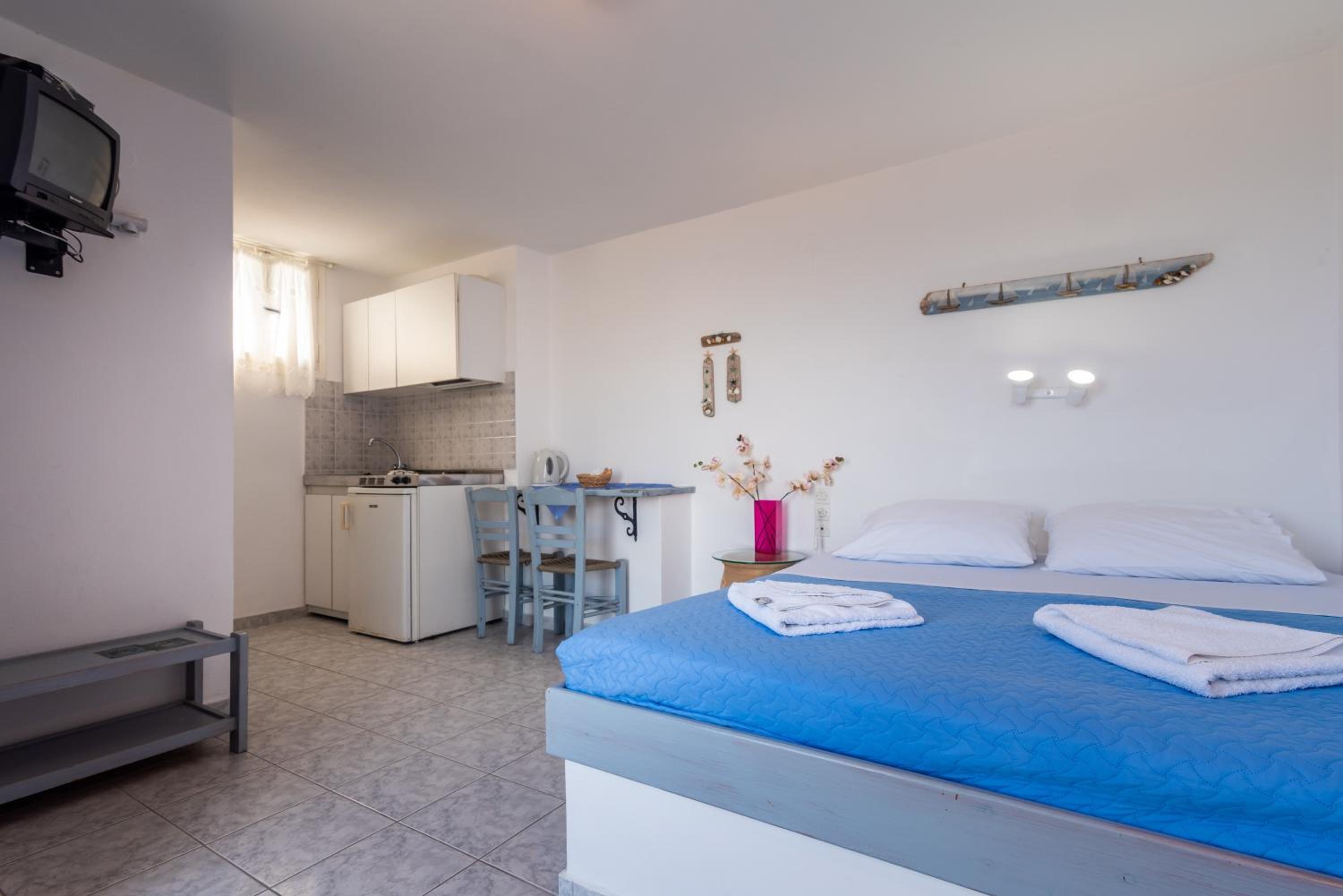 The isolated location made this a great stay. Peaceful and quiet. There's a nearby beach that's perfect for a quick dip. The room was very tidy. There are nice trails right outside the door for taking short hikes. It's even possible to walk along the beach into Pollonia quite easily. The staff in the office in Pollonia were very helpful with any kind of information. Use their help. The best...BEST thing though was the sunrise. If you stay here, you have to make sure you wake up to see at least one sunrise from the balcony. It came up almost exactly between Kimolos and Polyegos Islands and faced directly at our balcony. Spectacular.