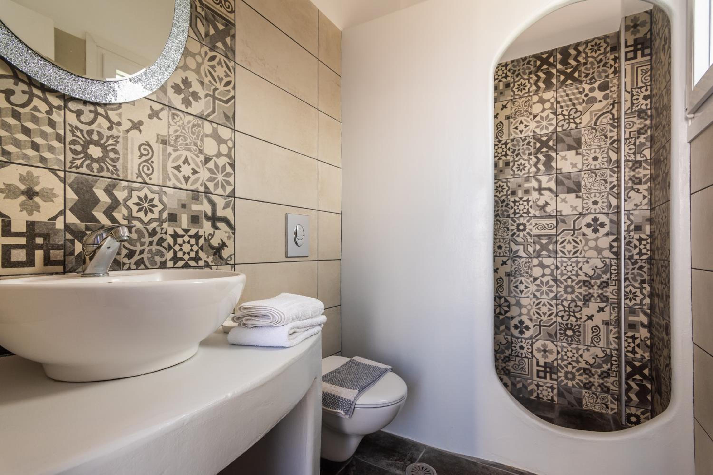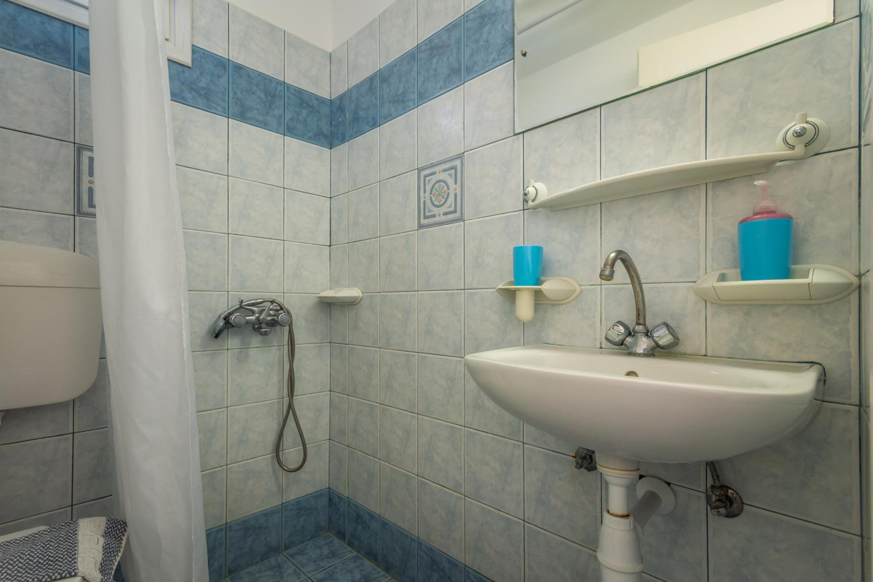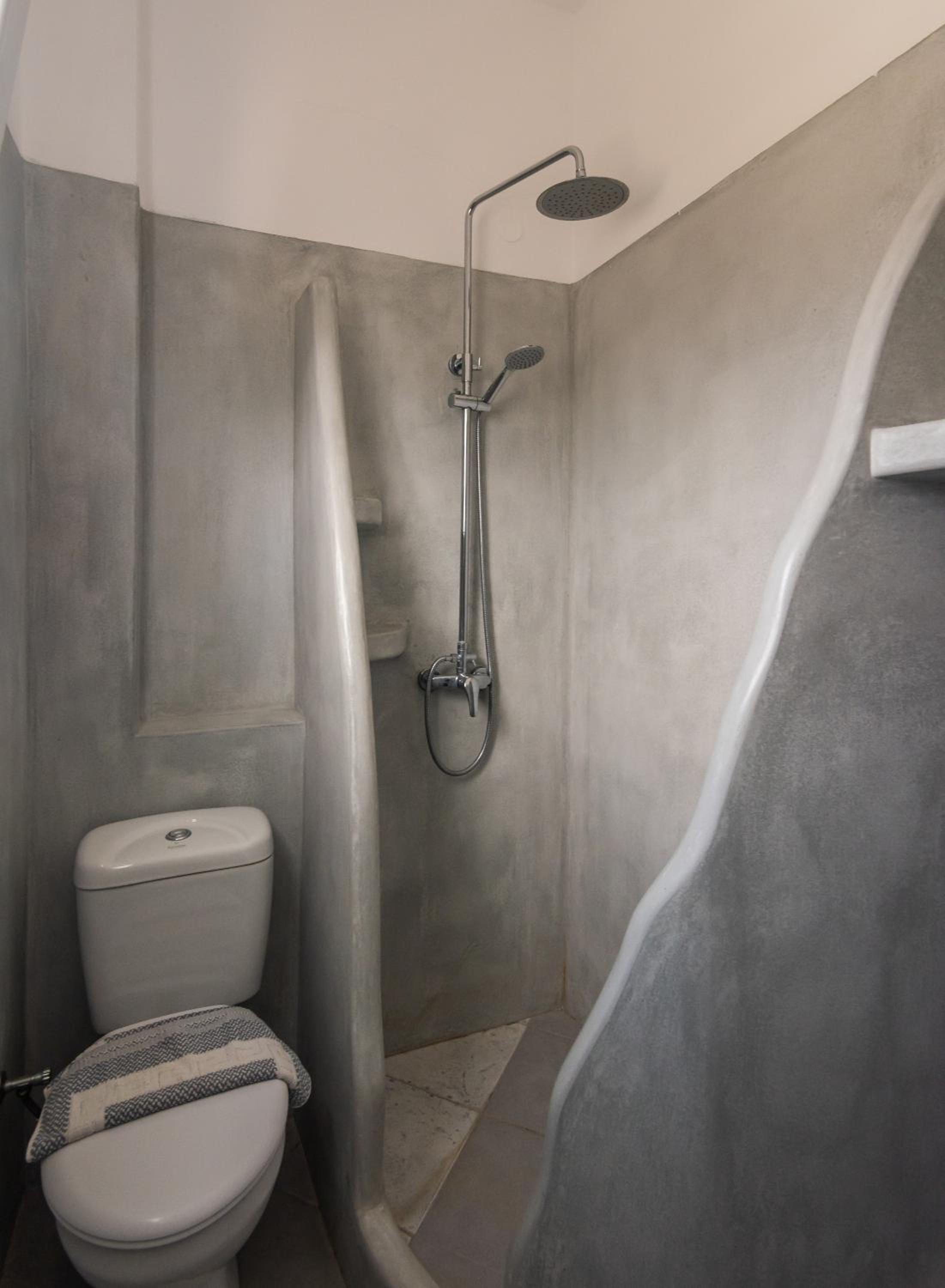 The kitchen has only pretty basic amenities. Serviceable, but basic. The long road to the property is unpaved and narrow. It can be a challenge driving up and down the lane every day. I know it's just the style of bathrooms in many places in Greece, but I really don't like the bathroom floor getting all wet whenever someone takes a shower. The shower cubicle looks nice, but it doesn't do much in terms of keeping water off the floor.