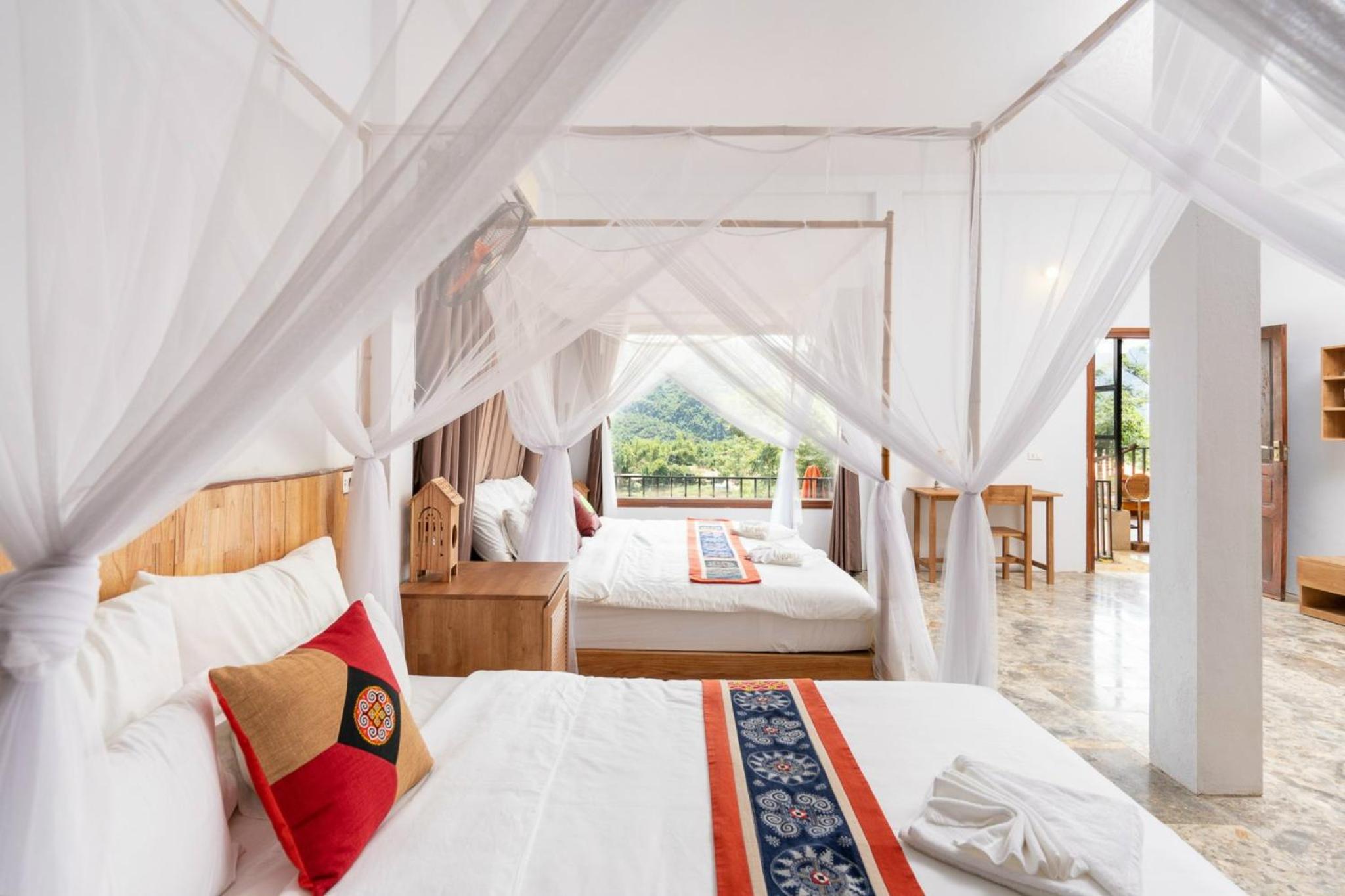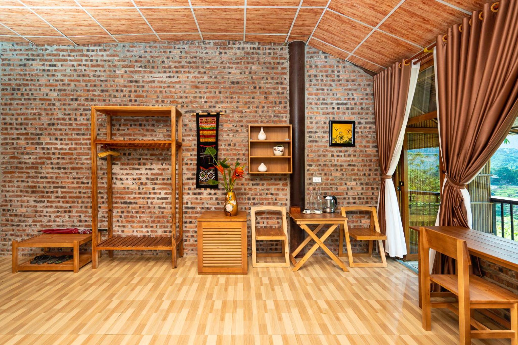 Each room at Inh La Home Pu Luong boasts a private balcony, with some rooms overlooking the majestic mountains. Enjoy modern amenities such as air conditioning, wardrobe, and room service for a comfortable stay.