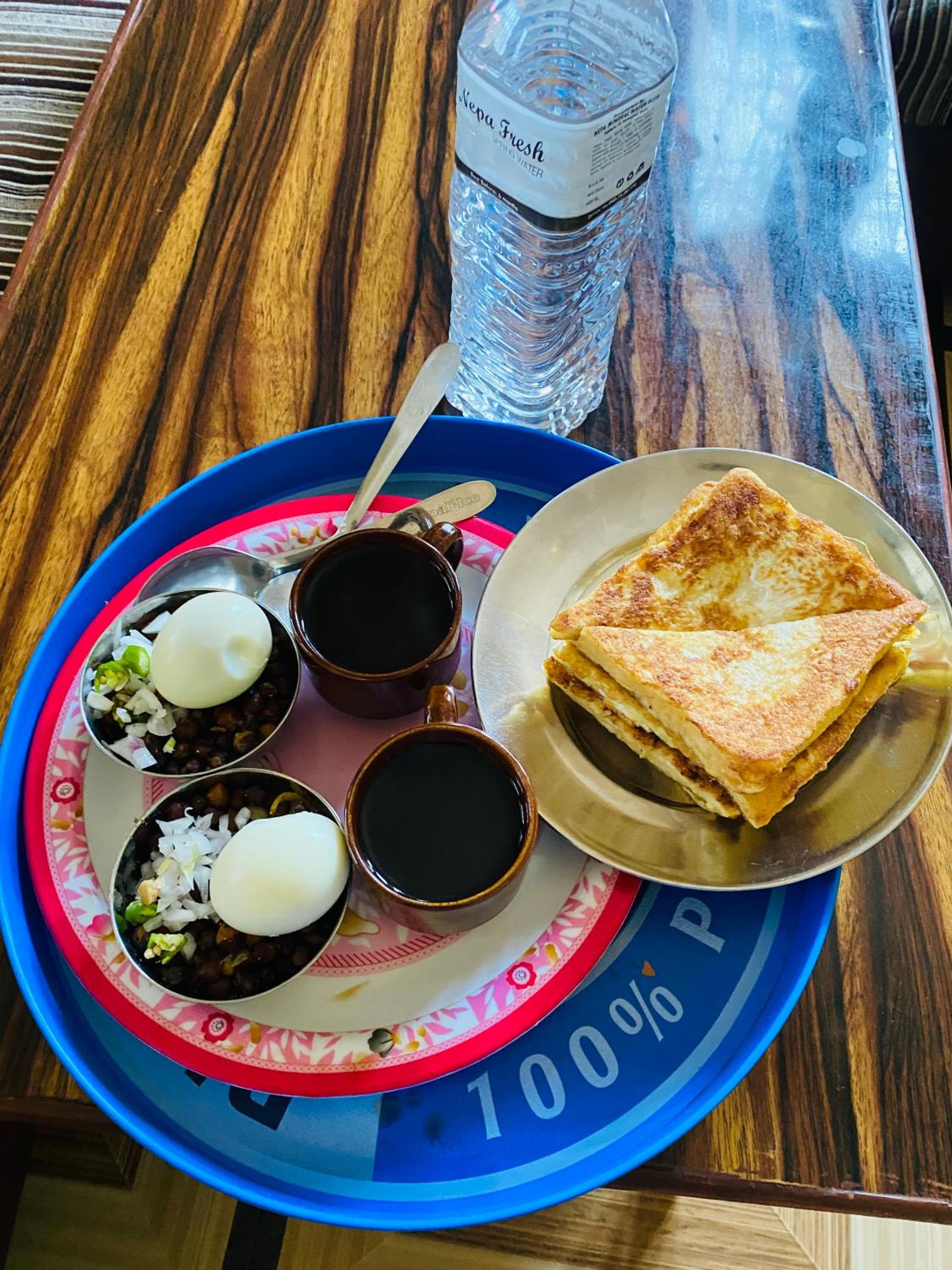 Вода платно. Завтрак тосты и омлет 250рупий, без кофе- это дорого, на мой взгляд. Маленькая комната и холодно было, пока не попросила плед.