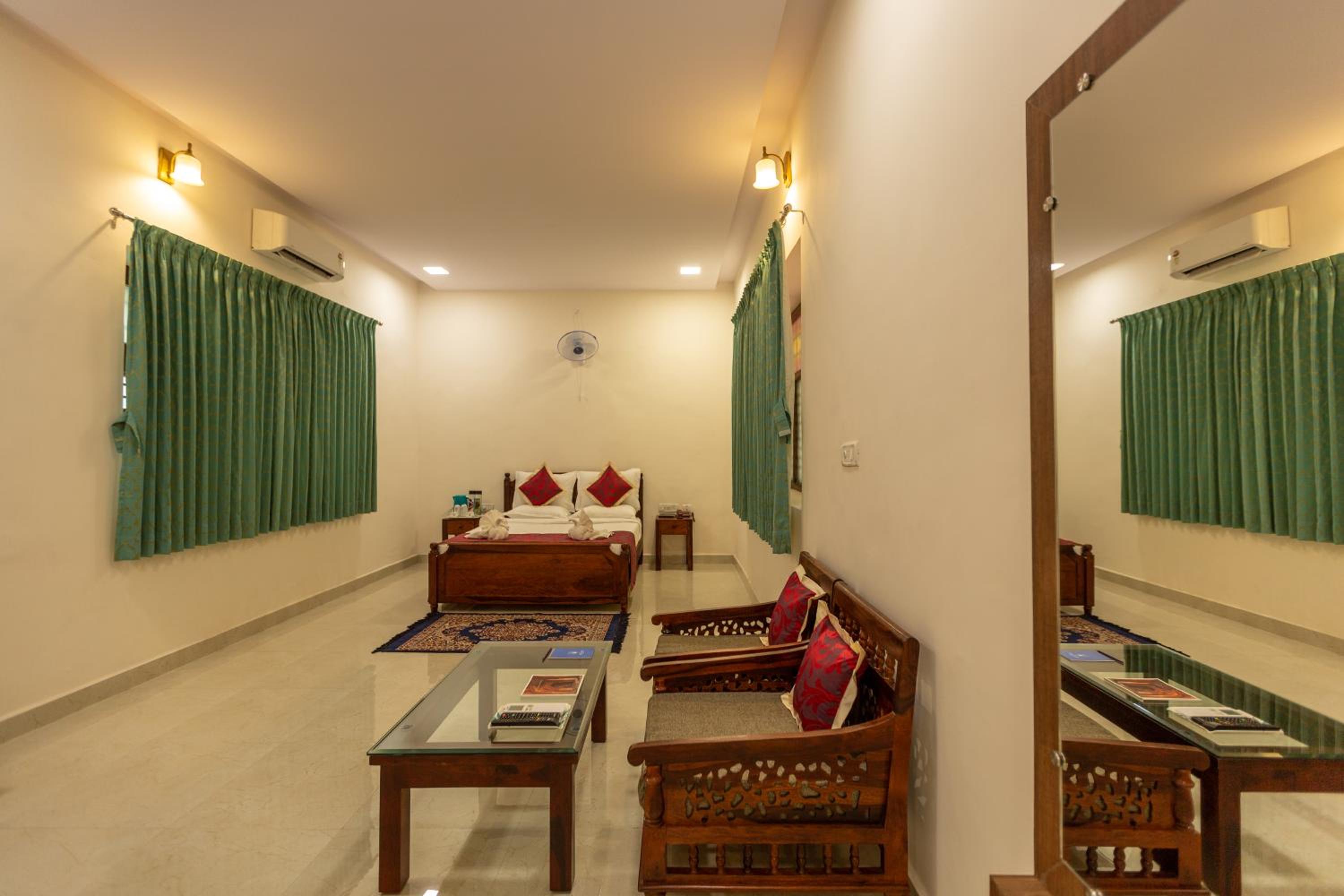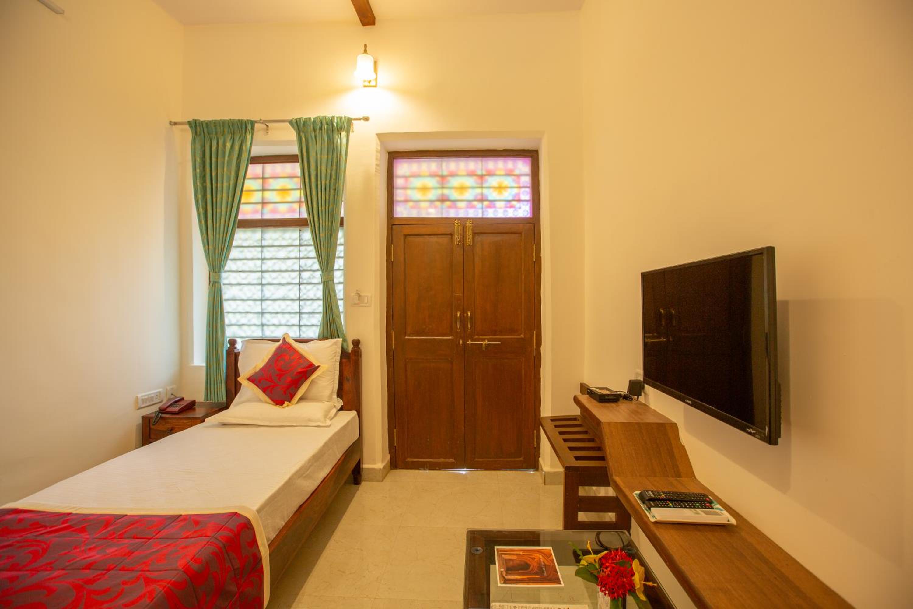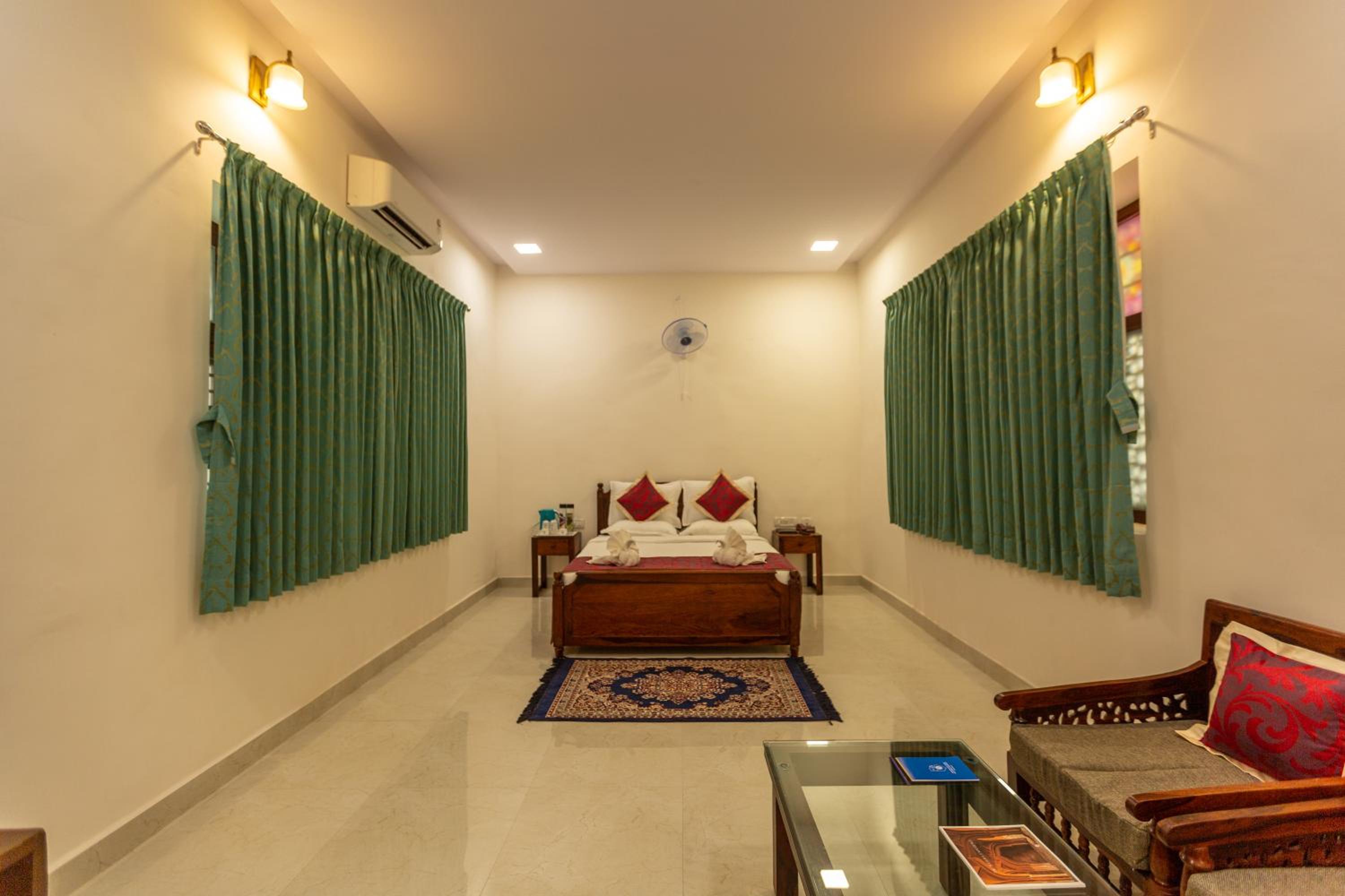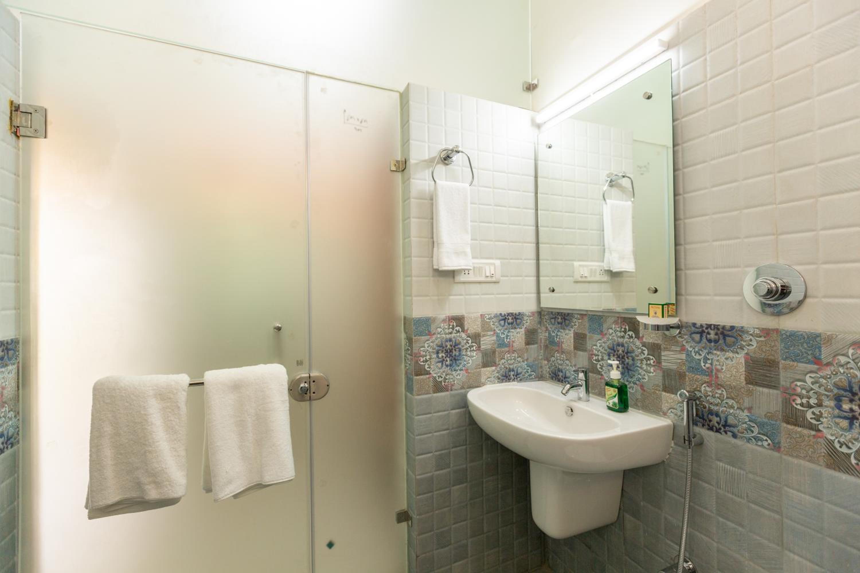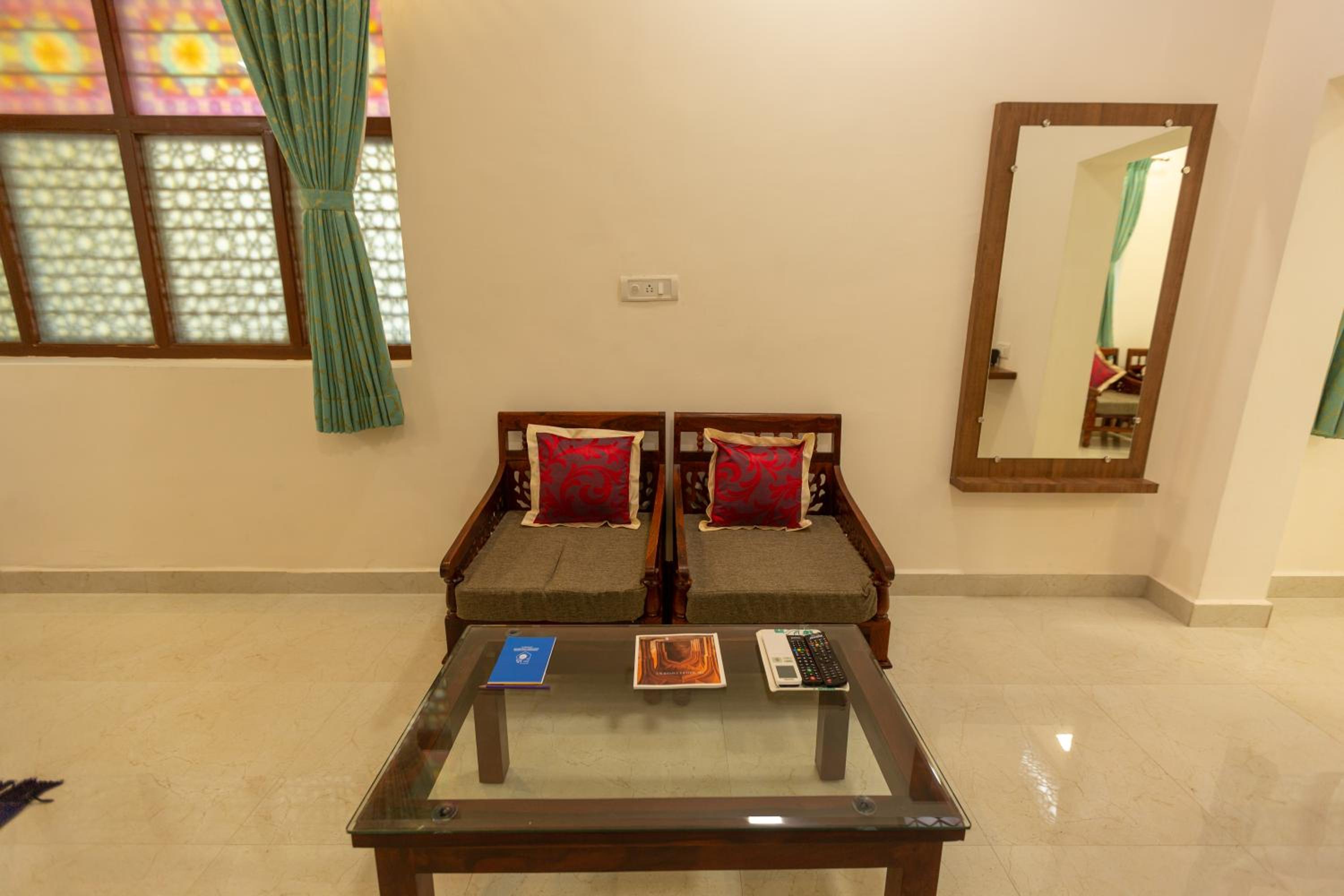 Old property, even rooms are old and cup board wardrobes were provided but were creaking ,strangely the washroom had a glass door but they should have provided a Plastic curtain,as The cupboard and wardrobe are bang in front of the door. Hot water it seems has to be asked for ,to switch it on. Property in good locality, spacious parking.Rooms are comparatively small and cluttered with seaters teapoy and other furniture.