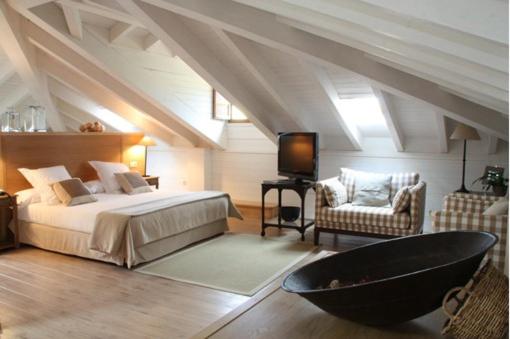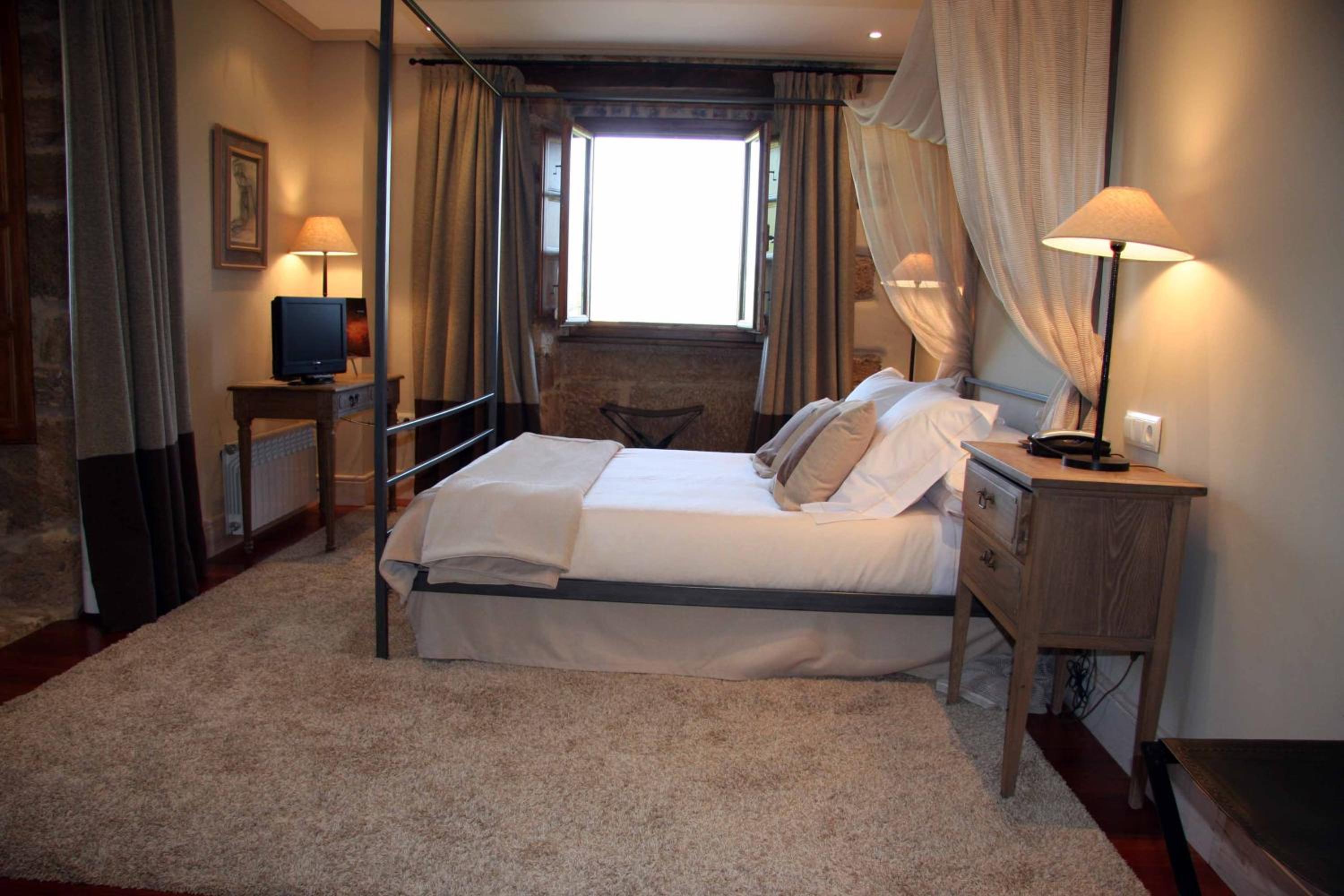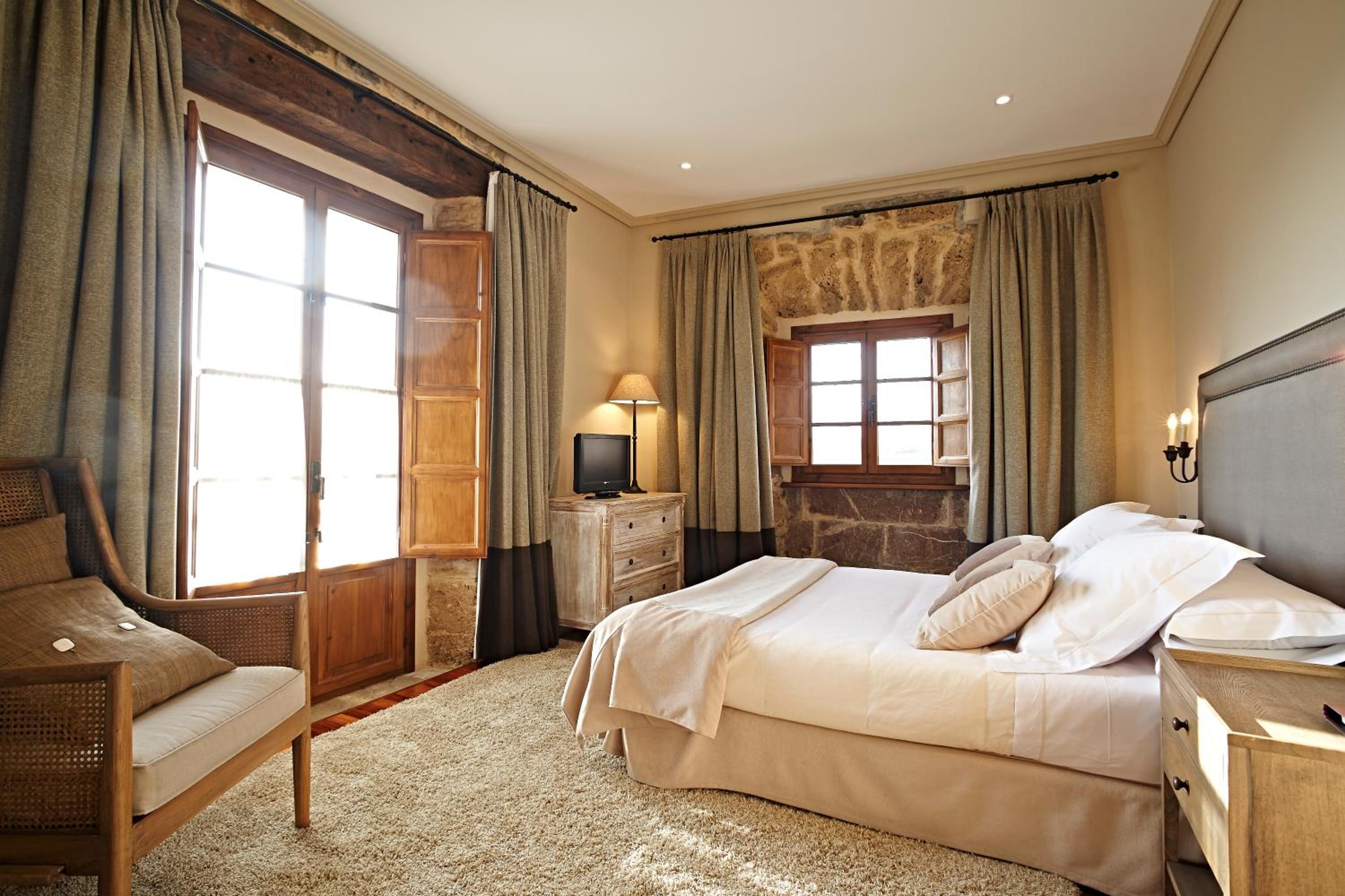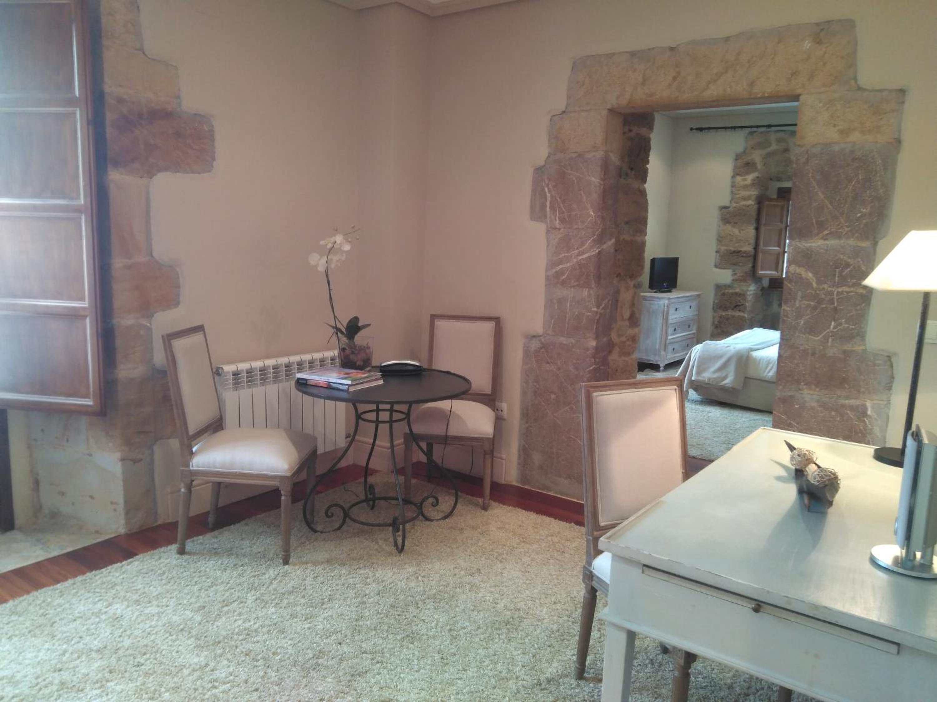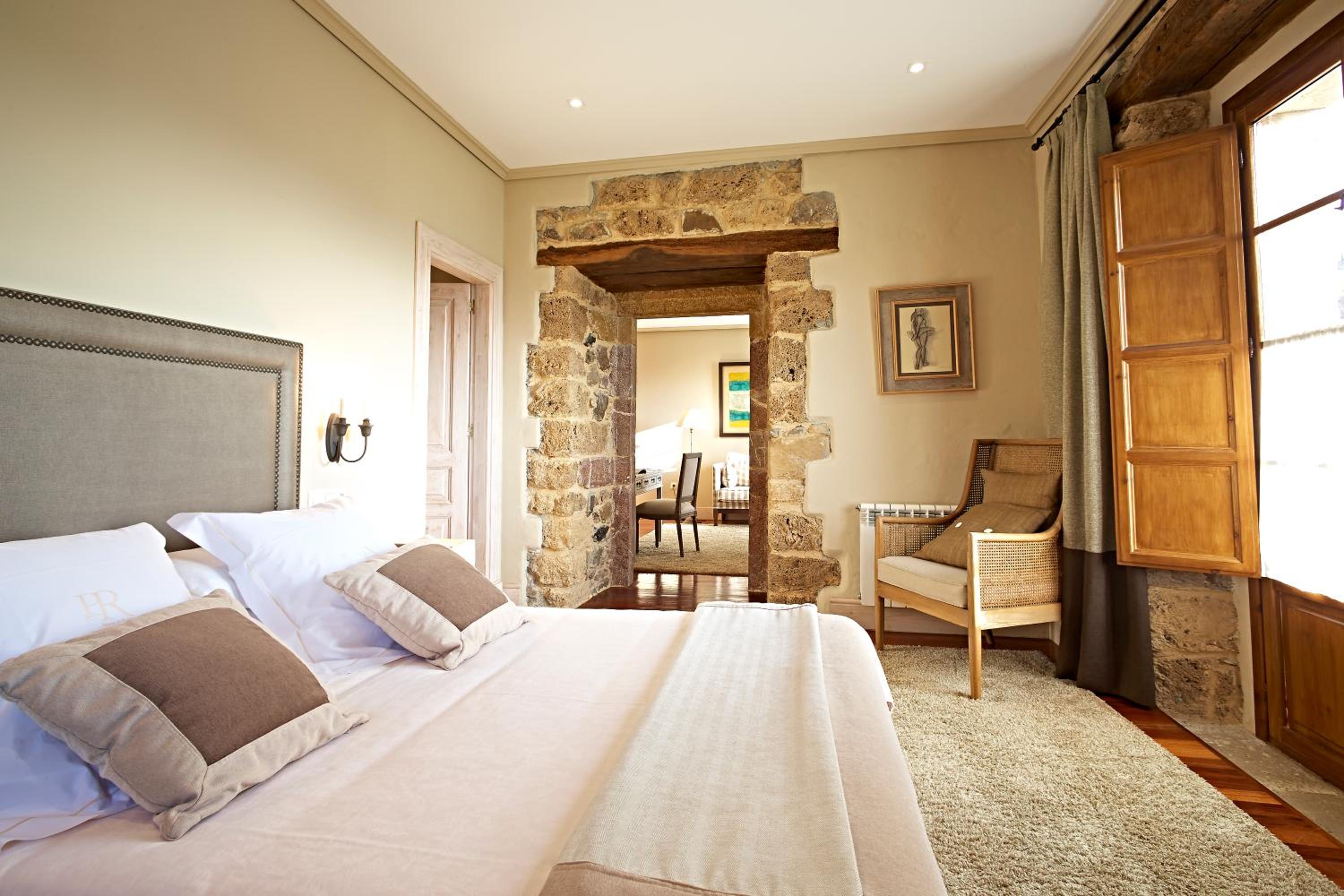 The Palacio de Rubianes boasts beamed ceilings, exposed stone walls, and archways, blending historic charm with modern amenities. Each room is elegantly decorated and equipped with a flat-screen TV and DVD player, with some offering skylight windows and picturesque countryside views.