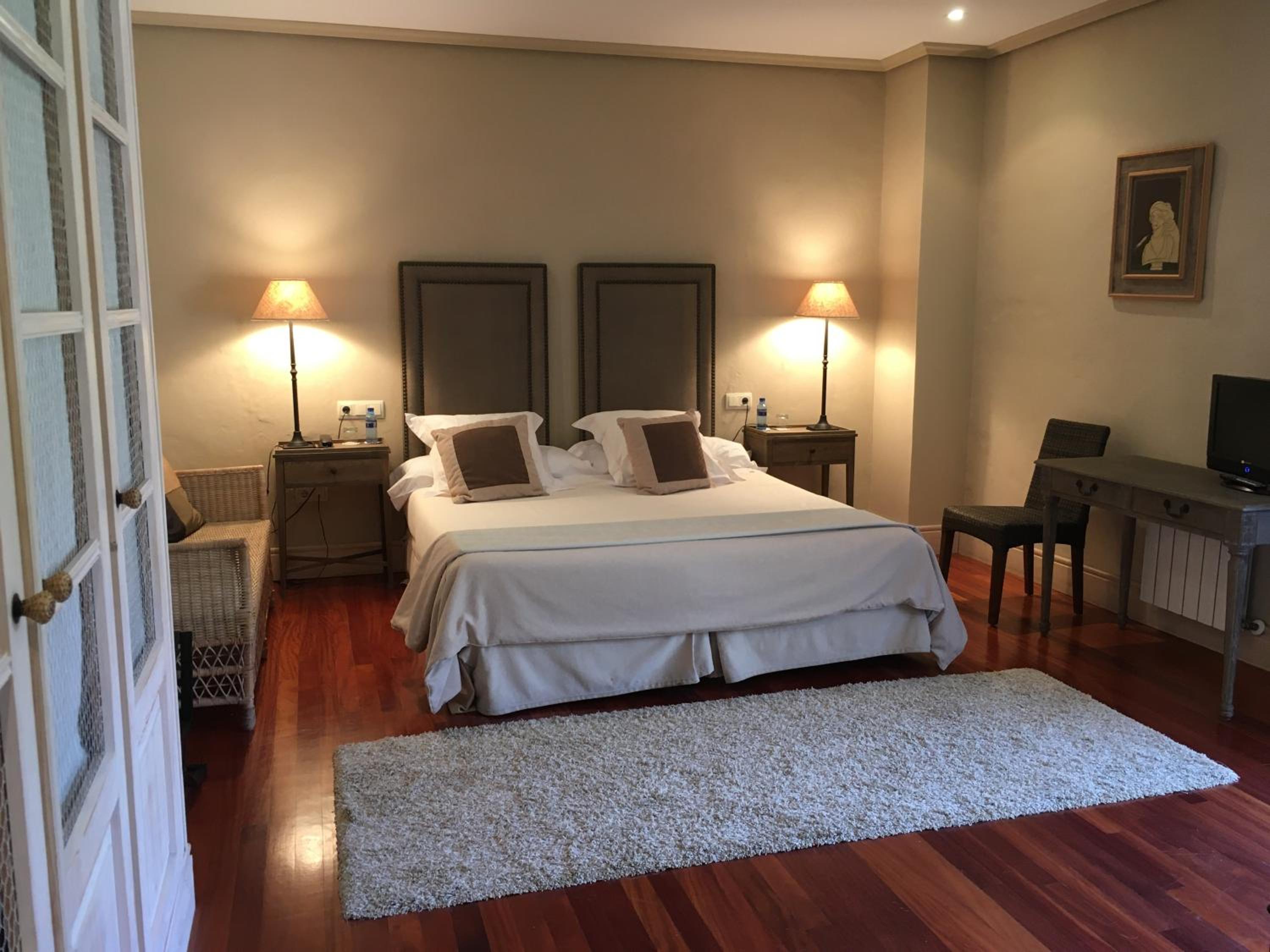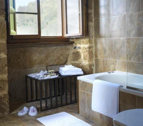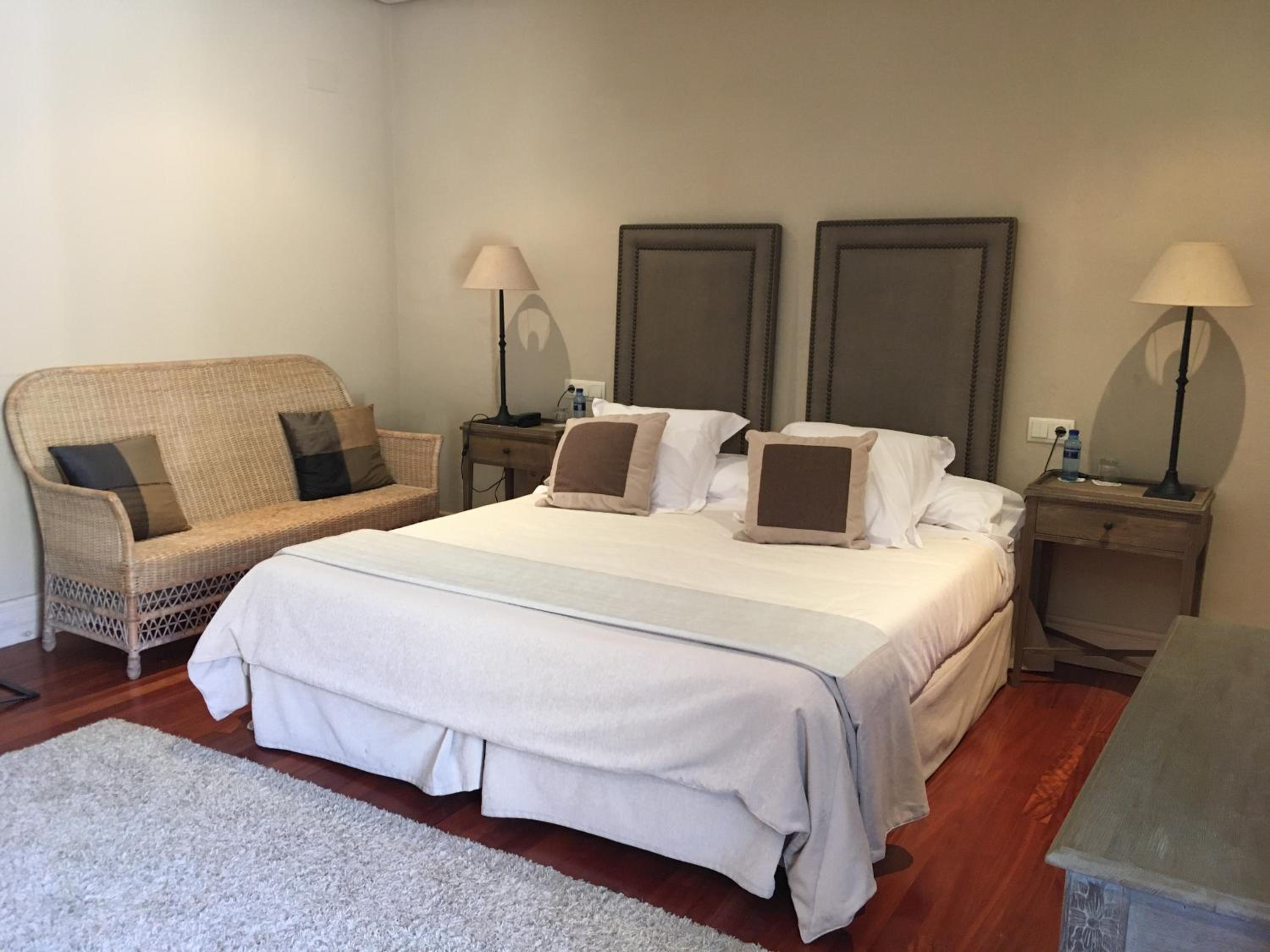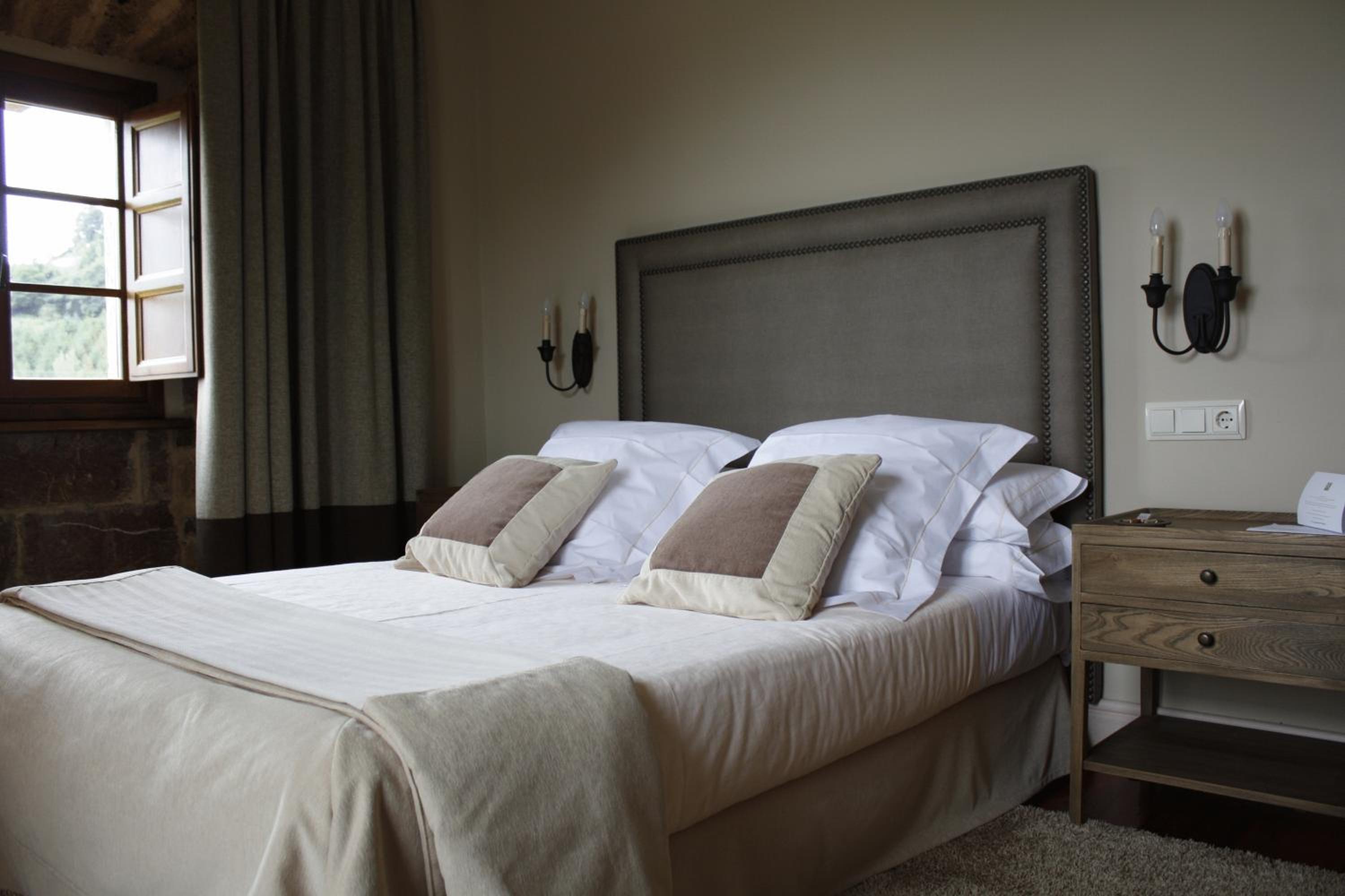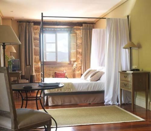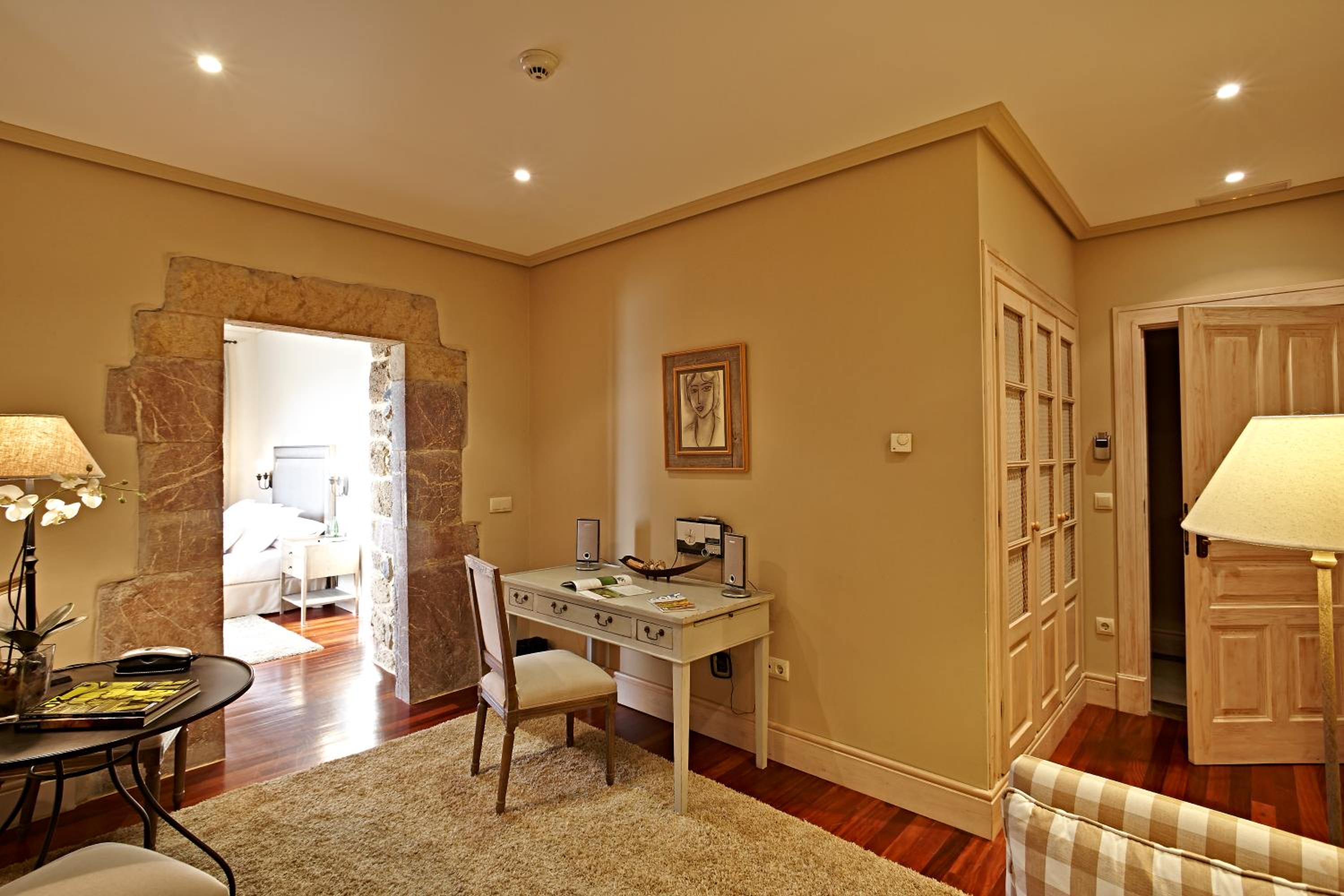 The Palacio de Rubianes boasts beamed ceilings, exposed stone walls, and archways, blending historic charm with modern amenities. Each room is elegantly decorated and equipped with a flat-screen TV and DVD player, with some offering skylight windows and picturesque countryside views.