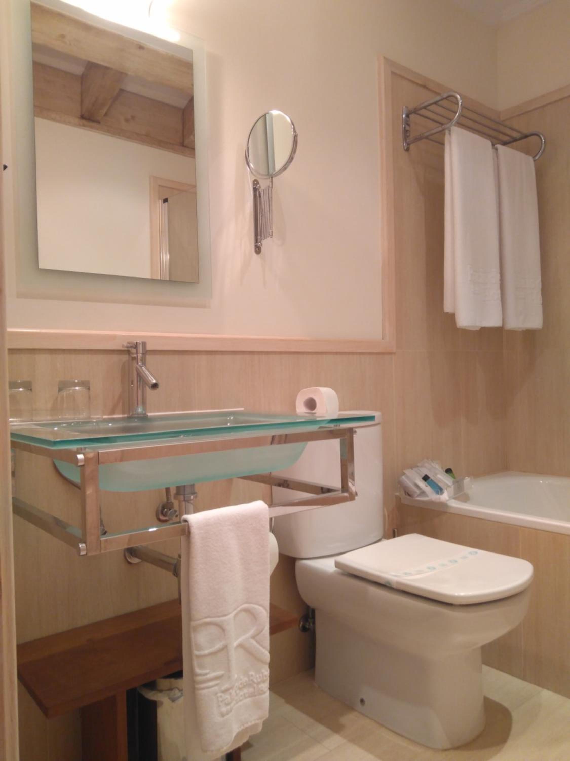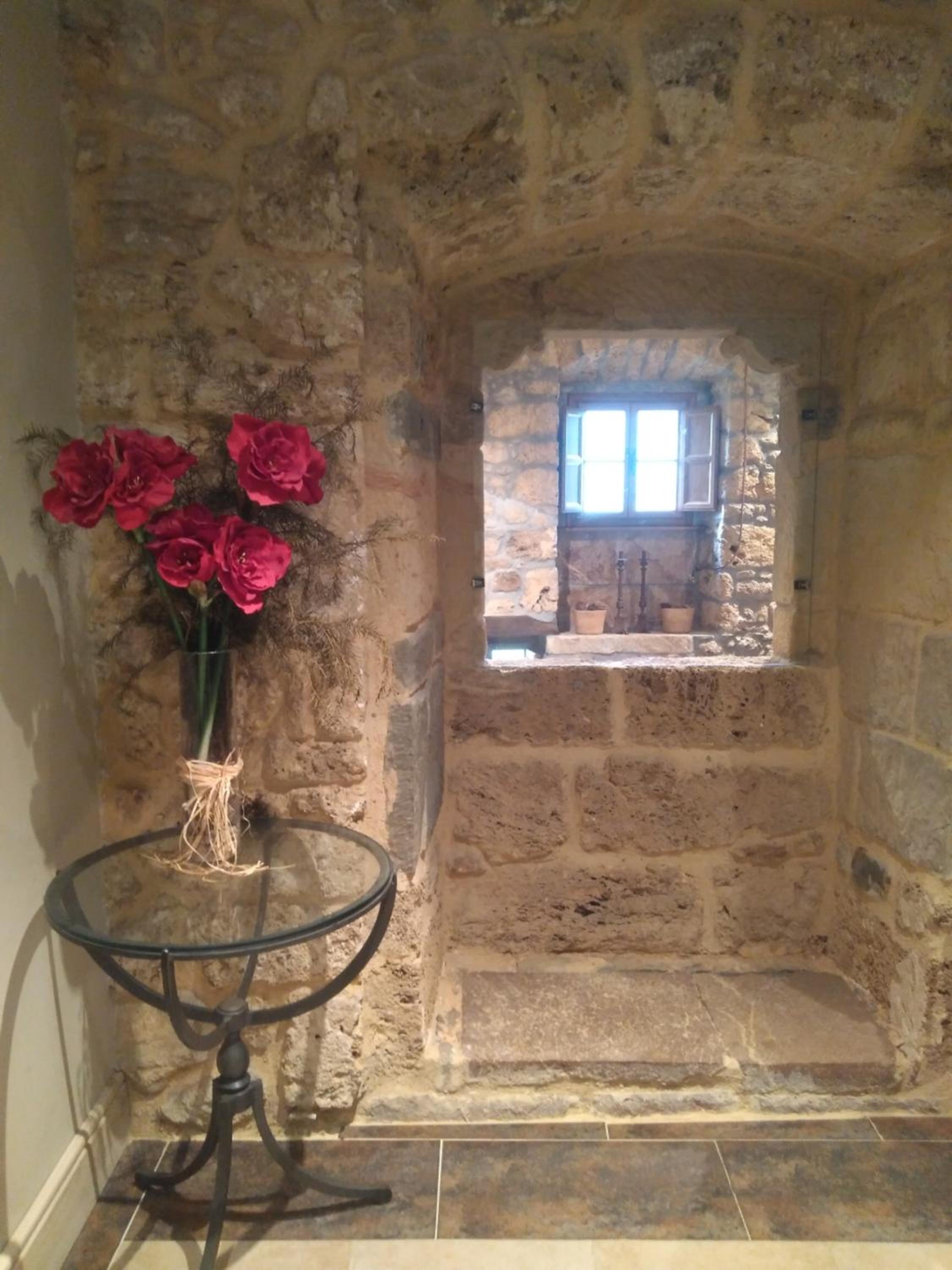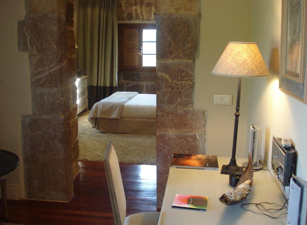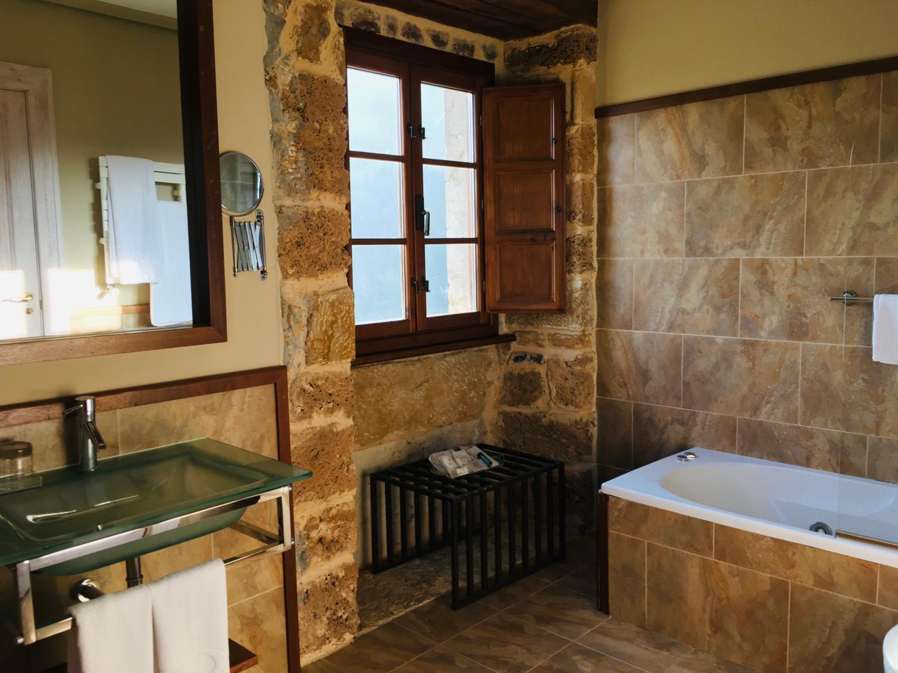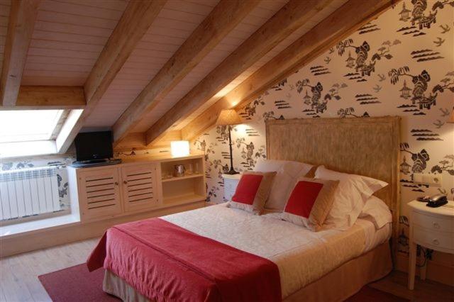 The Palacio de Rubianes boasts beamed ceilings, exposed stone walls, and archways, blending historic charm with modern amenities. Each room is elegantly decorated and equipped with a flat-screen TV and DVD player, with some offering skylight windows and picturesque countryside views.