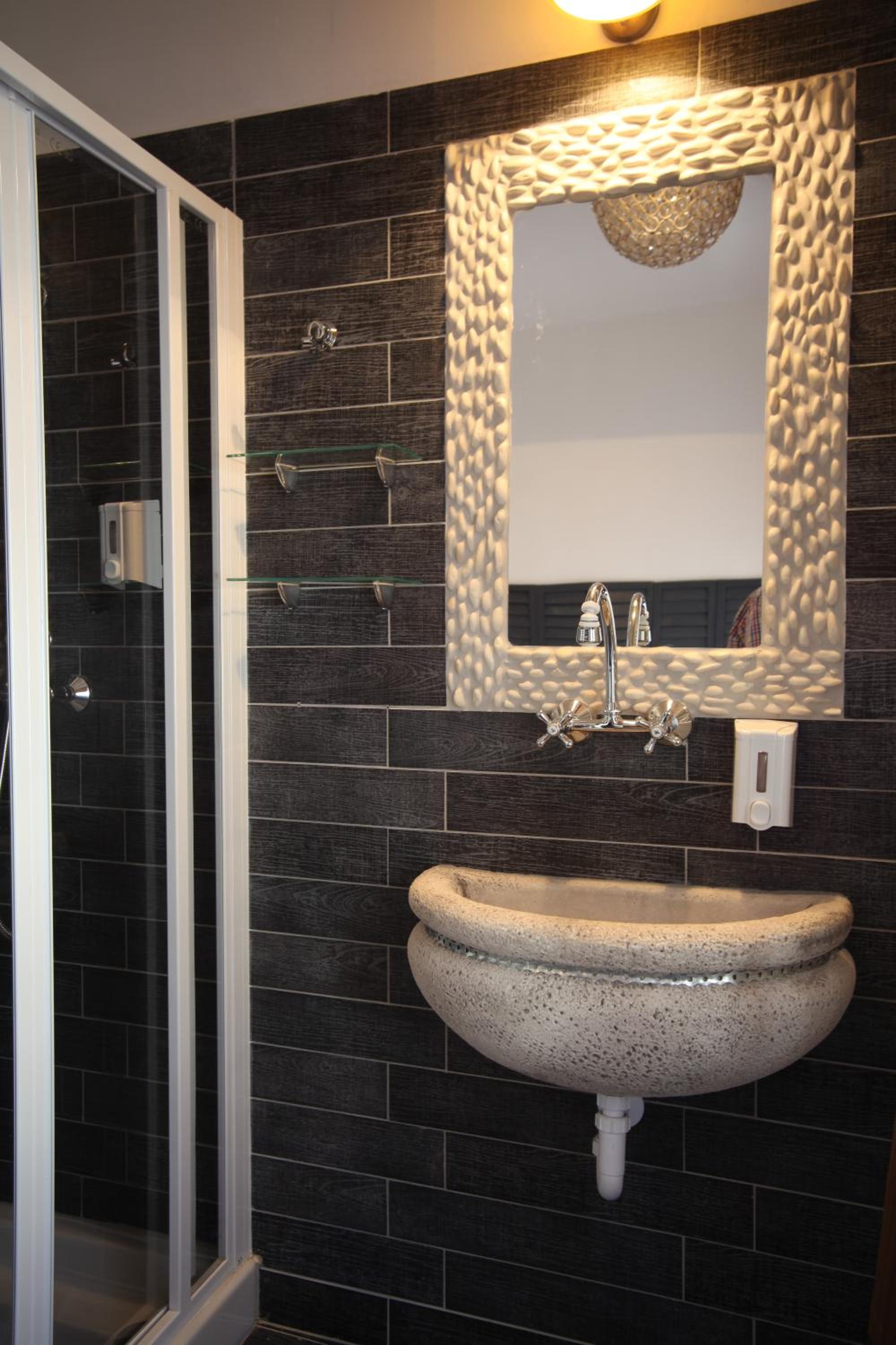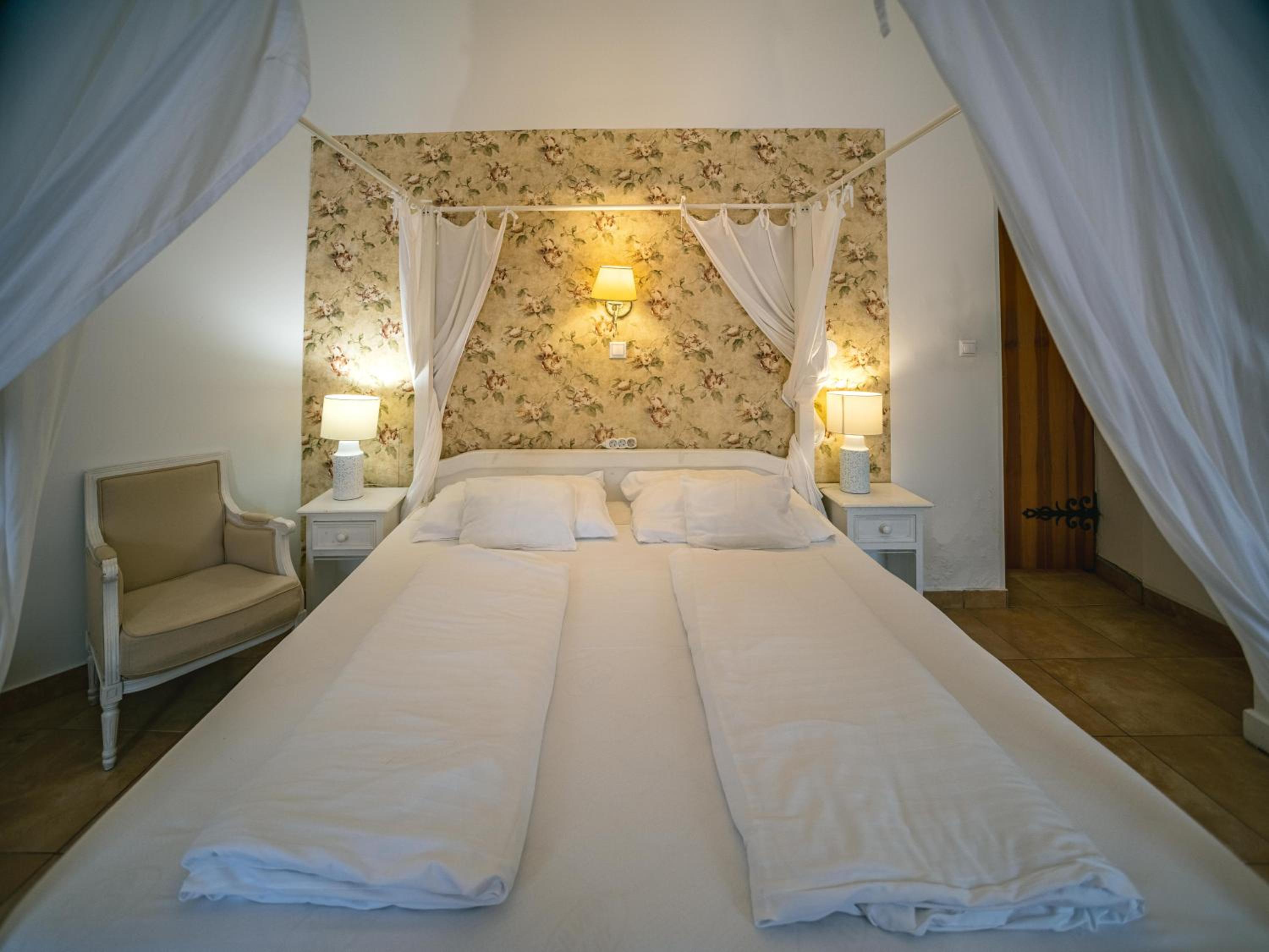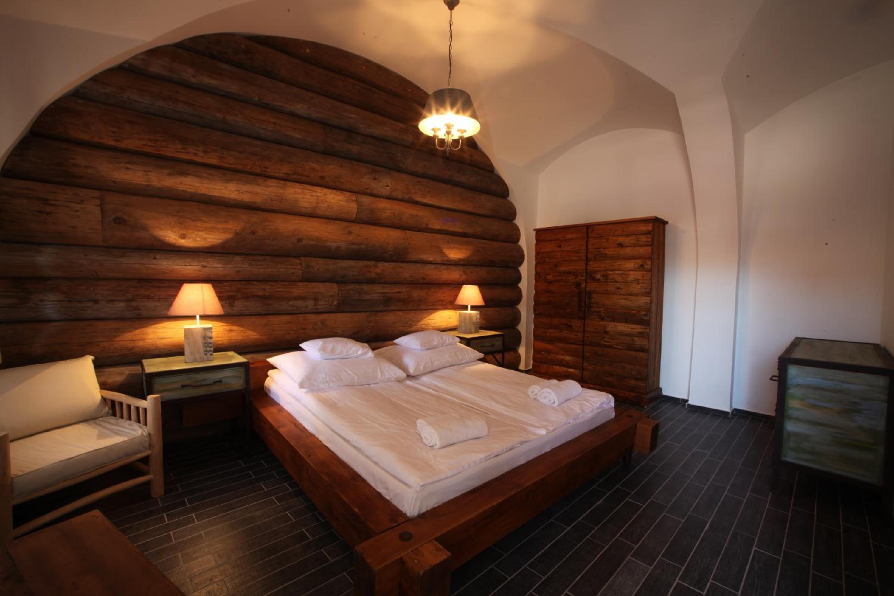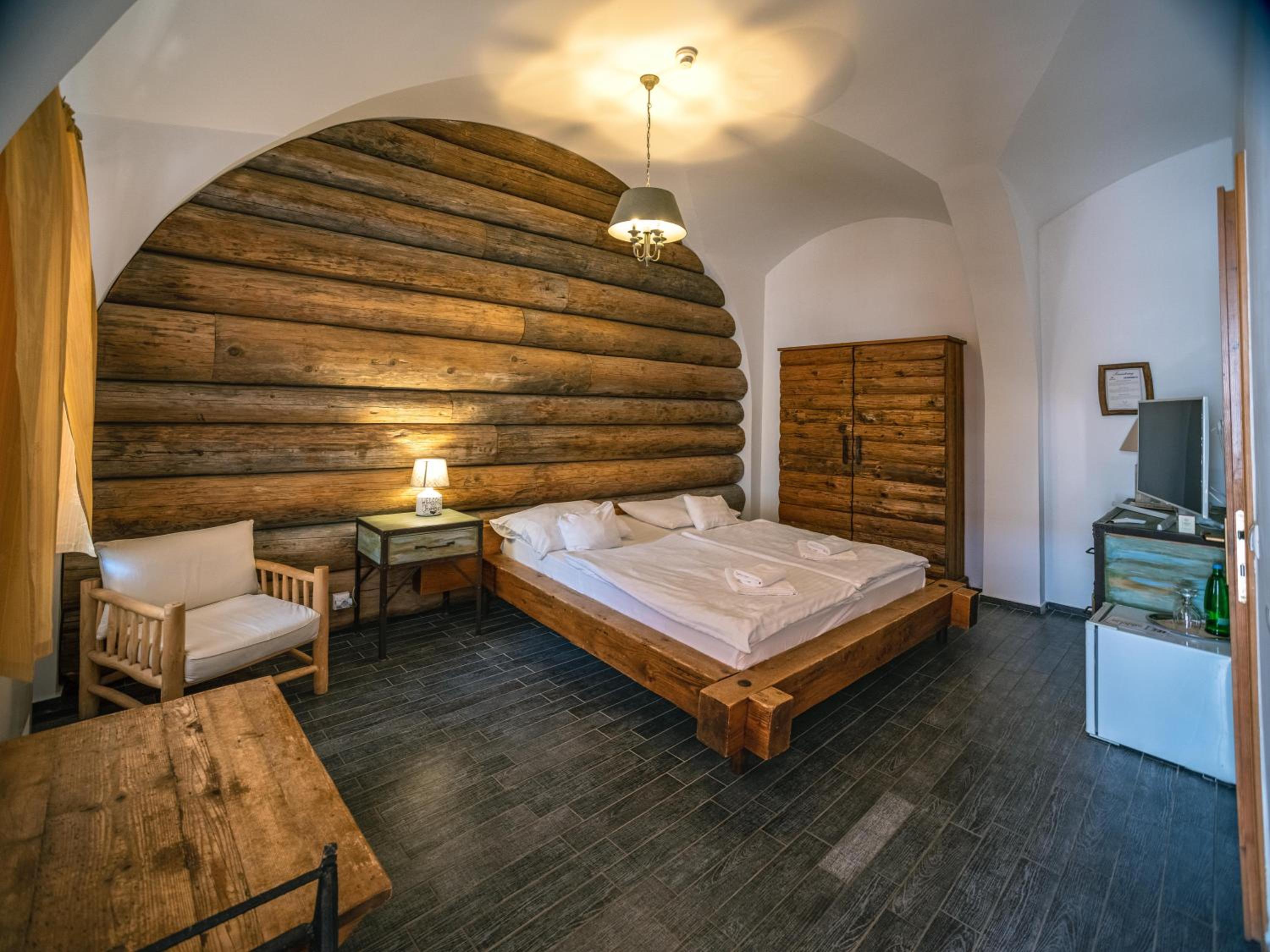 Individually decorated rooms feature natural wood and stone elements, with fun touches like beds made from old western wagons. Each room includes a private bathroom, TV, and a balcony or terrace overlooking the garden.