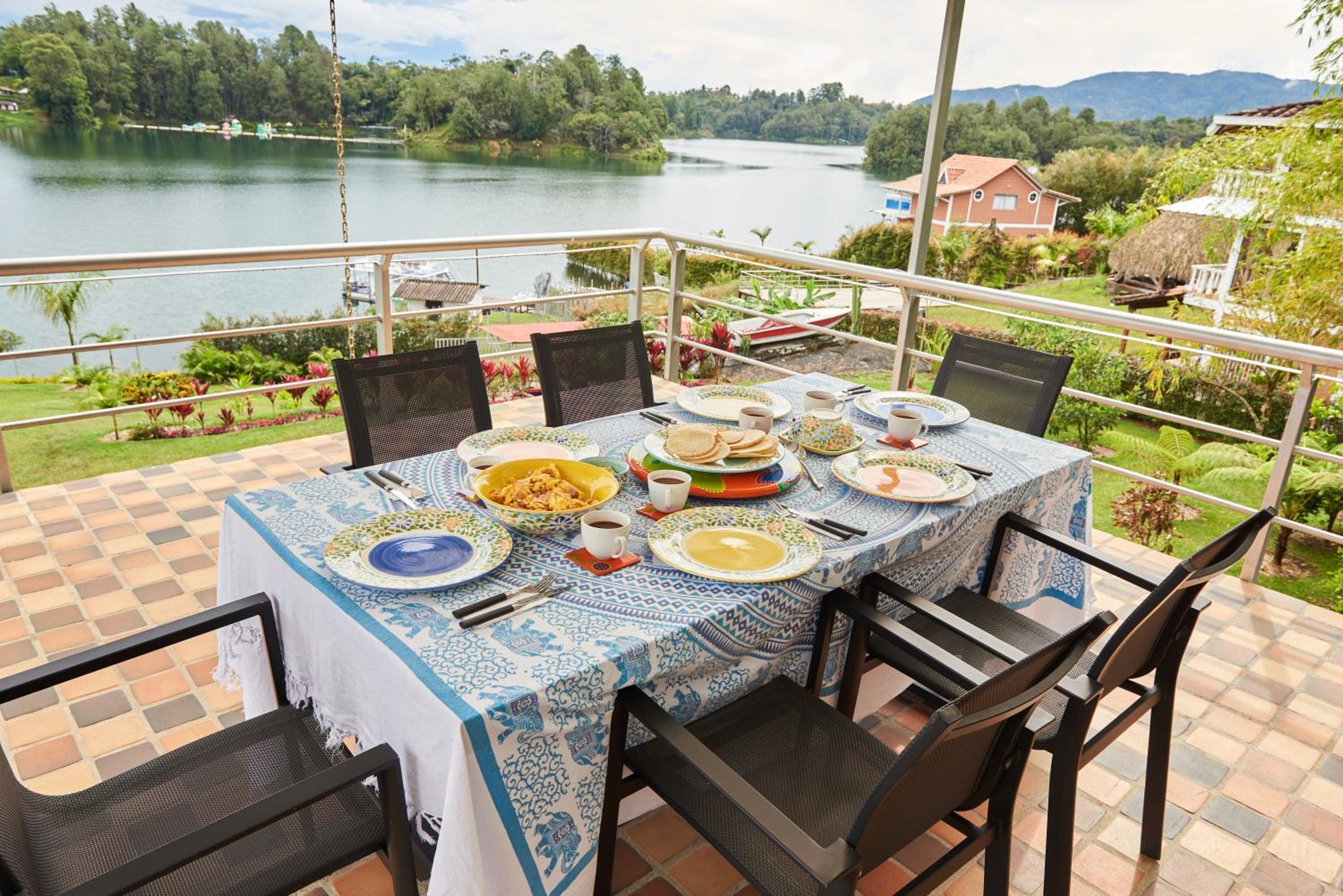 The hotel is on the water with really a really nice view. We saw some interesting birdlife too. The staff are very friendly and the house is clean and comfortable. The shower was great! The location is excellent, just under the rock, and it is really easy to get into Guatape by tuk tuk.