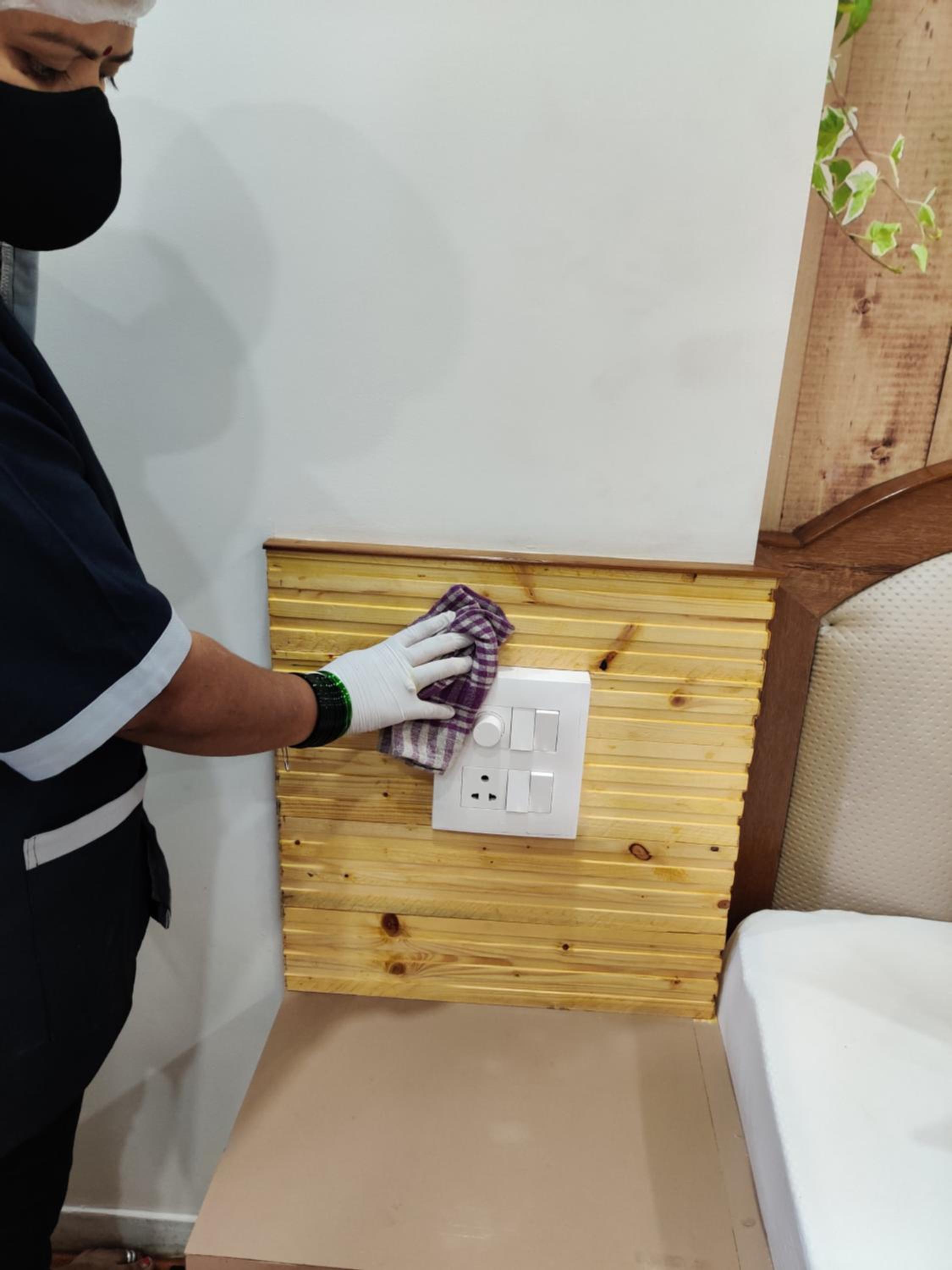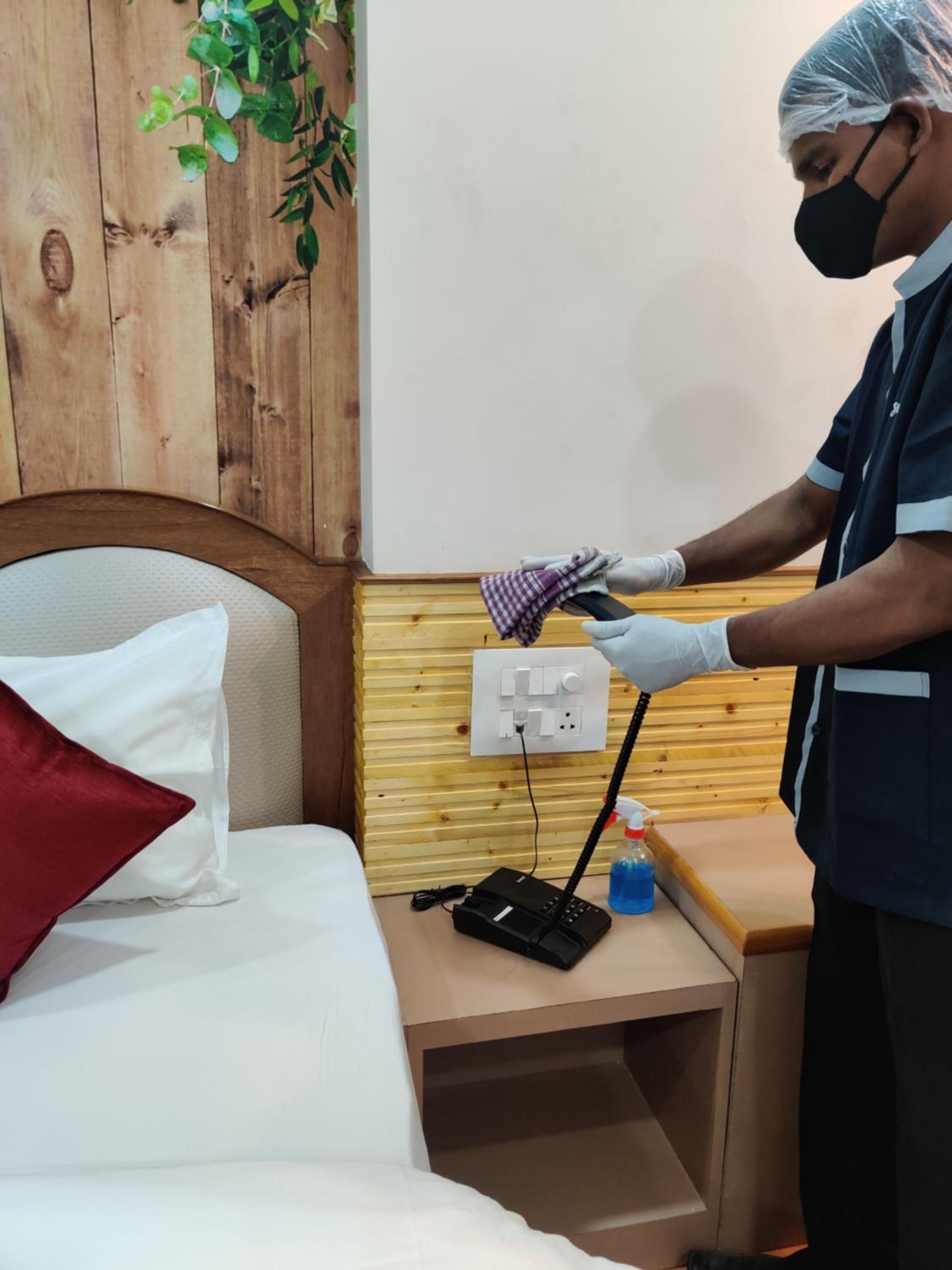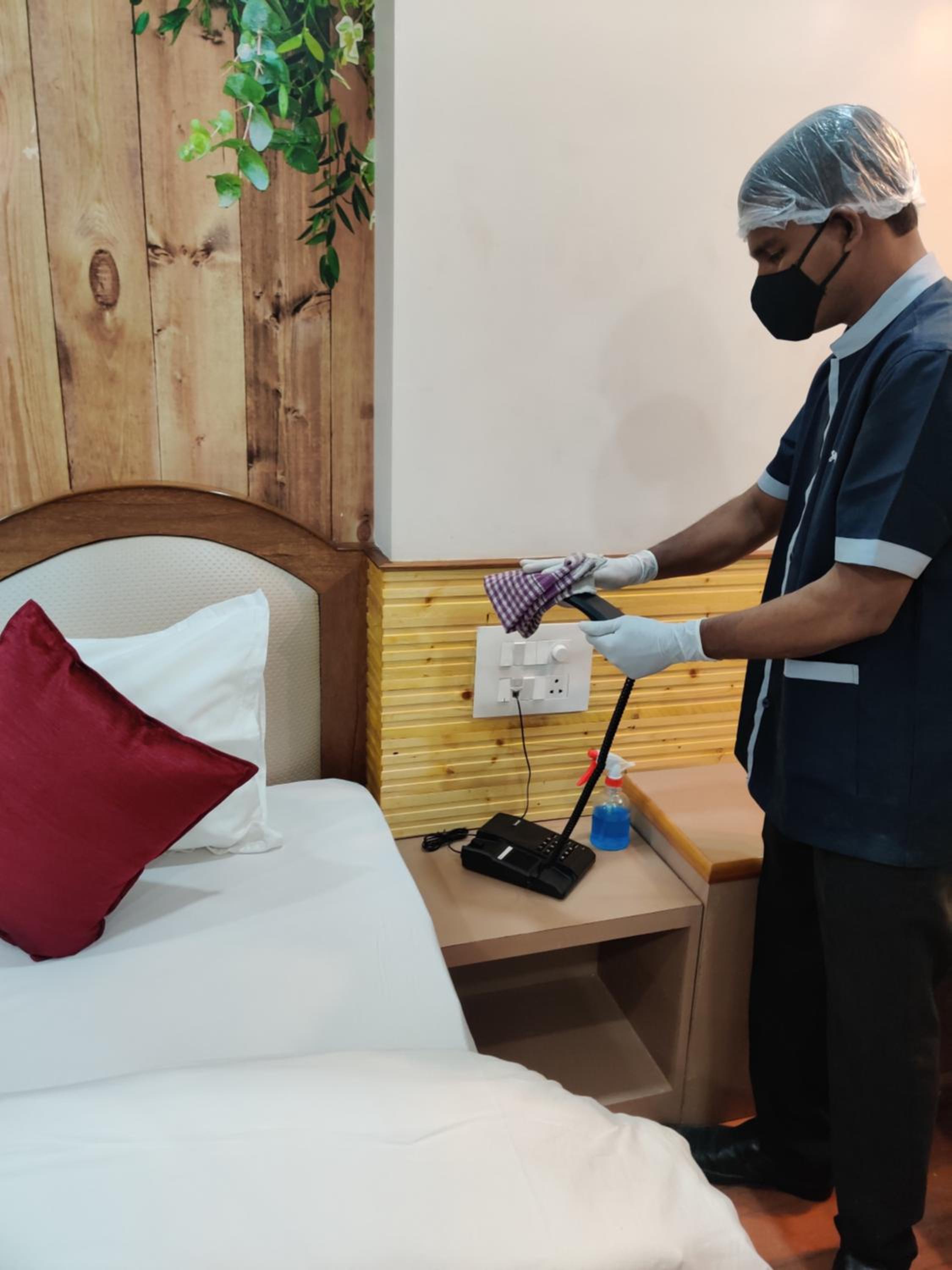 Hotel room and staff.