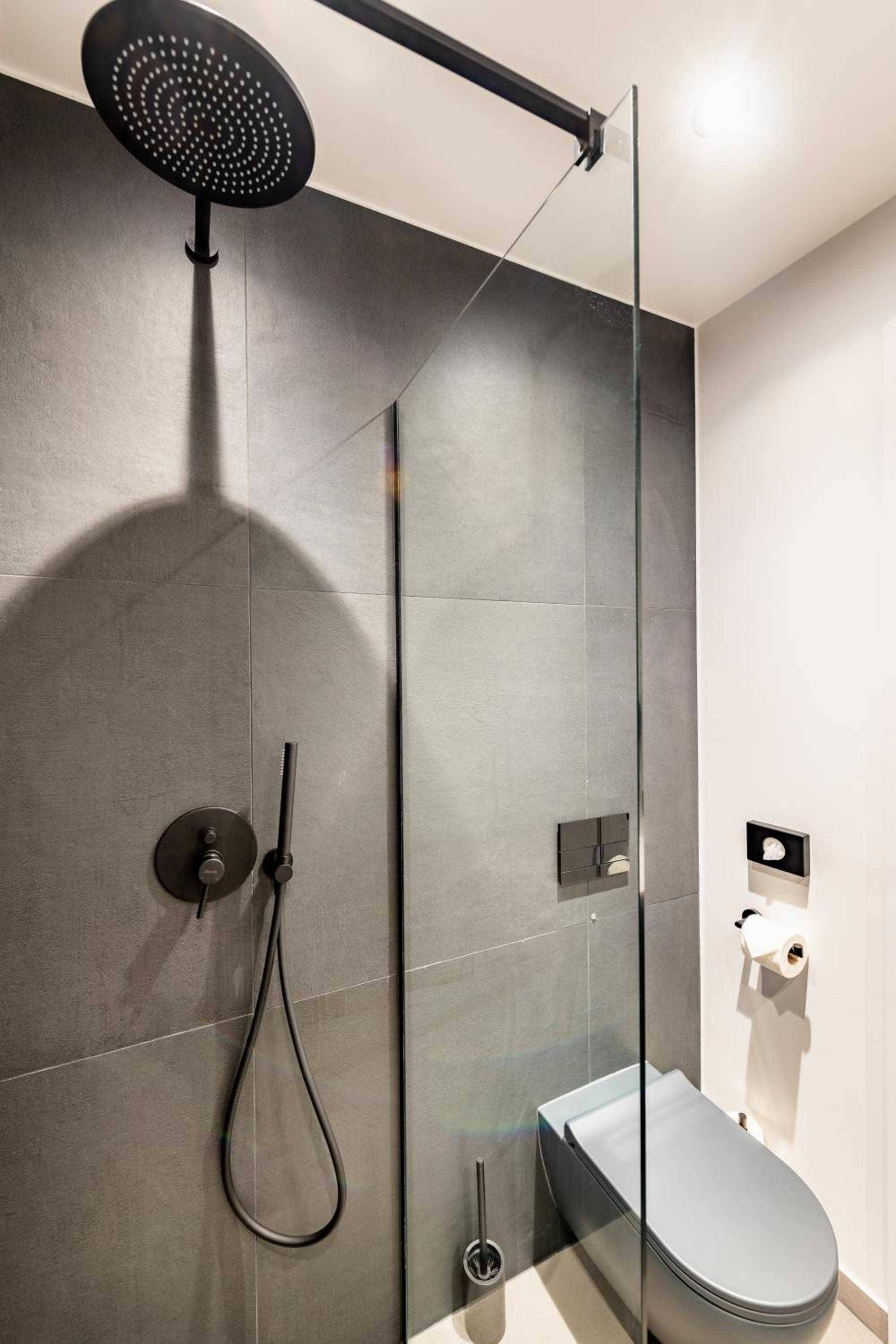 Shower flooded the bathroom, because it has no door and bad drainage.