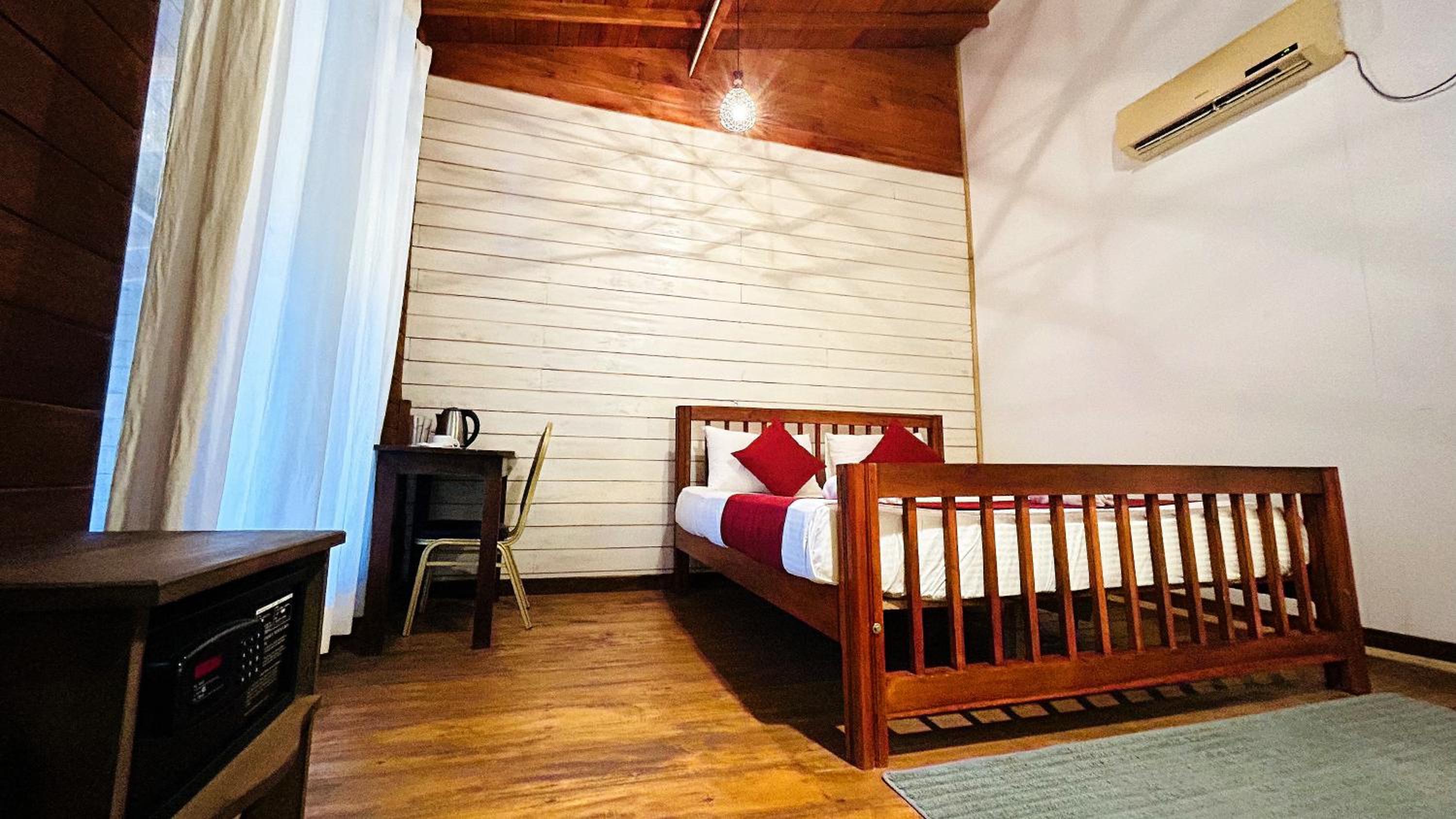 Each room at Wood Lodge Mirissa is thoughtfully designed, featuring a private balcony with garden or mountain views. The rooms are equipped with modern amenities including a desk, cozy bedding, and a seating area for relaxation.