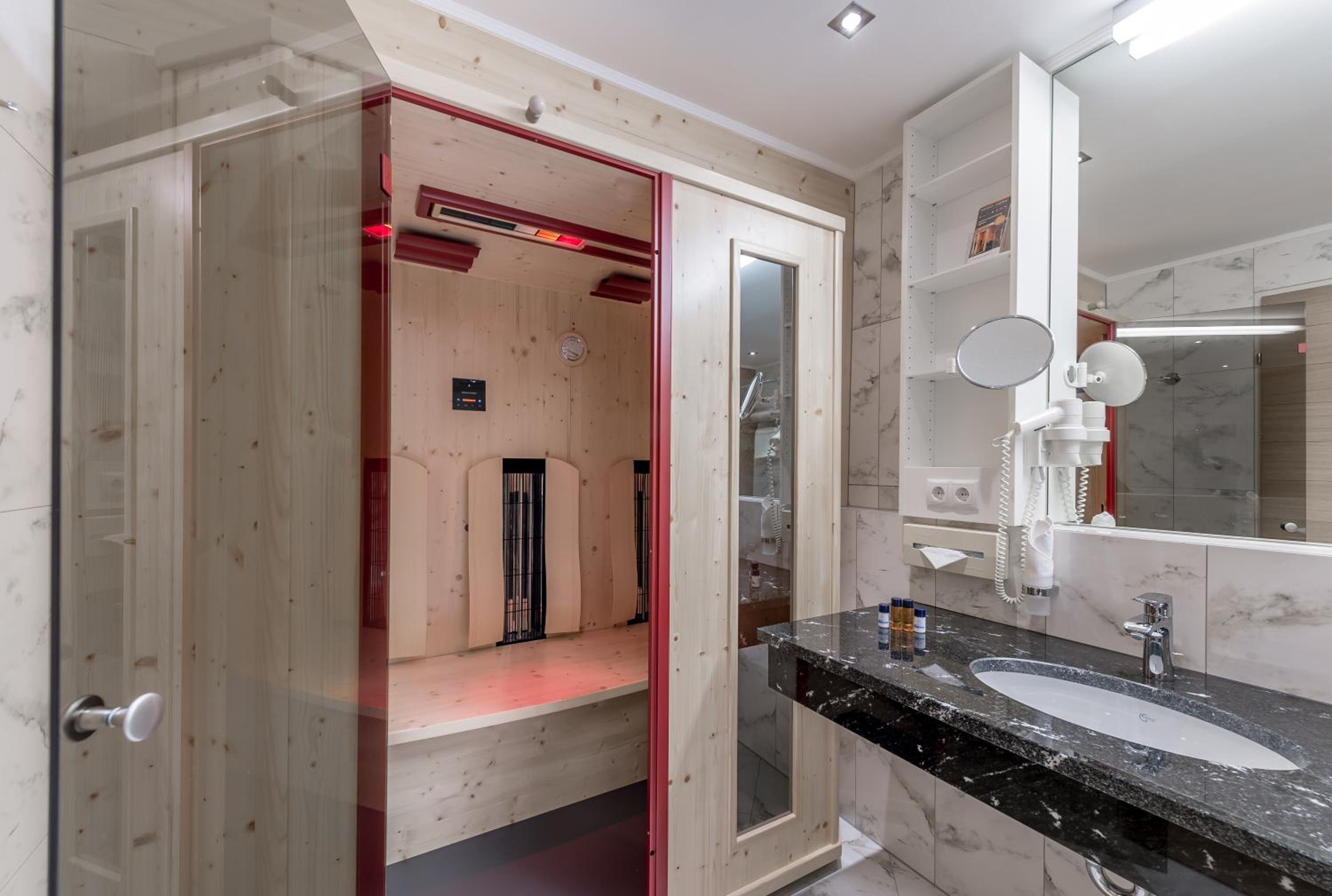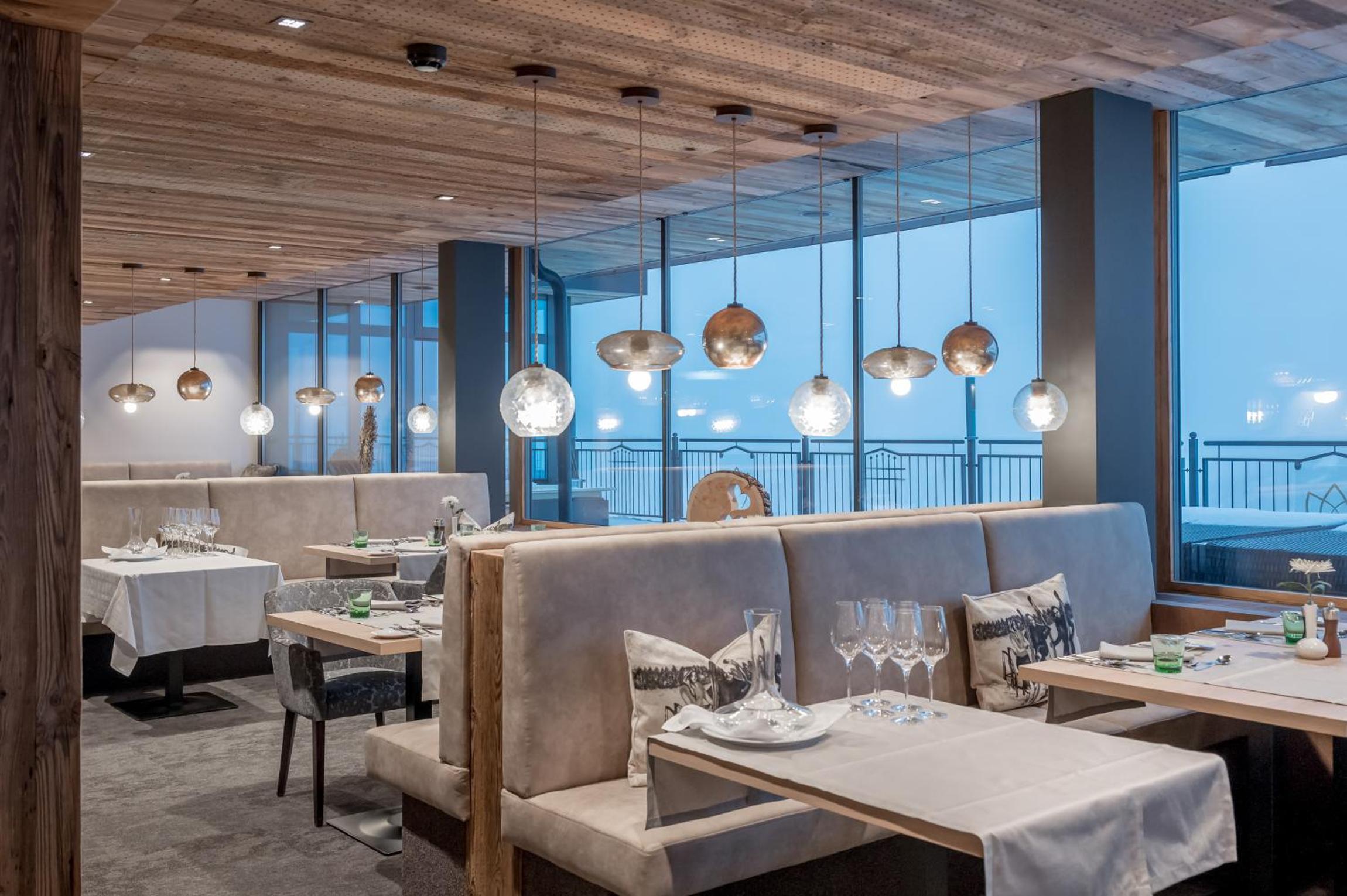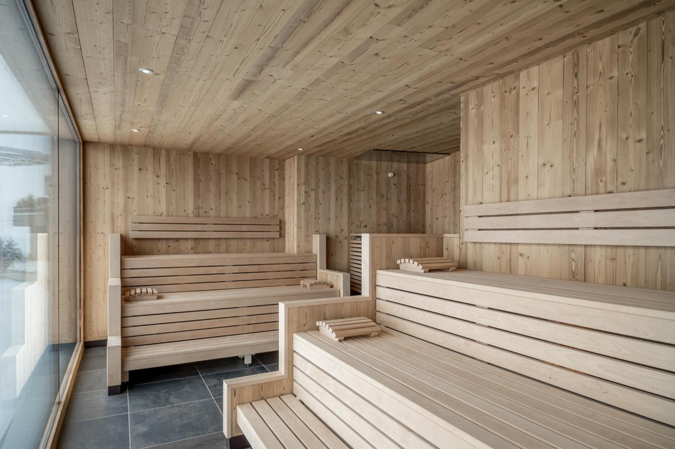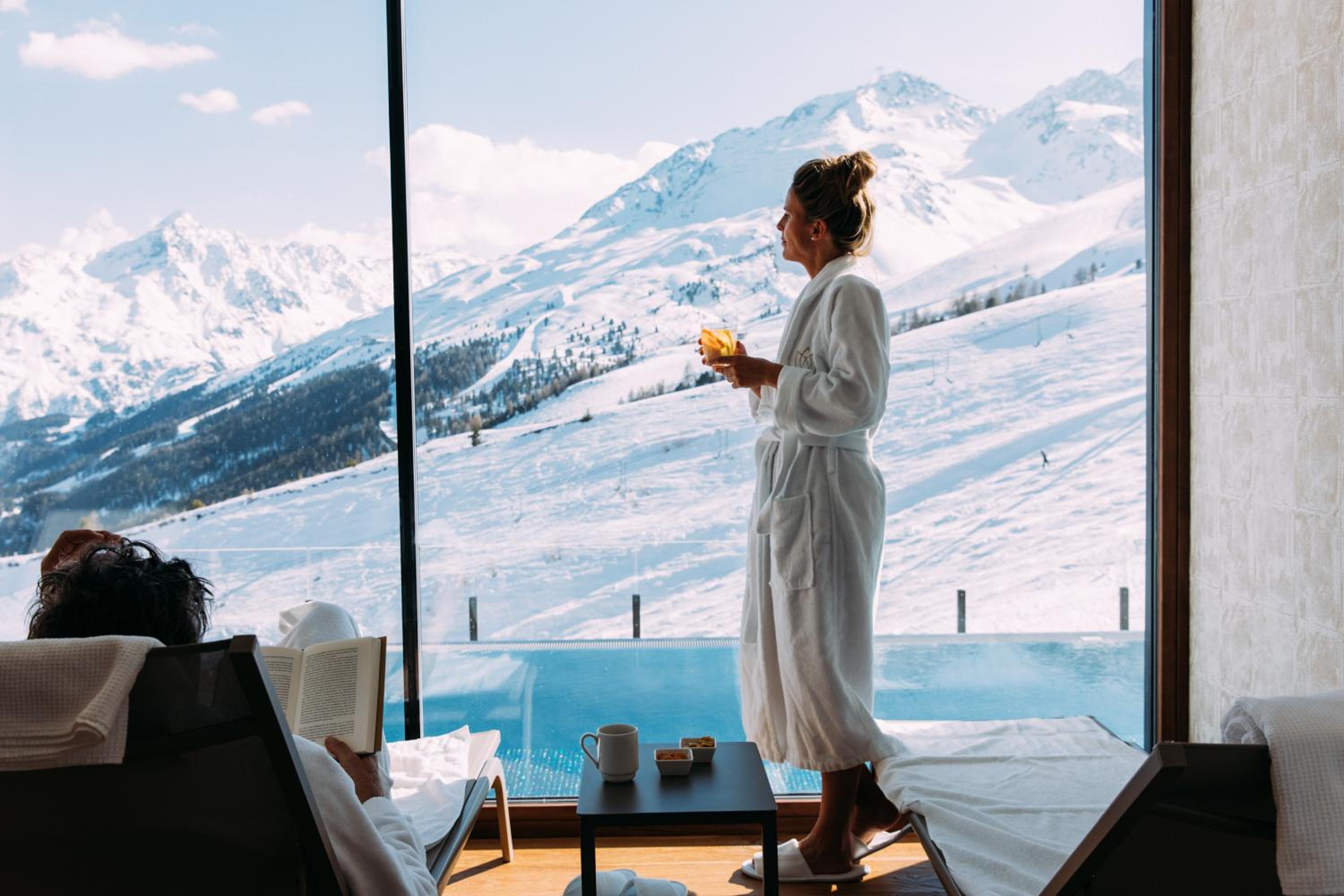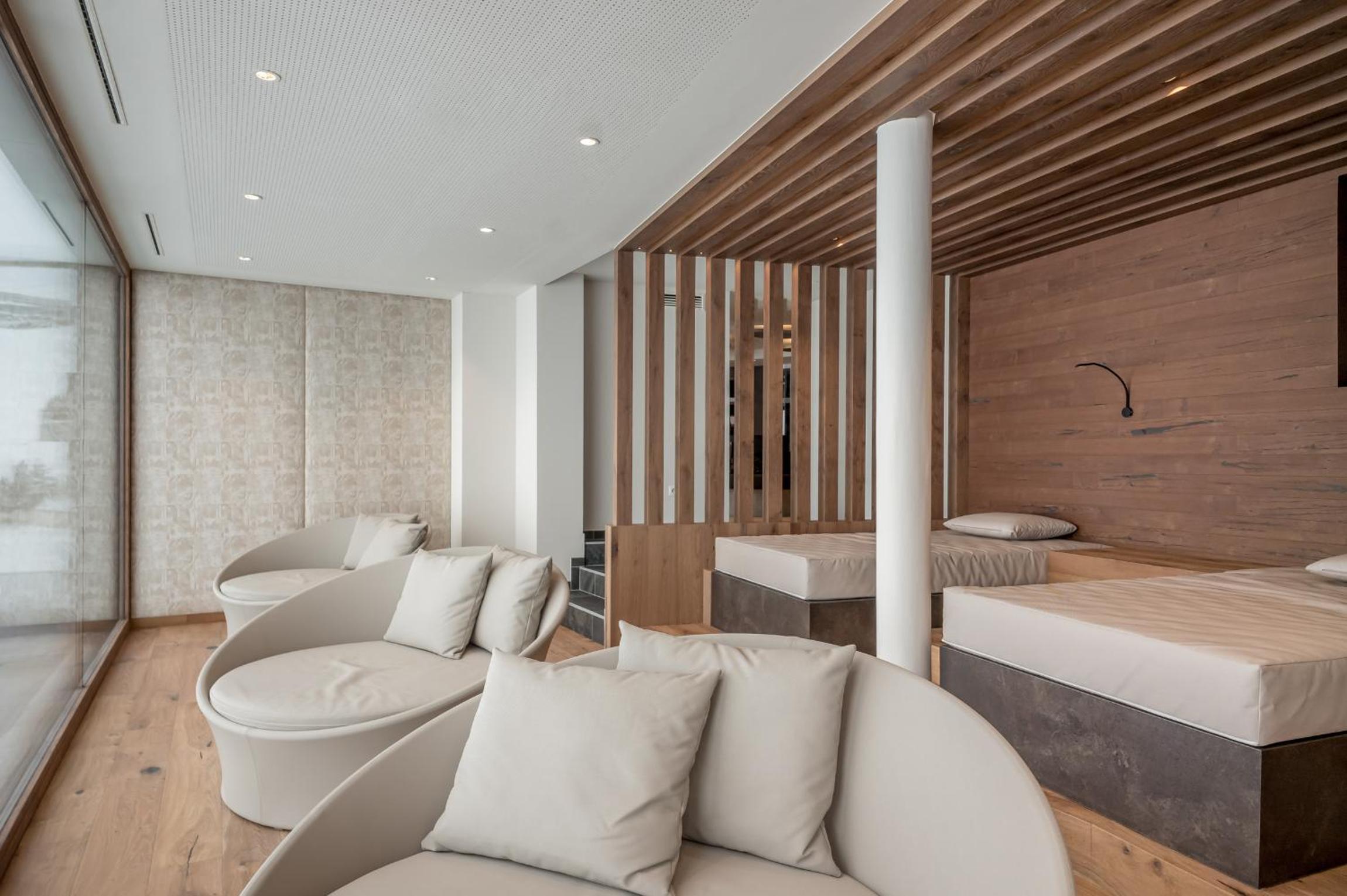 Indulge in pure relaxation at the 1,500 m² spa area with indoor and outdoor pools, saunas, infrared cabin, steam room, and tranquil relaxation areas. Rejuvenate your body and mind at this mountain oasis.