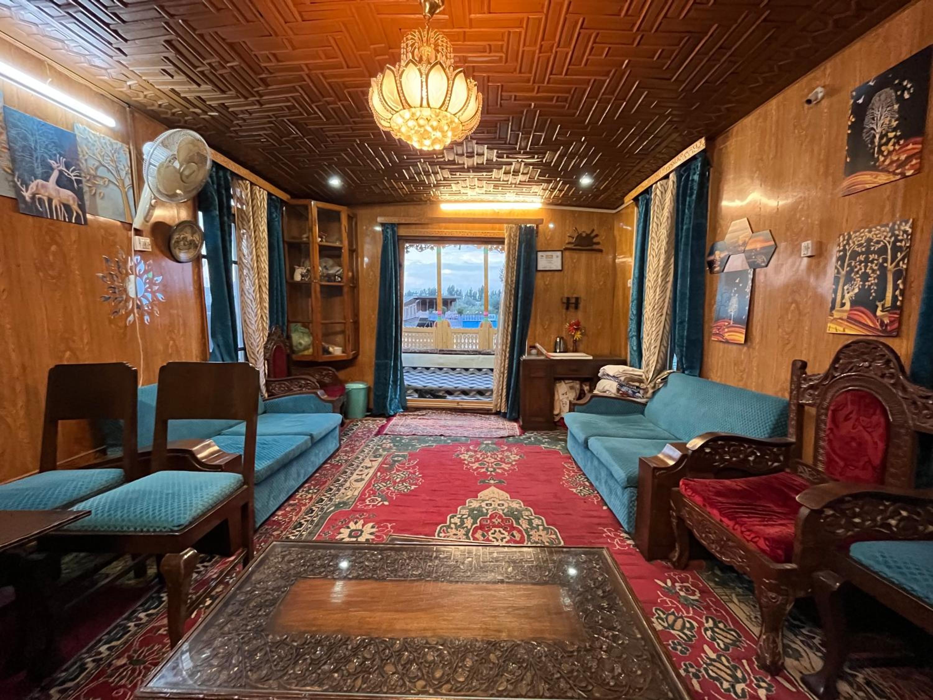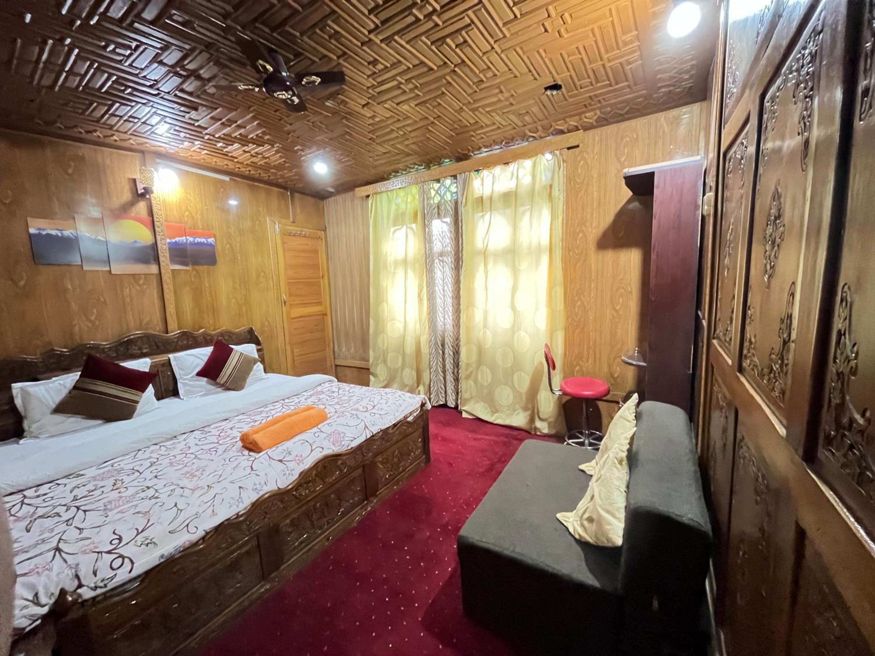 Experience a unique stay at New Silver Jubilee Heritage Group Of Houseboats in Srinagar, offering beautifully decorated rooms with modern amenities including a kitchen and private bathroom.