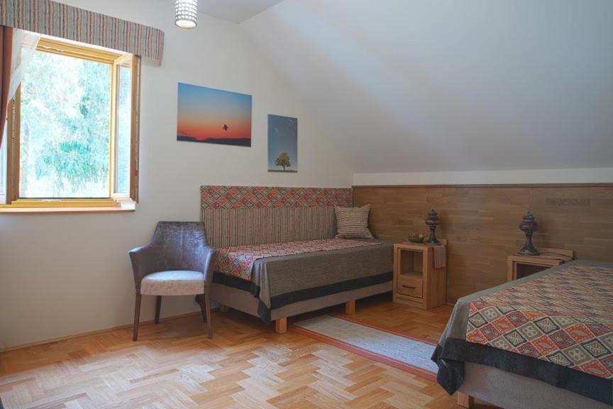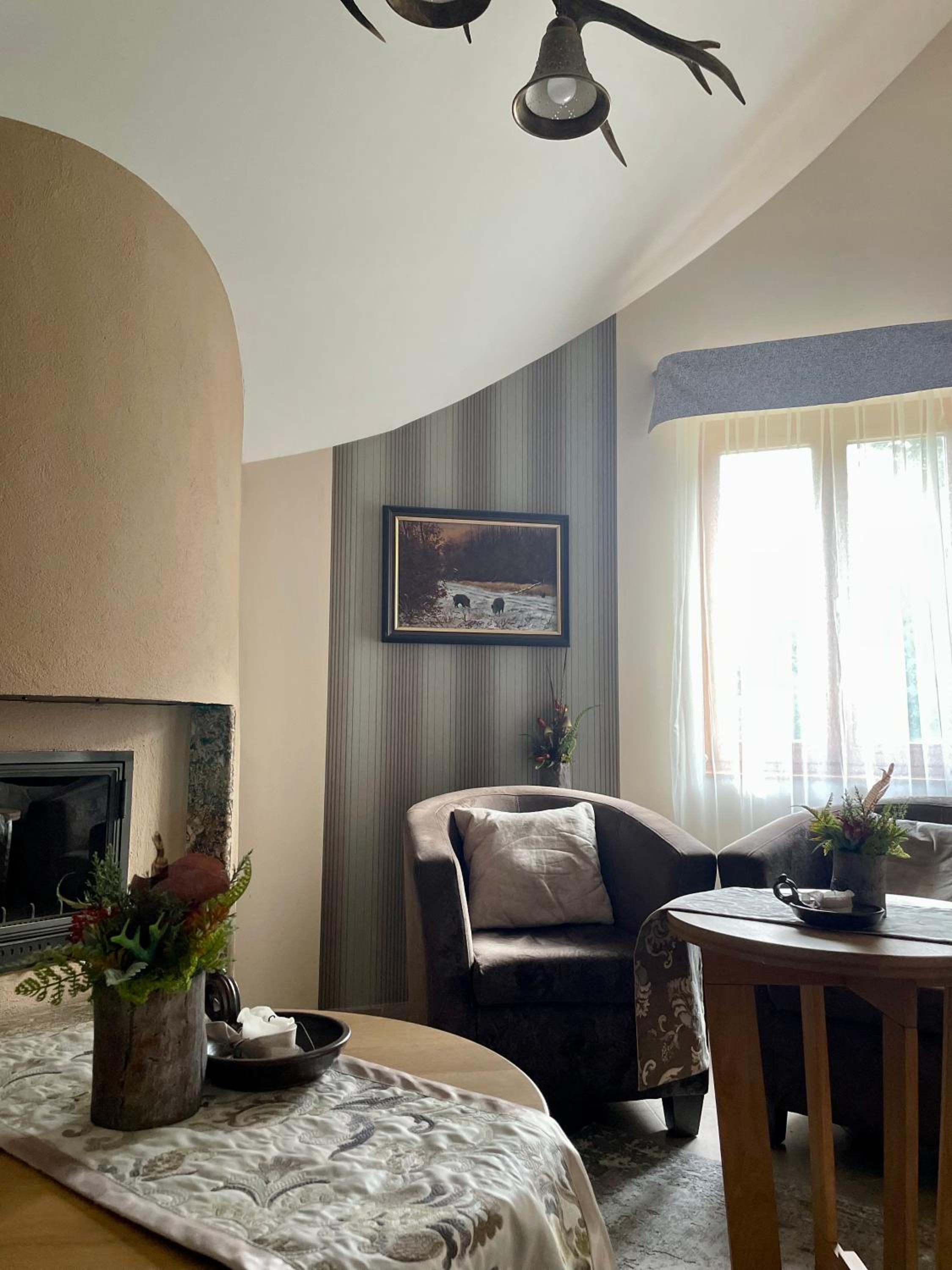 Alirét Vadászház in Ságvár offers elegantly furnished guest rooms with modern amenities including a flat-screen TV, air conditioning, and a private bathroom. The comfortable seating area and stylish decor provide a relaxing retreat for guests.
