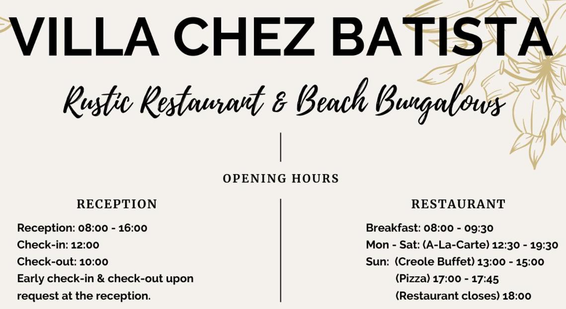 Das Restaurant in der Villa chez Battista hat viel Luft nach oben. Der Service ist mittelmässig, die Preise sind am oberen Limit und einige Gerichte und Getränke sind gar nicht erhältlich. Am Sonntag gibt es ein kreolisches Mittagsbuffet für die Gäste und die Einheimischen, am Abend ist das Restaurant allerdings zu. Weil weit und breit kein anderes Restaurant in Fussdistanz erreichbar ist, wird es schwierig.
