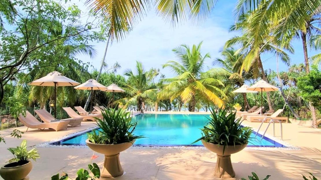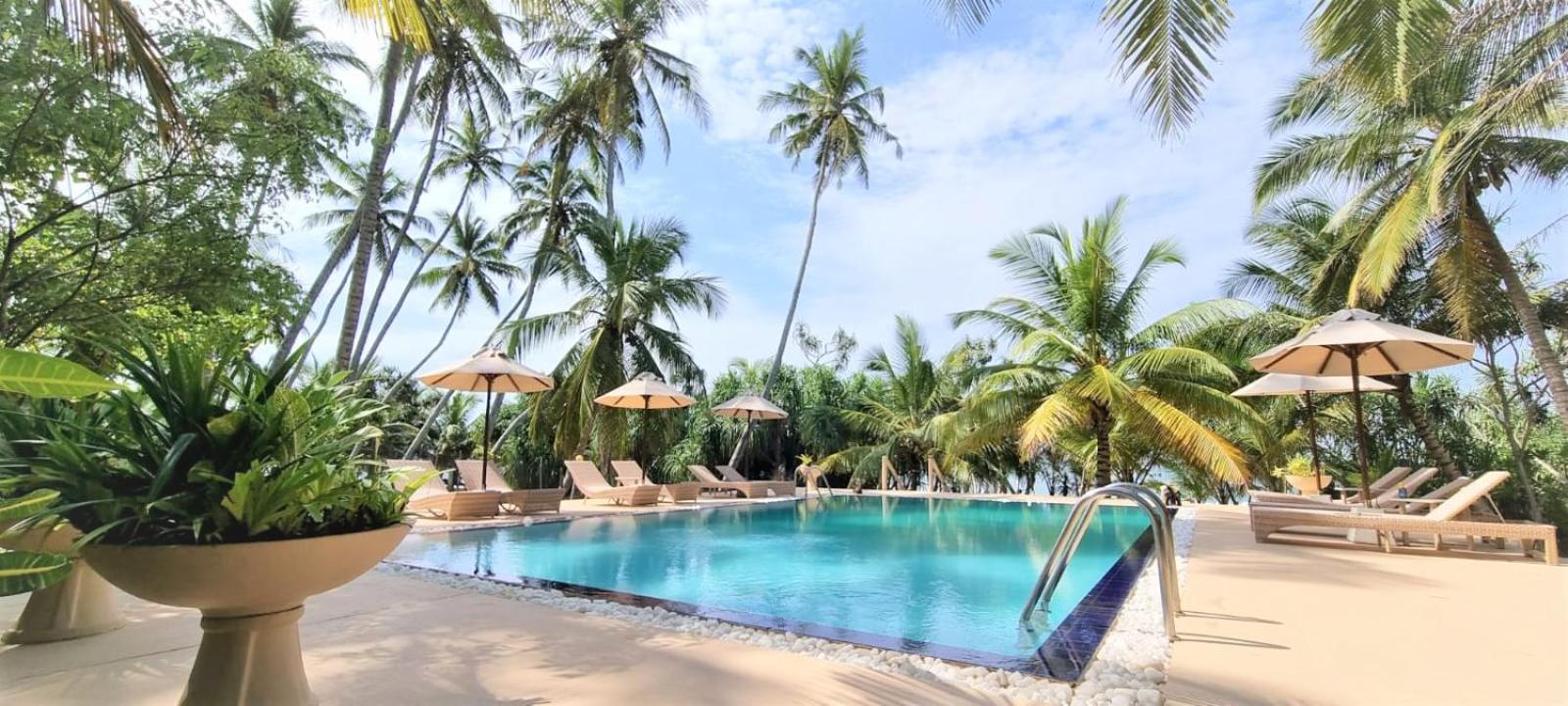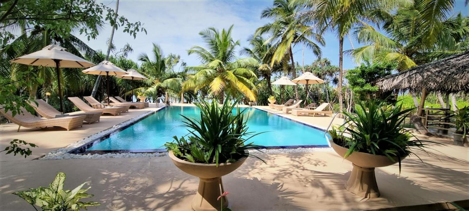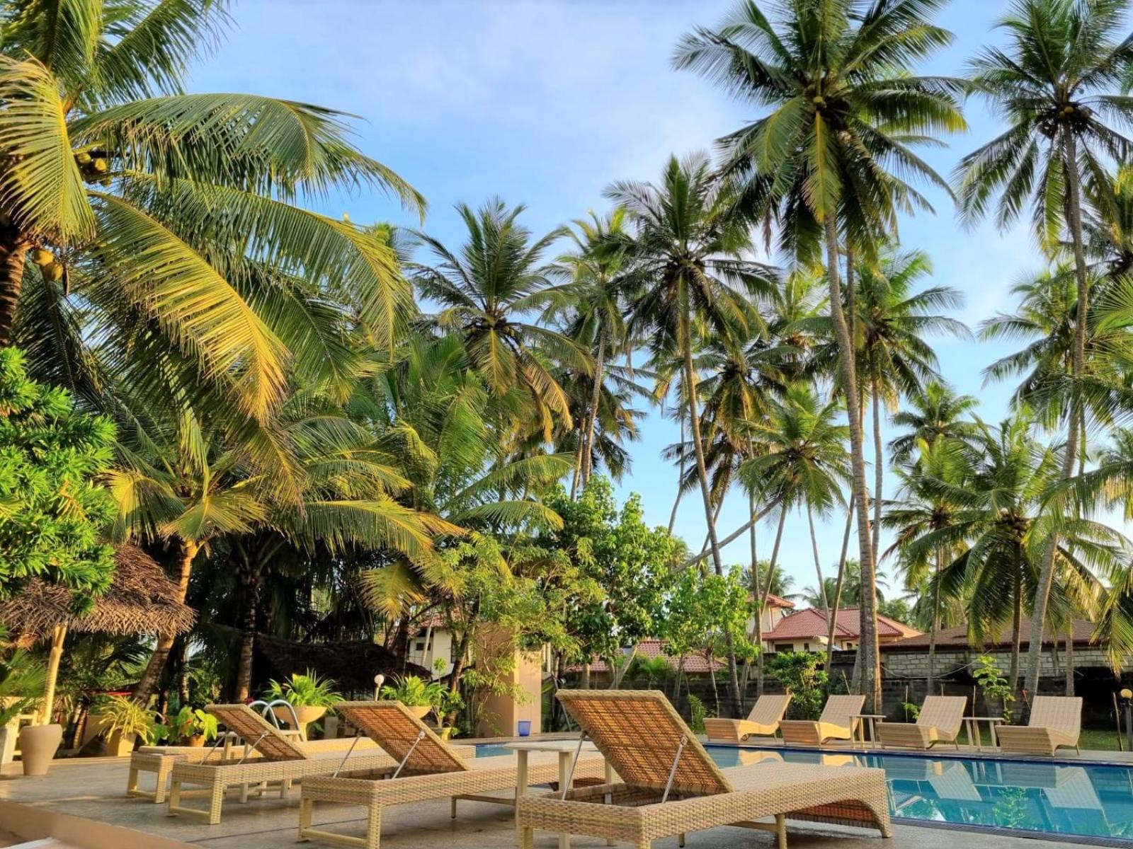 Unwind in Style: Enjoy the outdoor swimming pool, garden, and terrace at Golden Beach Paradise after a day at Wella Odaya Beach.