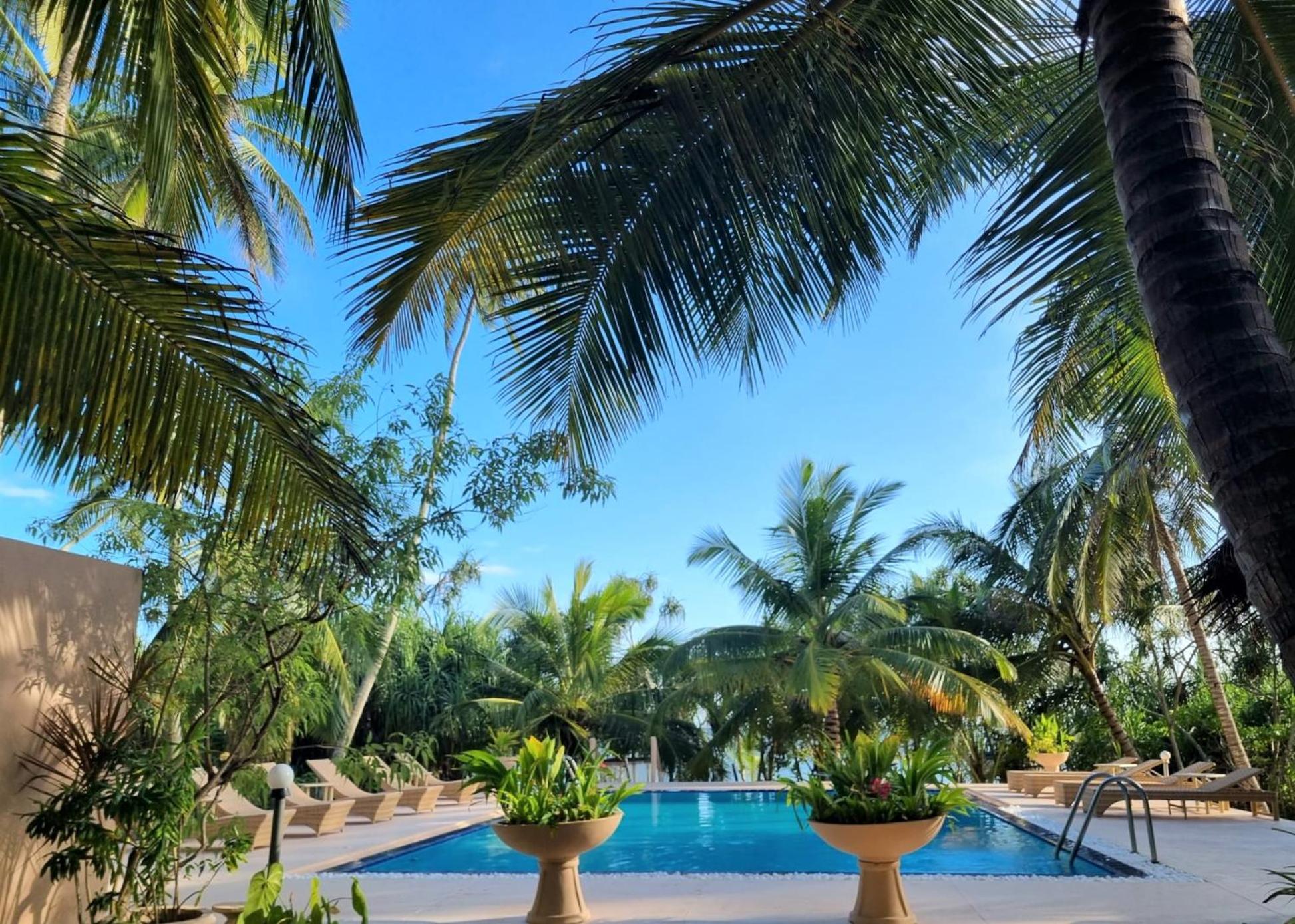 Le cadre de la piscine est magnifique, entourée de cocotiers, propice à la détente.