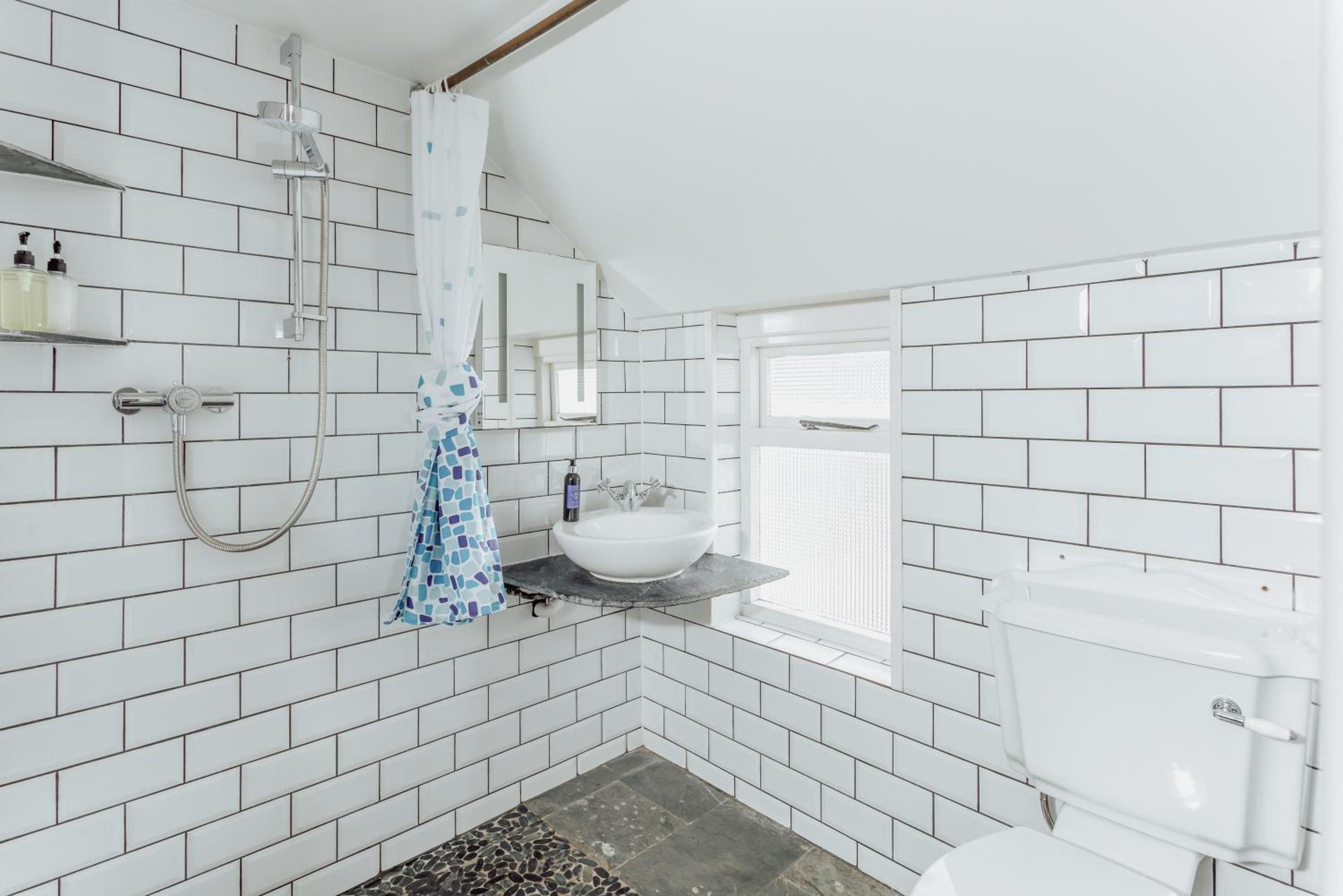Pebbled shower tray. Furniture would benefit from make over or at least cosmetic improvements.