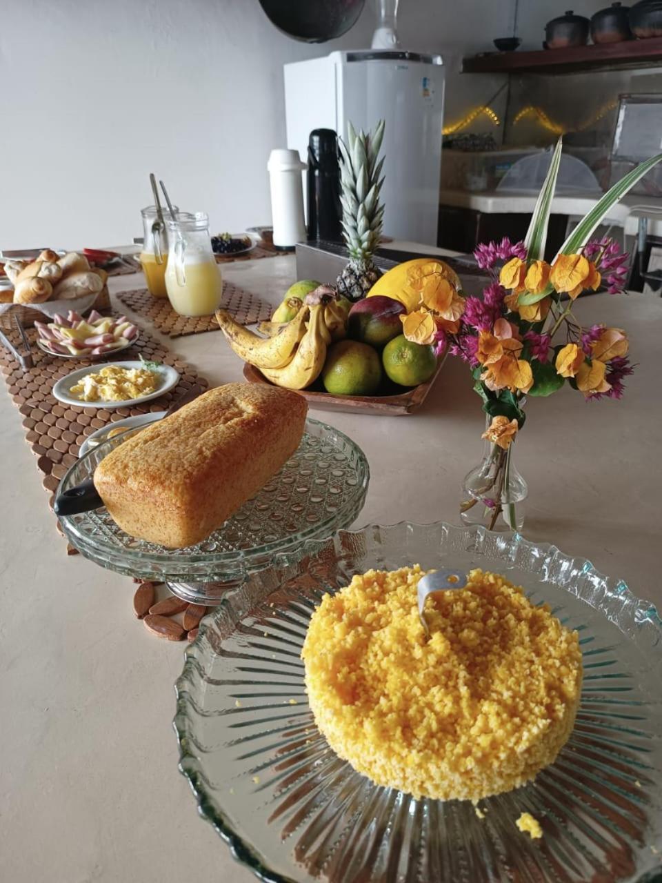 O café da manhã é servido em uma mesa coletiva que torna a experiência mais acolhedora, com delícias fresquinhas como tapioca feita na hora, frutas da estação, iogurtes e bolos caseiros. Tudo preparado pela Aline, muito simpática e atenciosa.