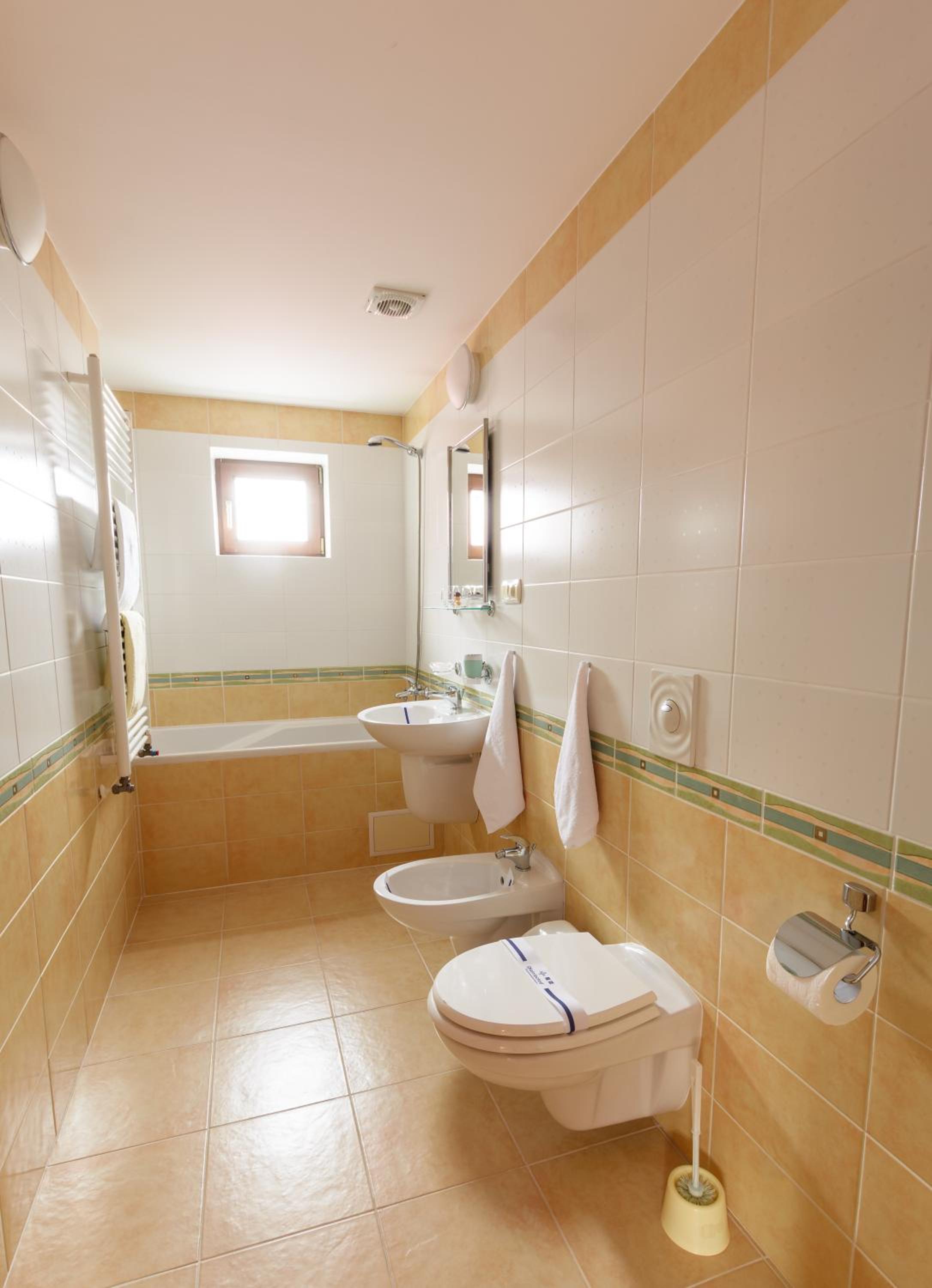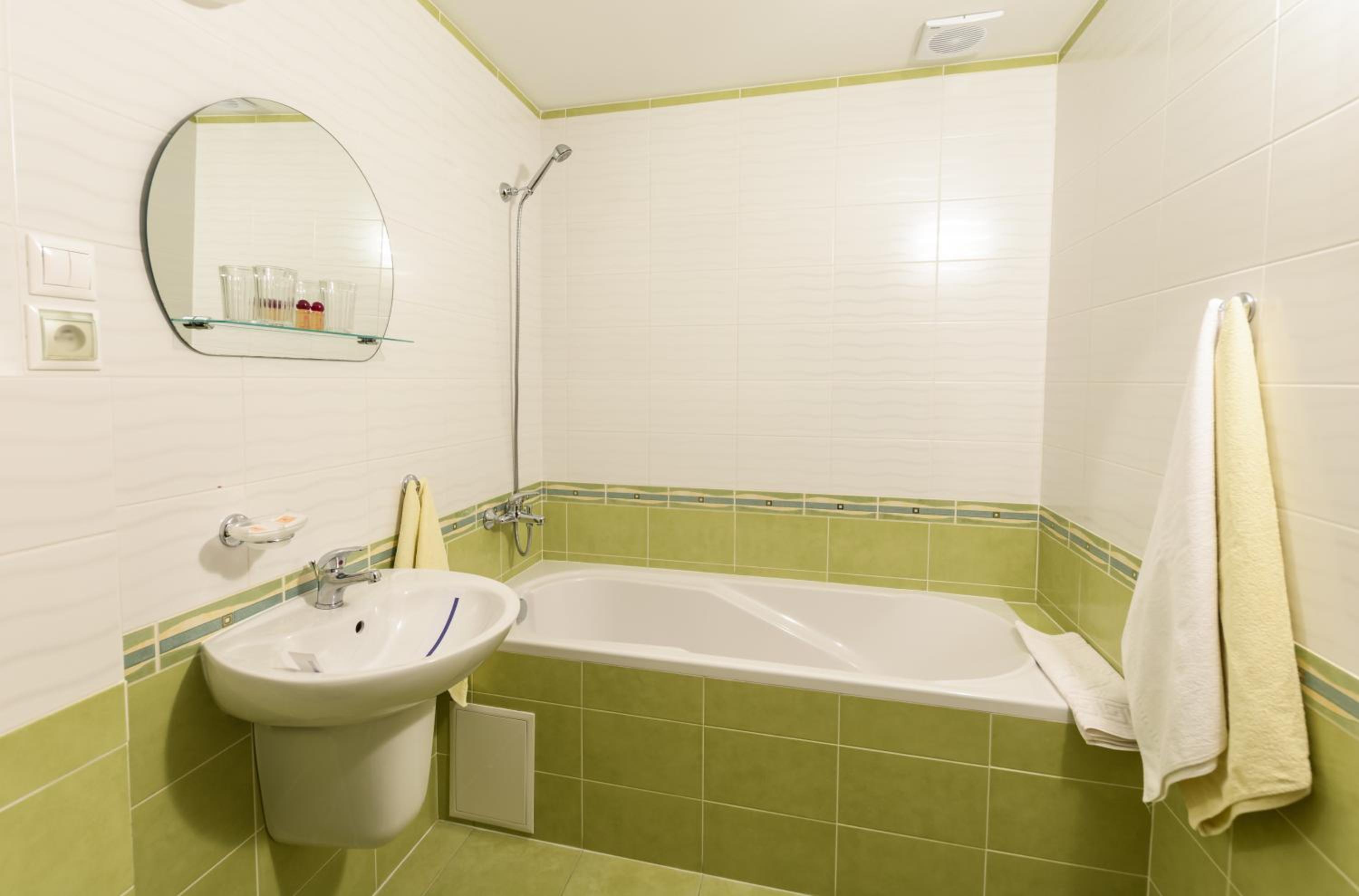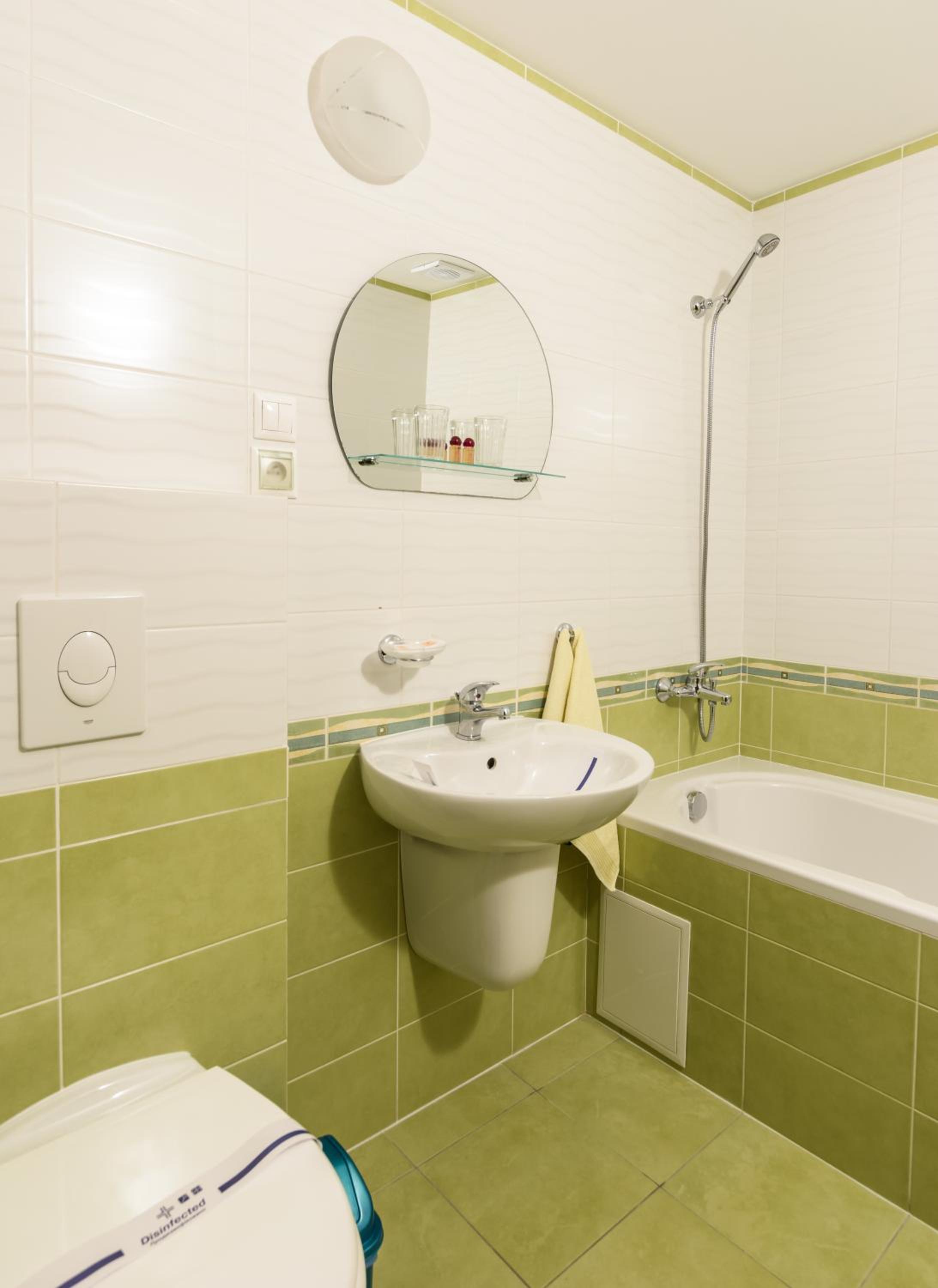 Ванна. Душем важко користуватись, бо нема шторки і вода розплескується на підлогу. В жовтні вже прохолодно, як обігрів запропонували кондиціонер, який взагалі не грів. Добре що ковдра тепла, вночі не мерзли. Чистота номера теж не на висоті. За таку ціну очікували кращого.