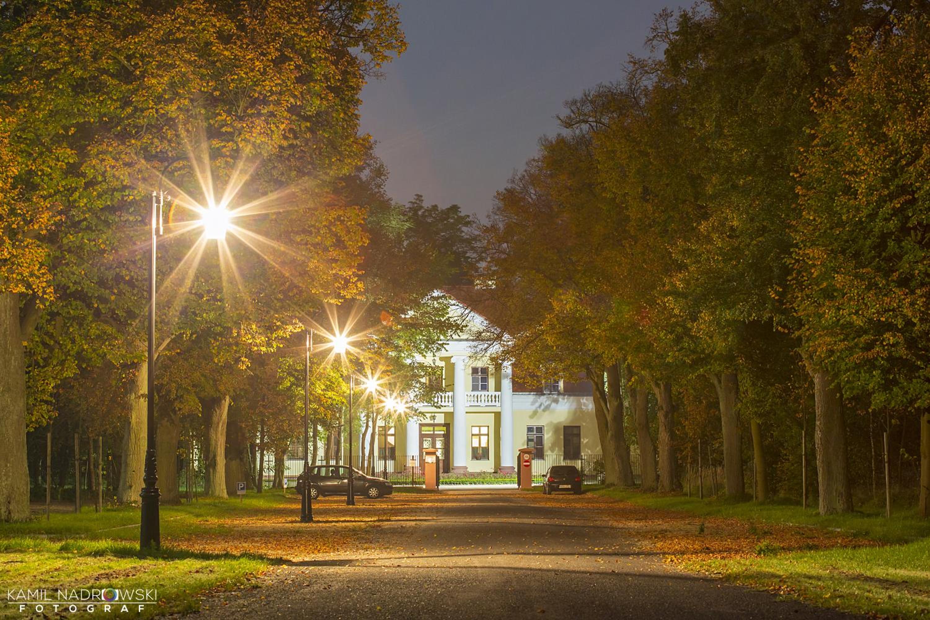Brak oświetlenia na zewnątrz, wszystkie latarnie wyłączone, ciemność na podjeździe; miejsce trochę zaniedbane; czystość