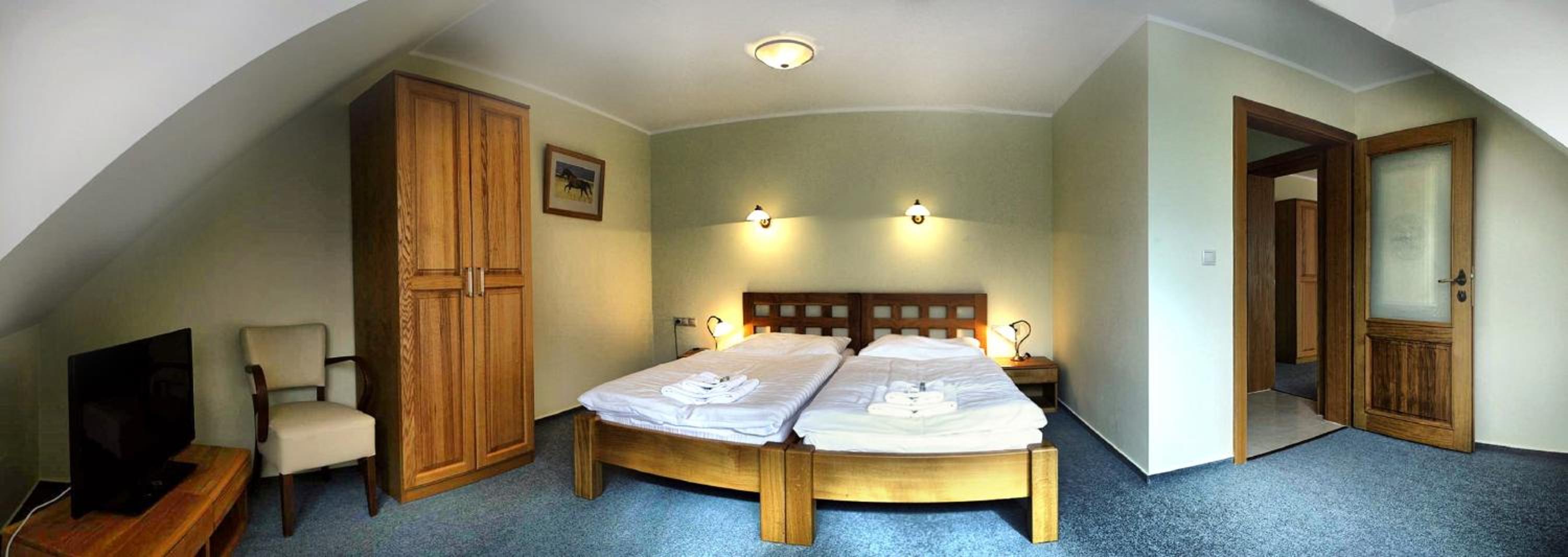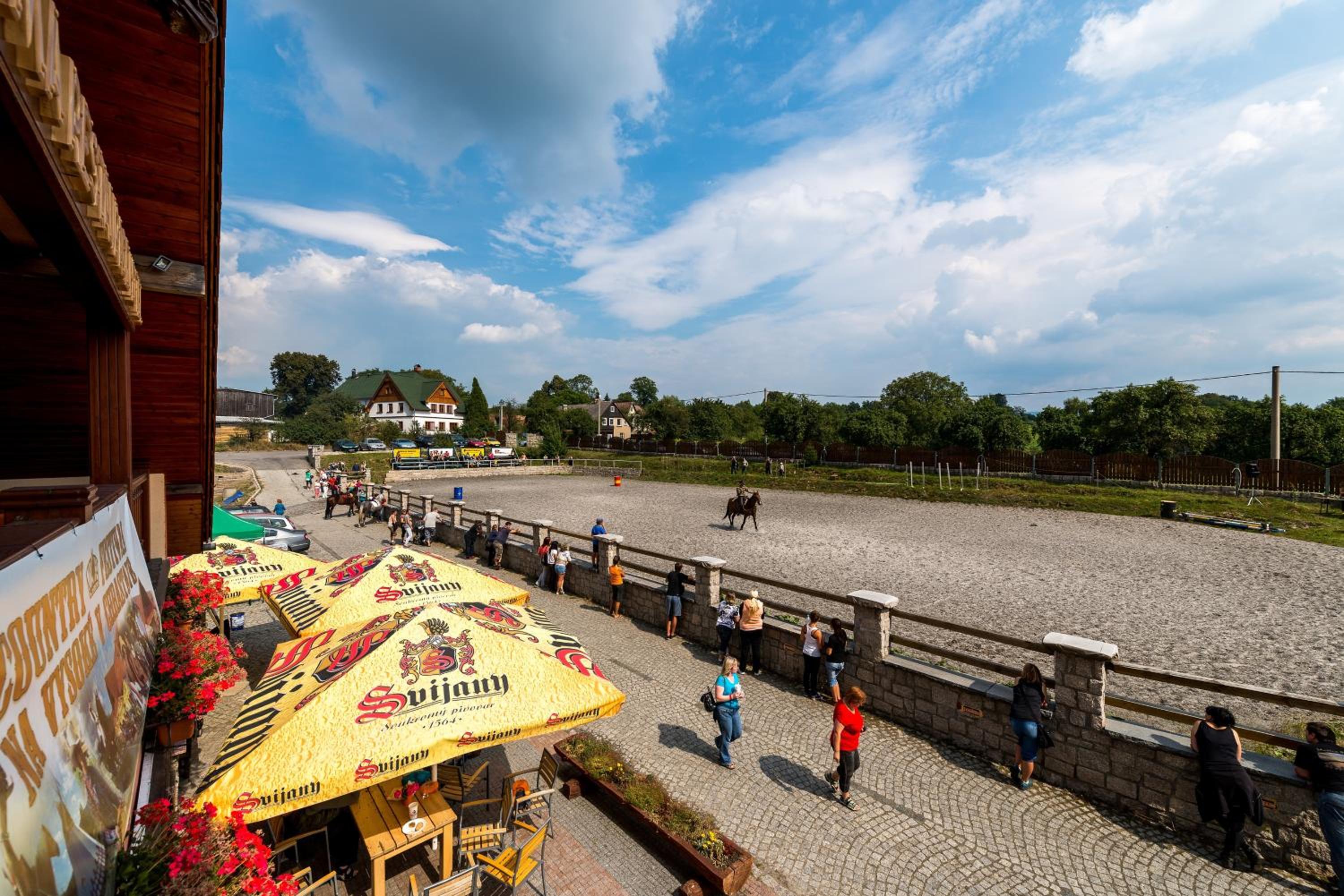 Hotel Farma Vysoká offers a unique experience with its on-site equestrian center and spacious rooms featuring oak furniture and free wired internet. Each room is designed in warm colors and includes a small seating area and a flat-screen TV.