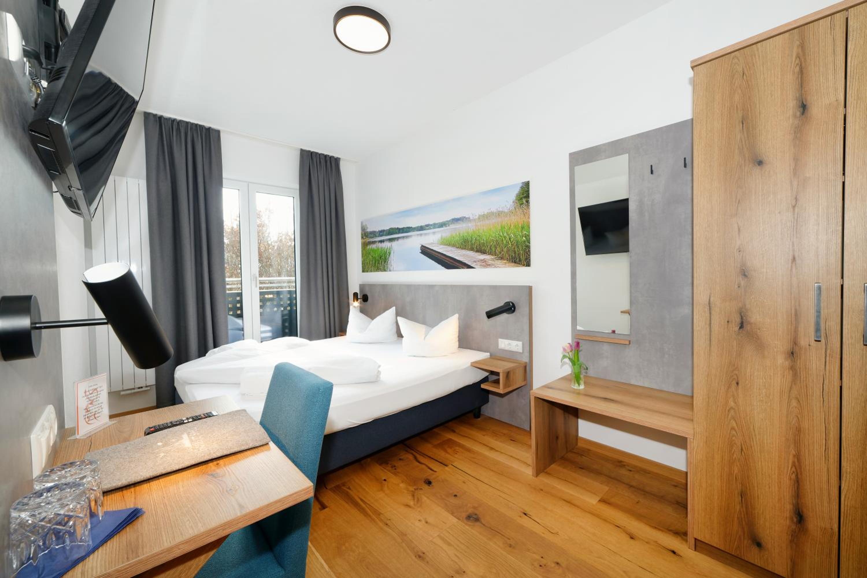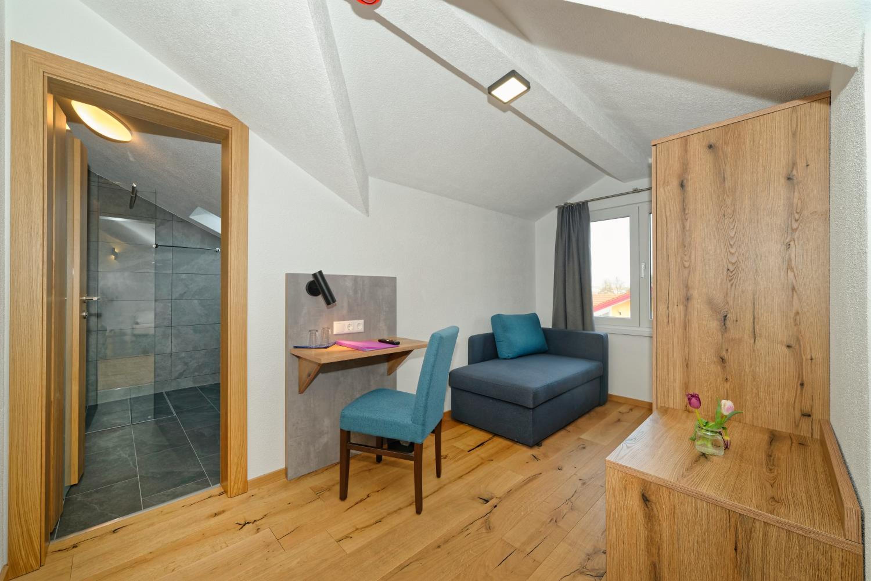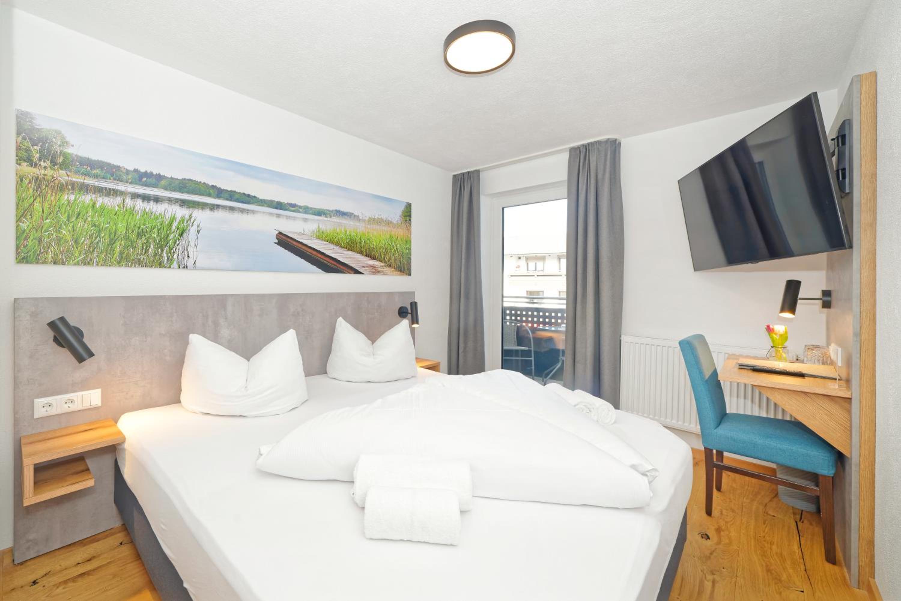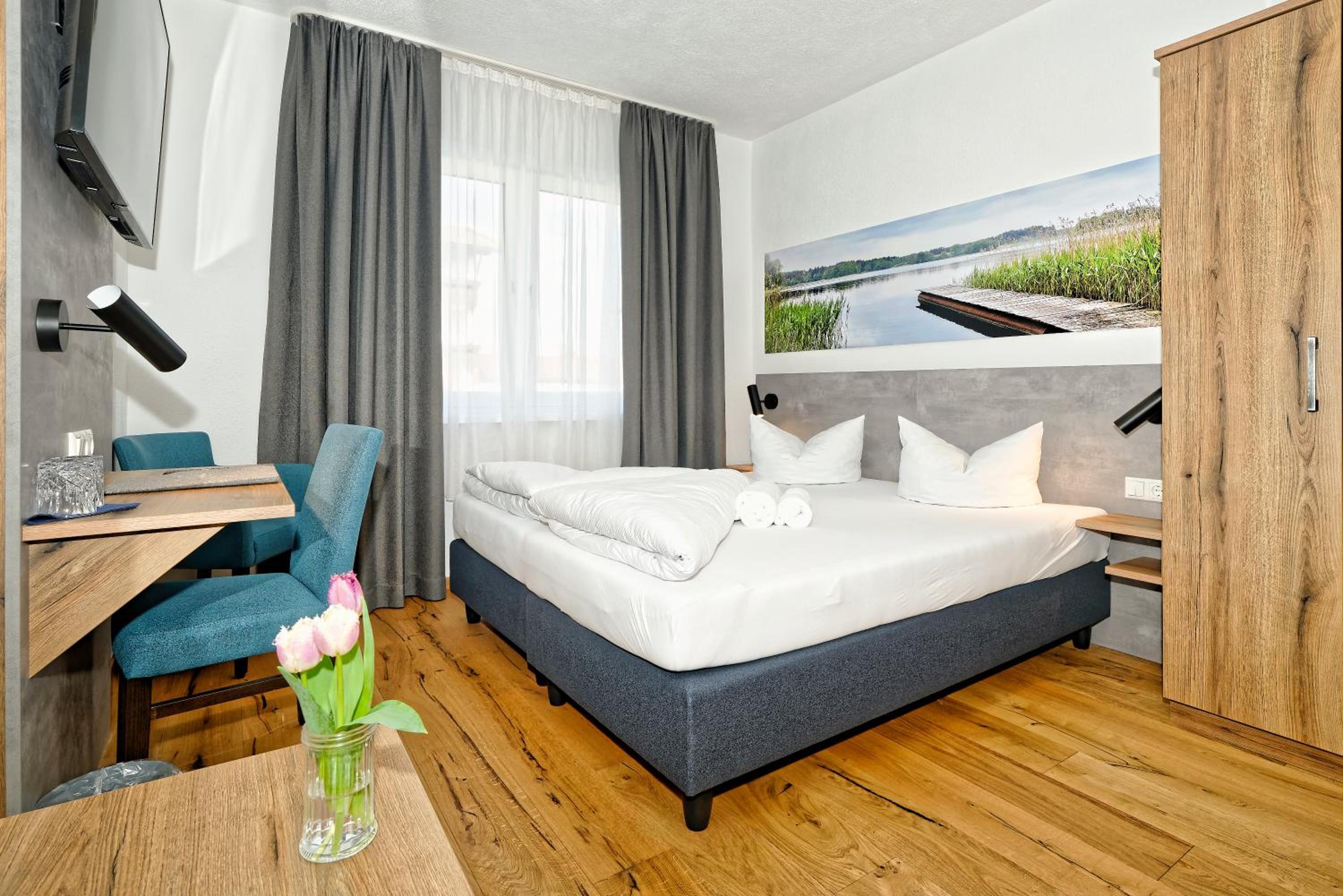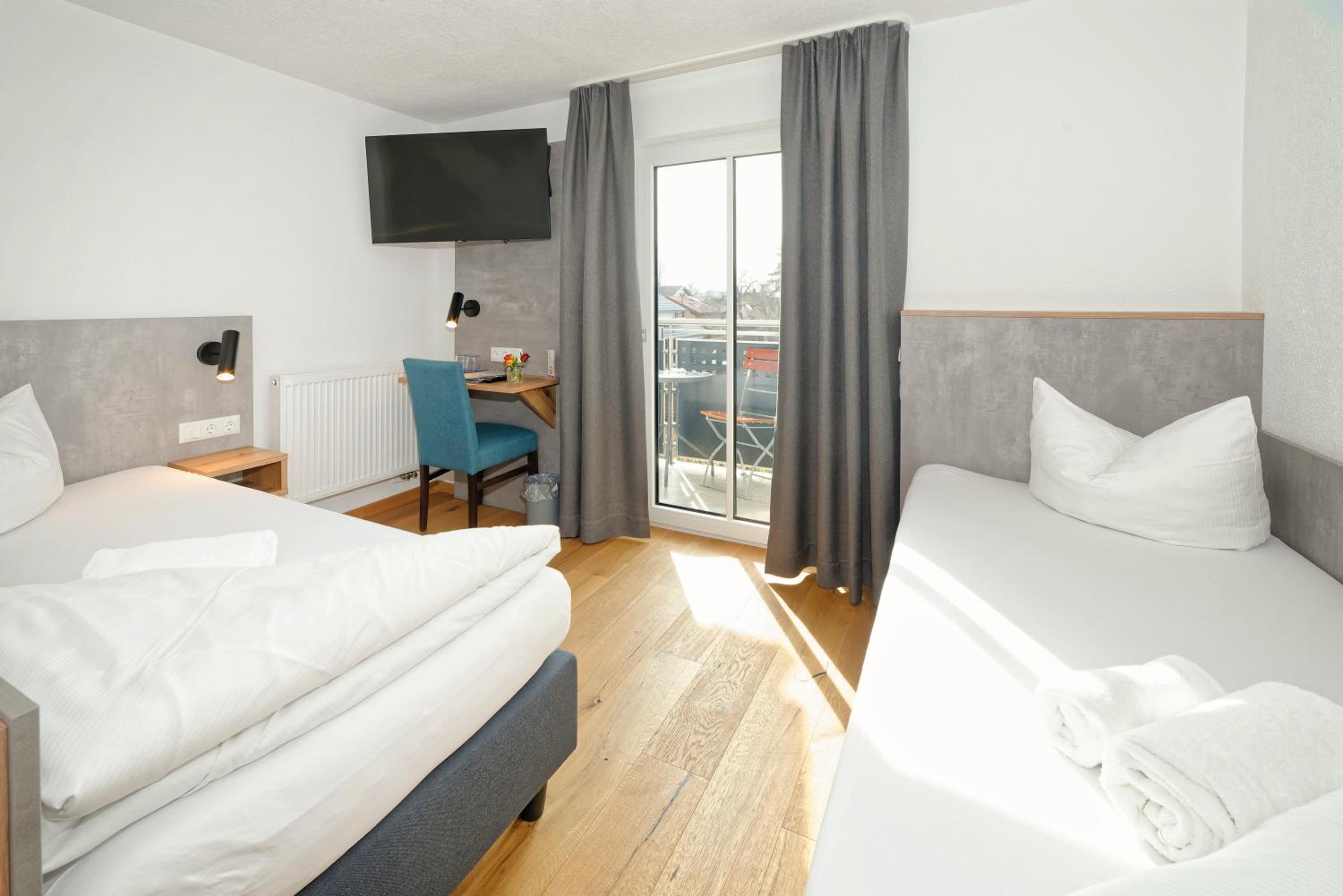 Chambre propre et fonctionnelle, au design sobre et contemporain. Nombreuses prises électriques (pas toujours le cas chez nous en France) et rangement suffisant. Nous avons apprécié le balcon avec table et chaises, le réfrigérateur à disposition des clients dans le couloir et le garage à vélo, plutôt vide en cette saison. Grandes terrasses extérieures. Personnel sympathique. Petit déjeuner FABULEUX. Hôtel très bien situé géographiquement (Chiemse à 4 km, Munich et Salzburg à 1h/1h30).