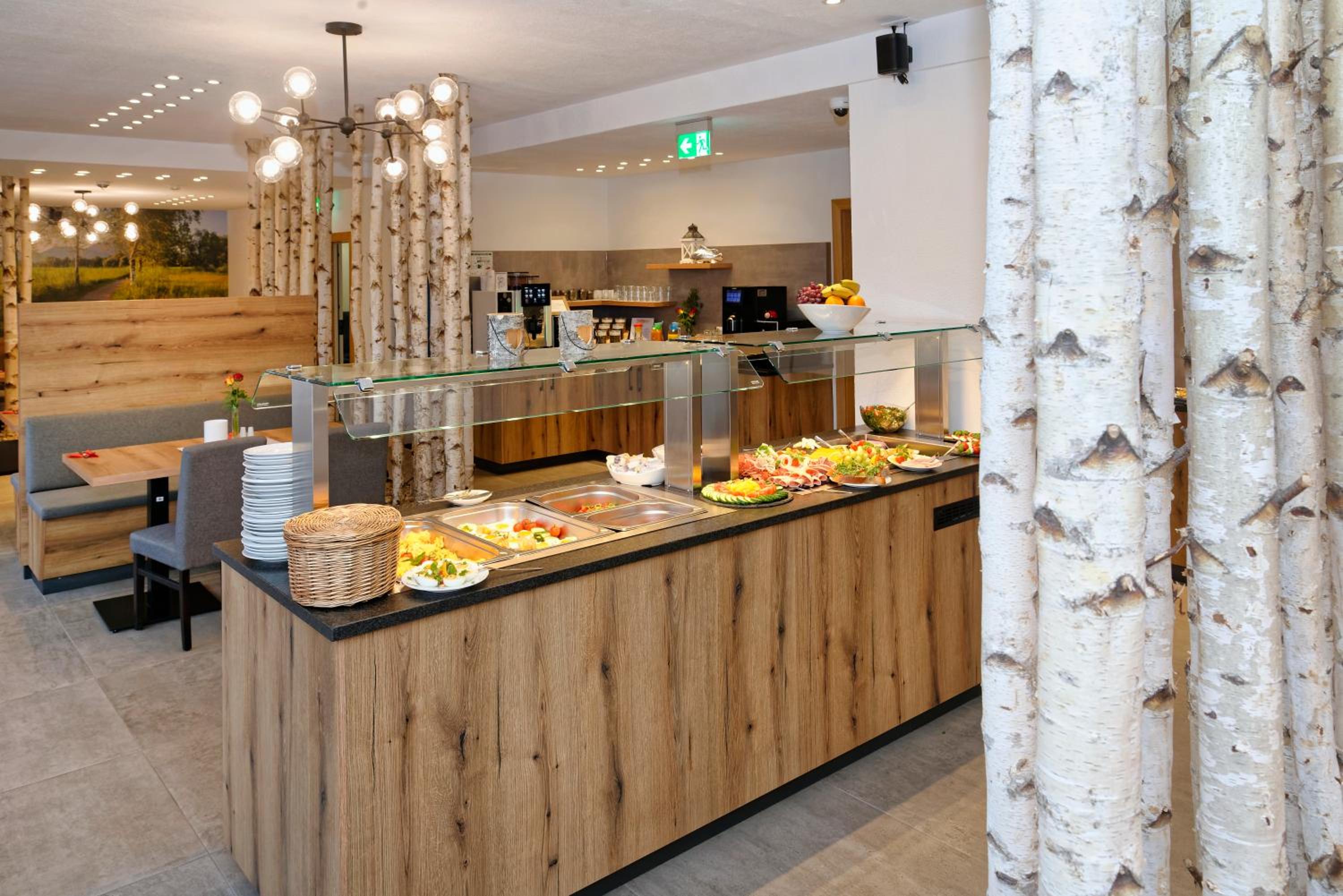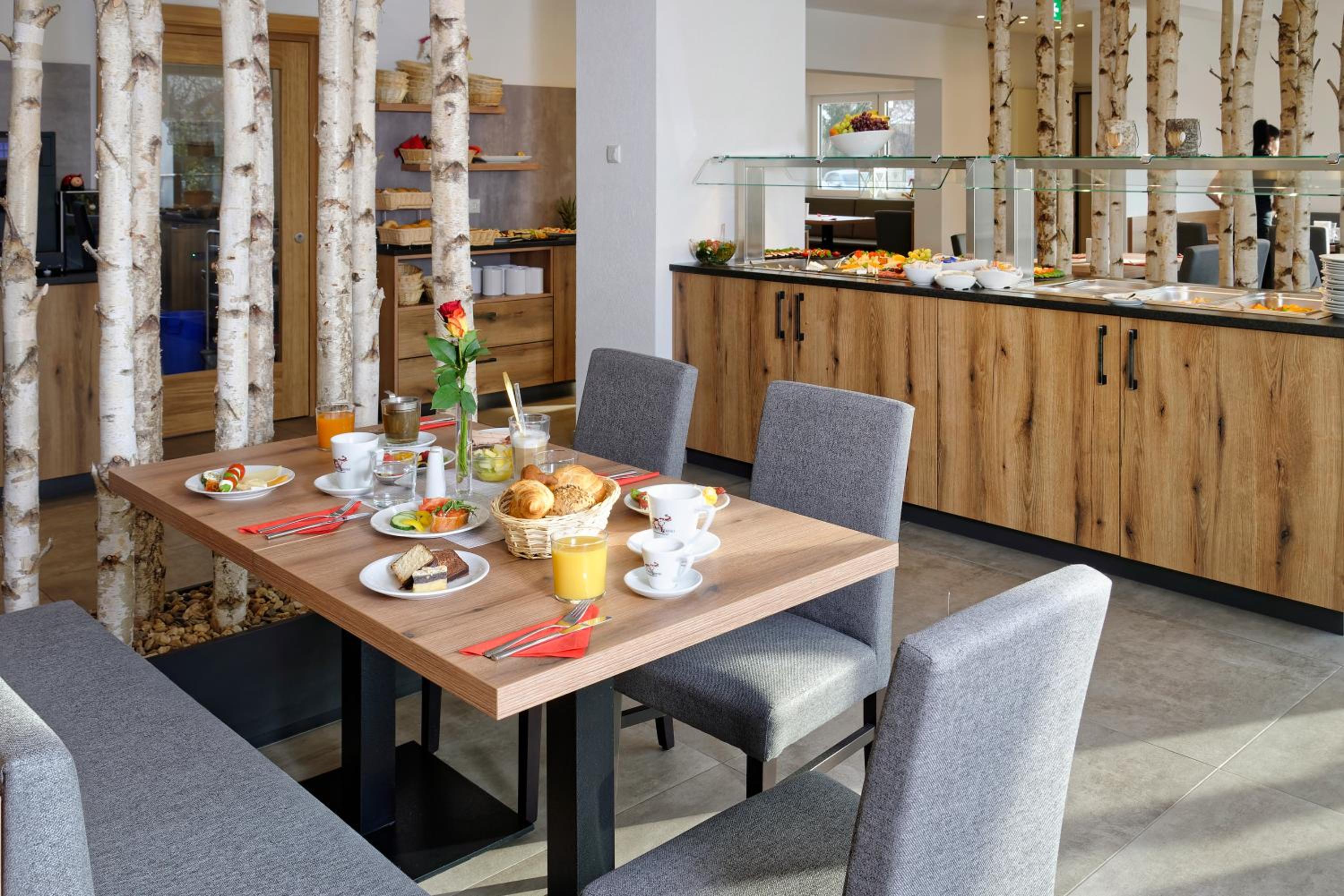Der Aufenthaltsraum ist mit zahlreichen humorvollen bis tiefsinnigen Motivationsschildern ein Hingucker. Der Frühstücksraum ist modern und doch gemütlich, sehr liebevoll und wie das ganze Hotel sehr geschmackvoll und wertig gestaltet.