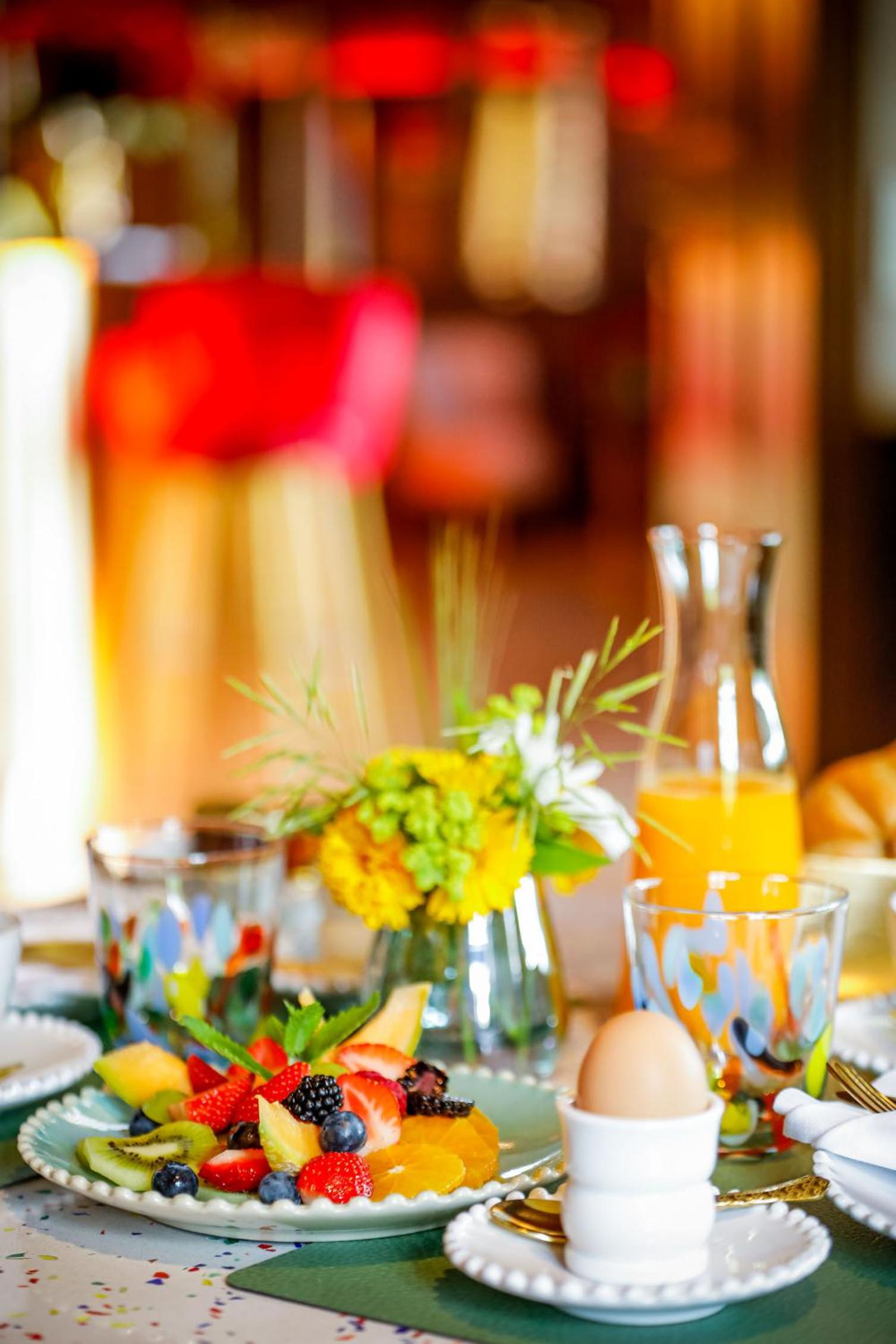 Köstliches frühstück auf sonniger herrlicher terrasse mit freundlichem personal