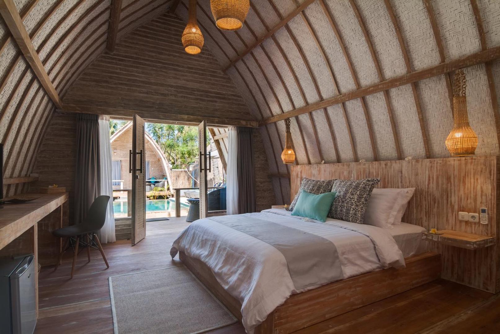 Gili Meno Escape - Adults Only offers elegantly designed rooms with modern amenities, including air conditioning, flat-screen TVs, and private terraces overlooking the pool.