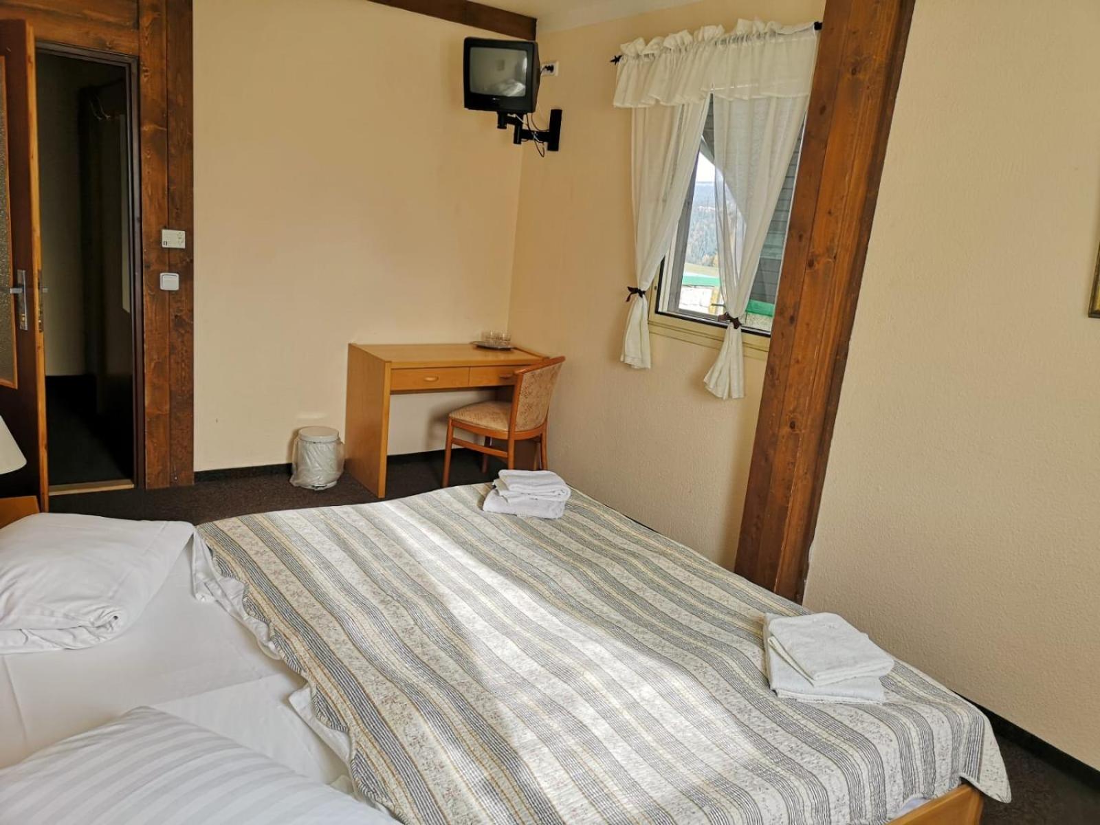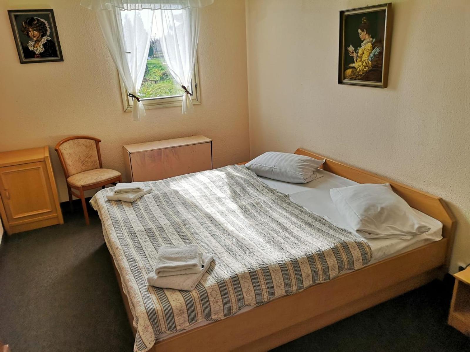 Na pokoji chyběl celé 3 noci závěs, protože je prý v prádelně a jiný nemají. V pokoji, který reklamují jako 2 - 3 lůžkový jsme měli nacpané 4 postele, takže nebylo k hnutí. Dveře od koupelny se nedali zavírat, byl rozbitý zámek. Nečekali jsme, že by to někdo opravil, tak jsme to ani nehlásili. Nebylo zde ani mýdlo na ruce. Matrace byly proleželé, takže spal člověk v důlku. Do manželské postele se matrace ani nevešla a v nohách trčela ven.