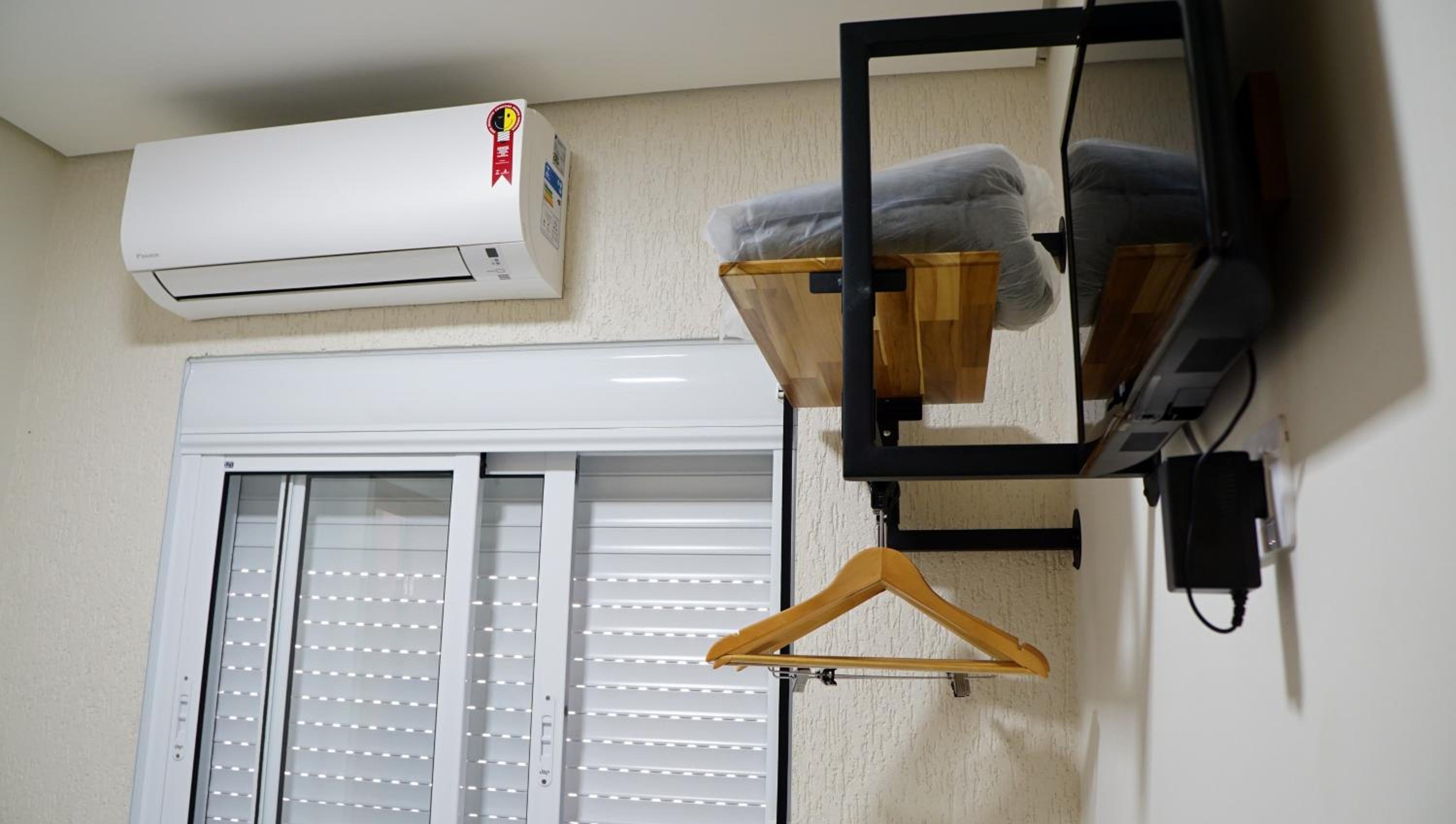 Quarto arrumado, limpo, individual e climatizado. Tem um cafezinho compartilhado na copa todos os dias pela manhã e geladeira e microondas disponível para os hóspedes.