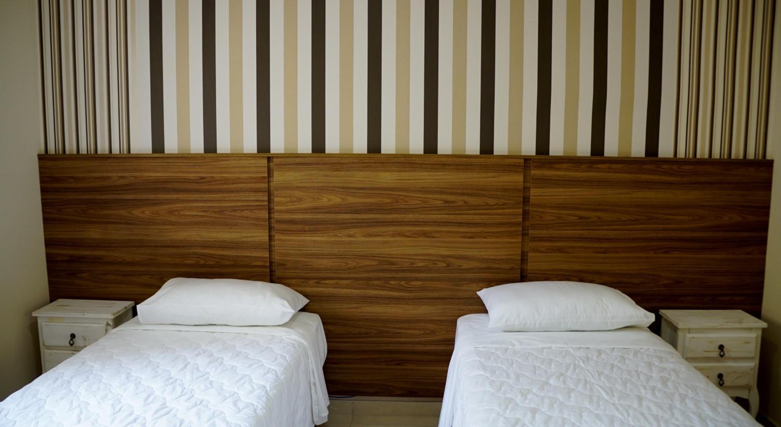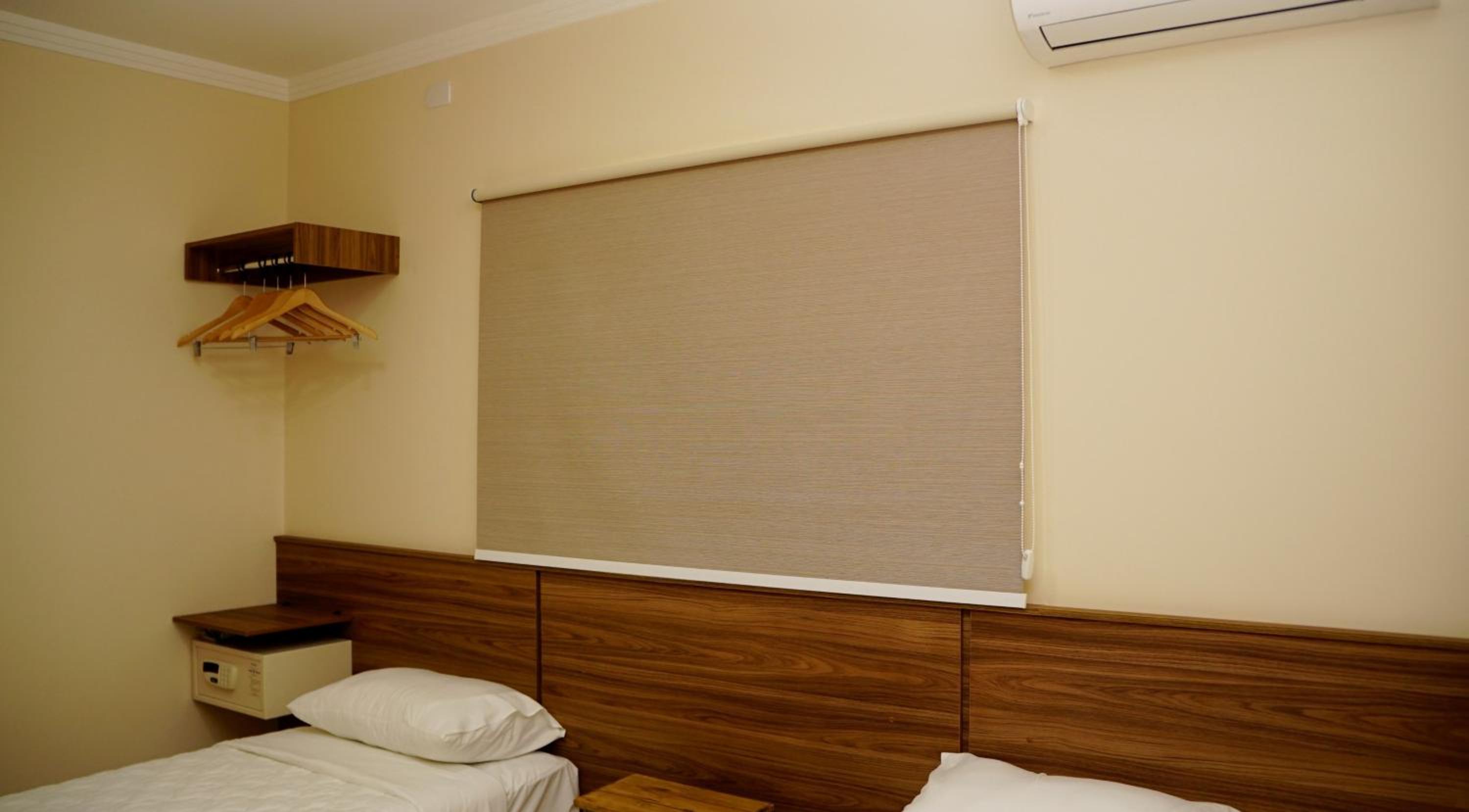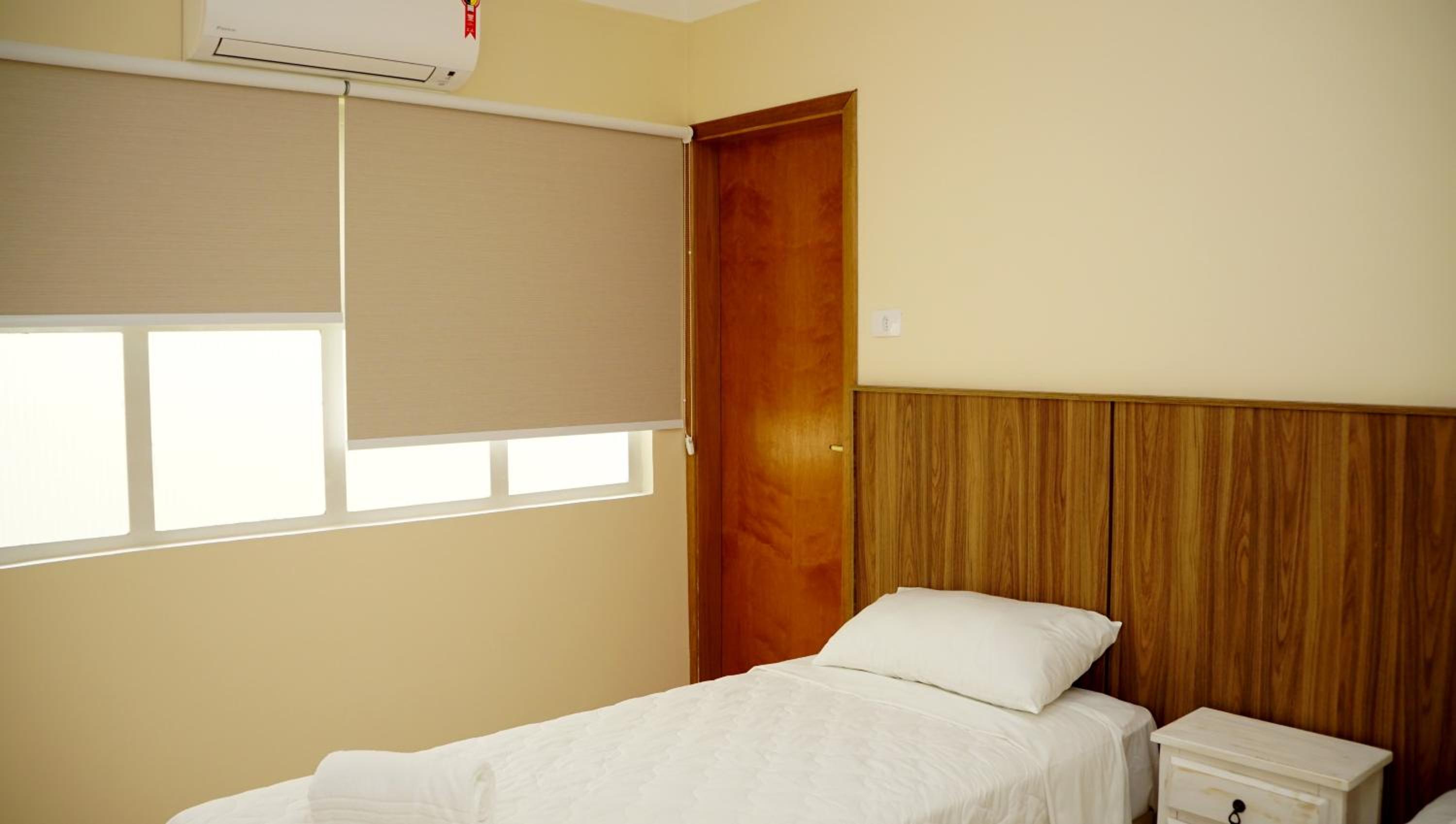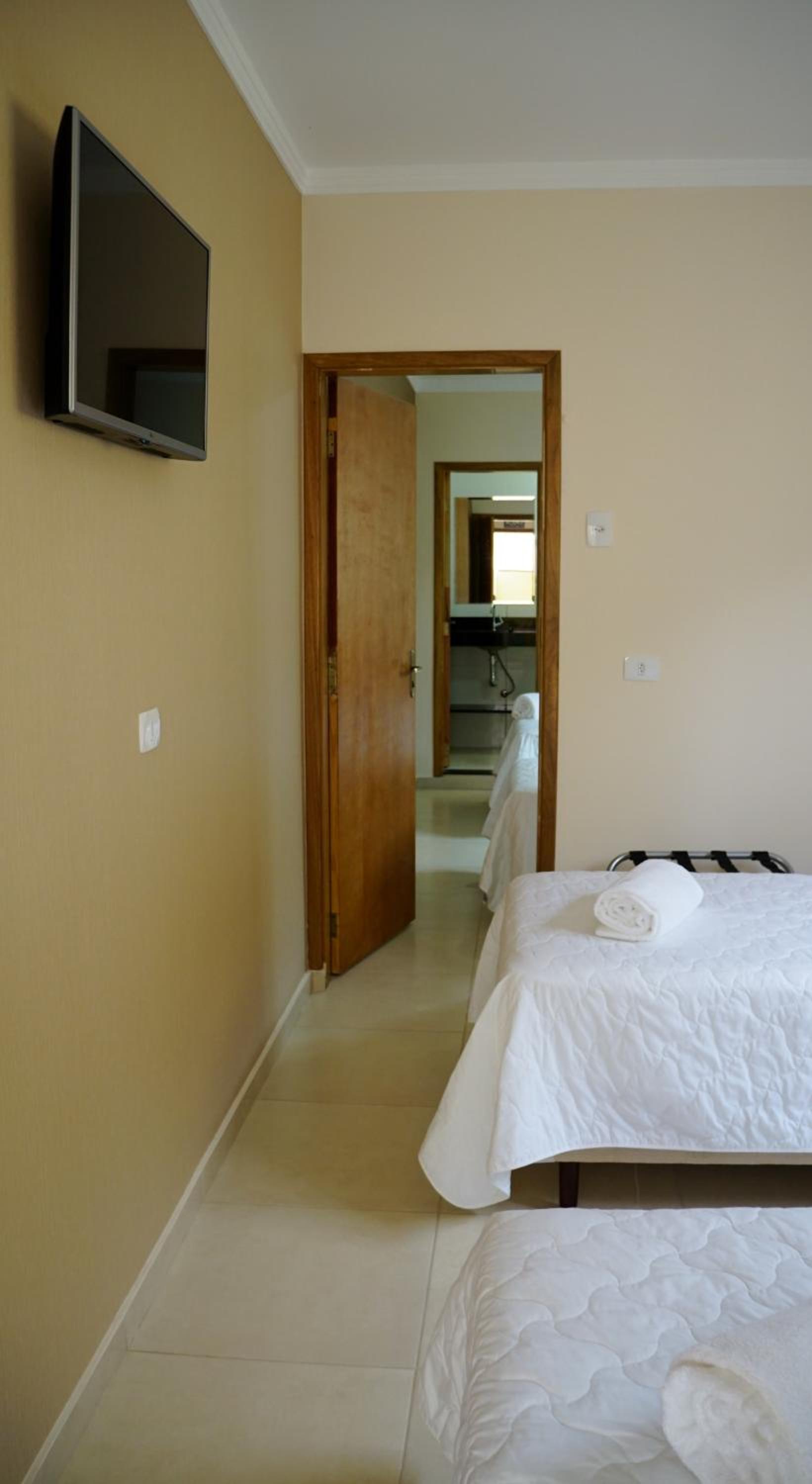Quarto bem limpo e arrumado, camas confortáveis, ar condicionado e TV smart.