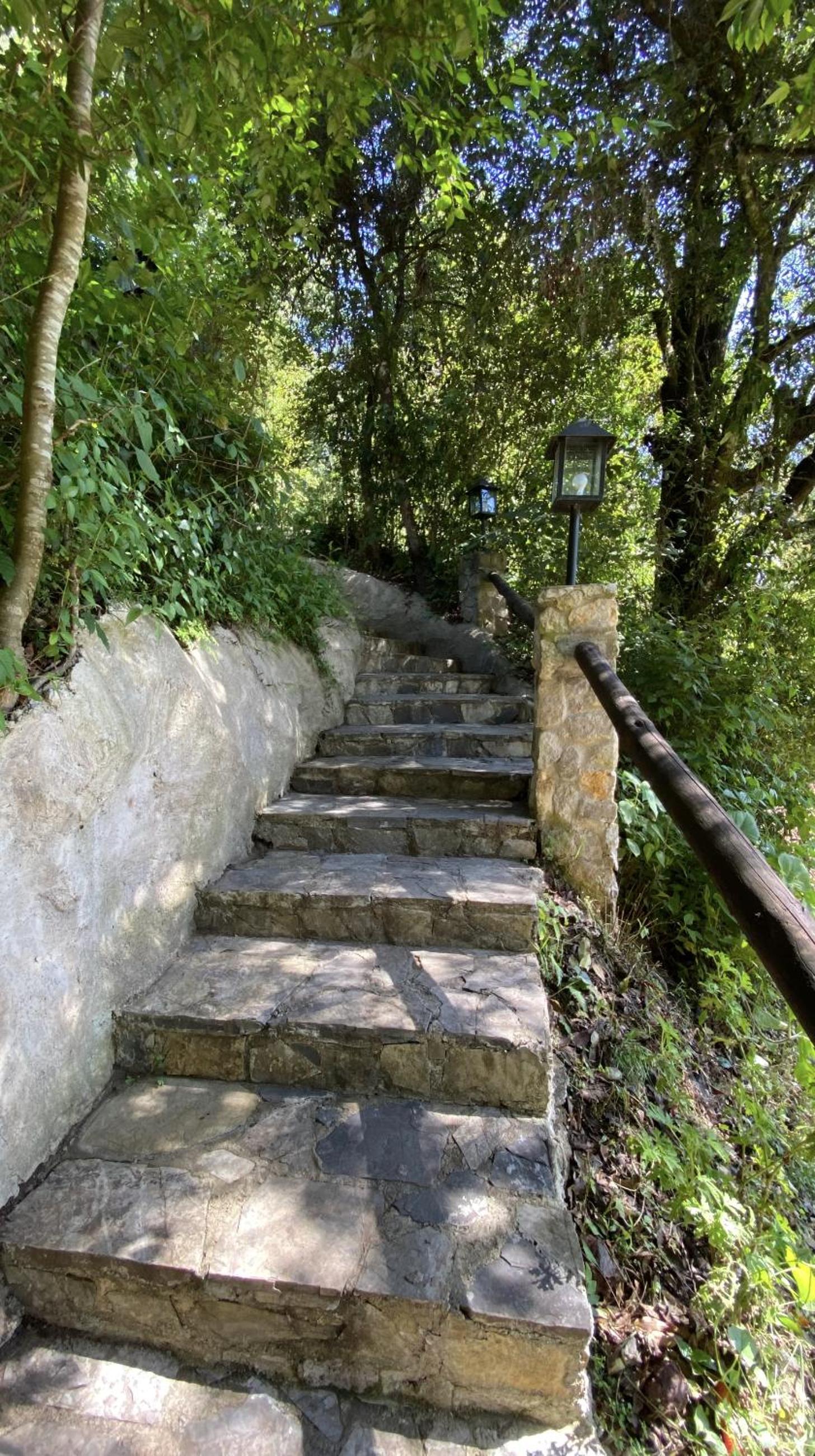 Acceso a las cabañas desde la carretera en plena curva y muy peligrosa, ya que además está de rampa y es terracería
