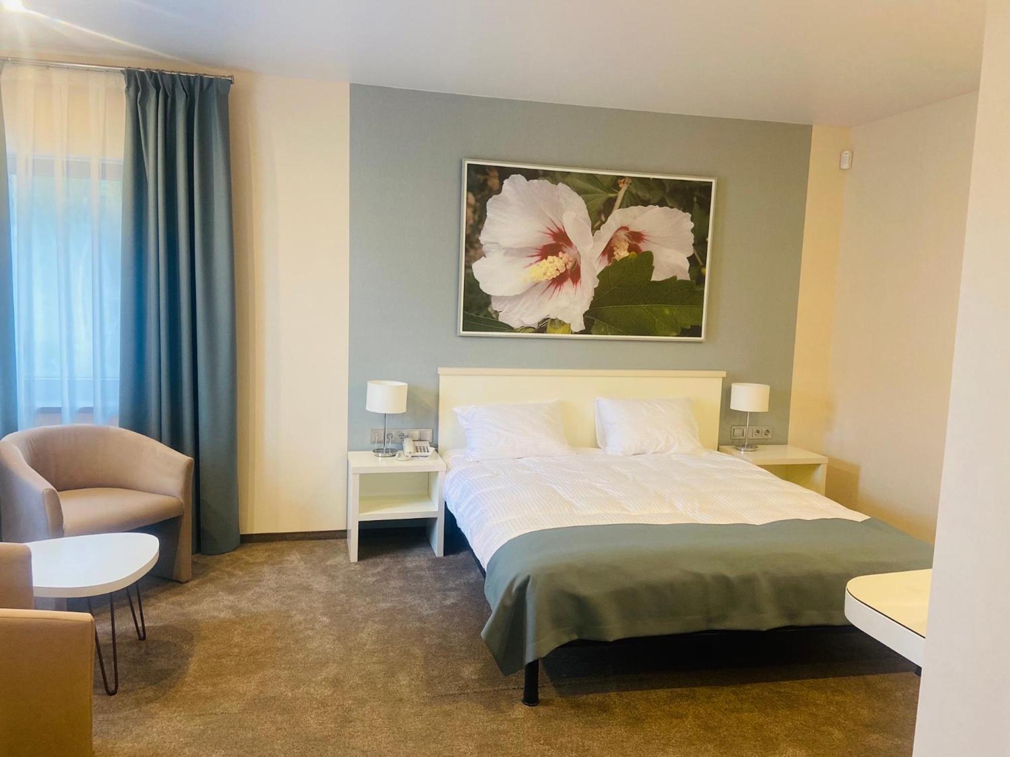 Відпочивали з друзями в двомісних будиночках 5 днів, фото відповідає дійсності, ремонт свіжий, дуже все гарненько і досить чисто. Двомісне ліжко просто космос, воно величезне) В номерах є одноразові капці та засоби гігієни, при необхідності відразу поповняють, а також, за потреби, в номерах прибирають та змінюють рушники. Є чайник, телевізор, кондиціонер. вода, кава і чай на вибір. Парковка для авто відразу біля будиночків, що дуже зручно і під наглядом.