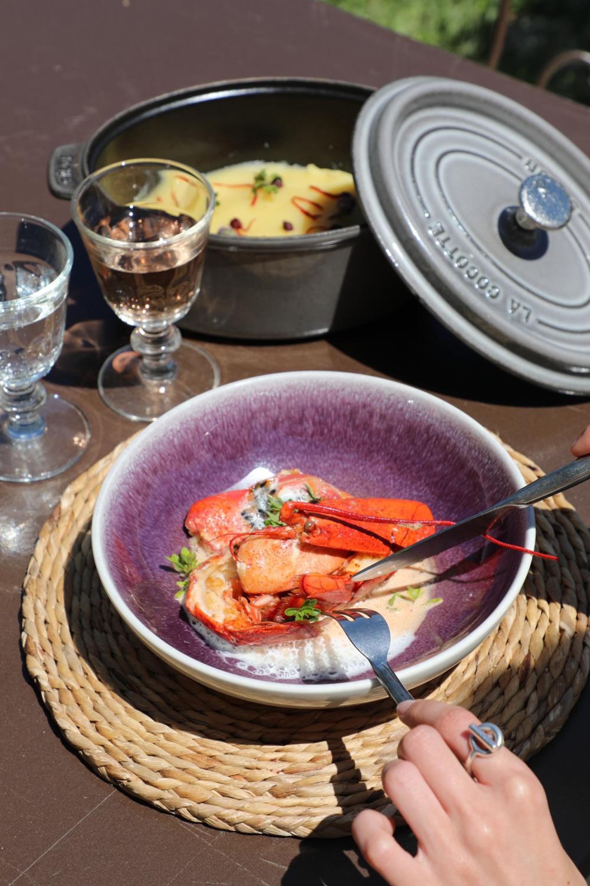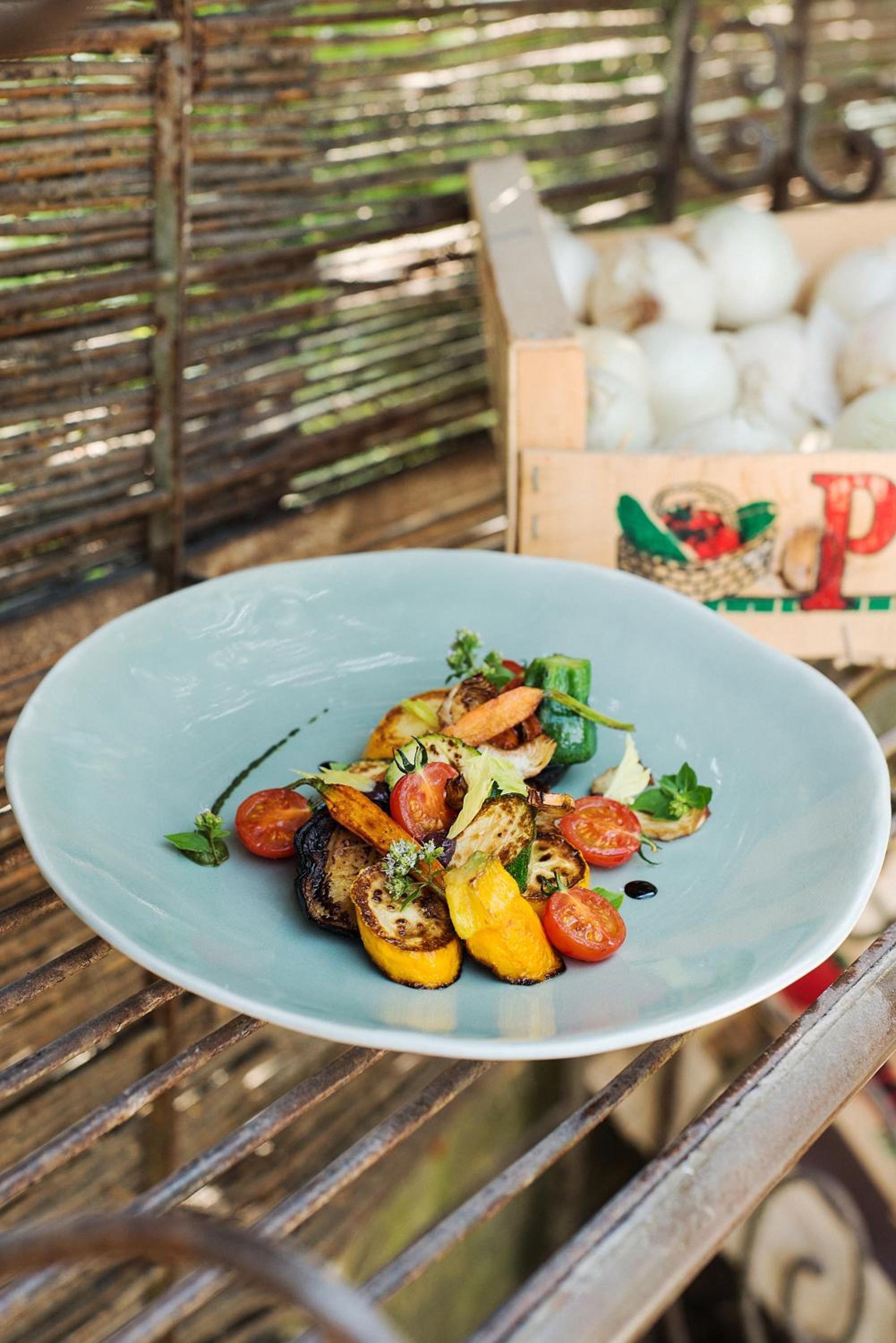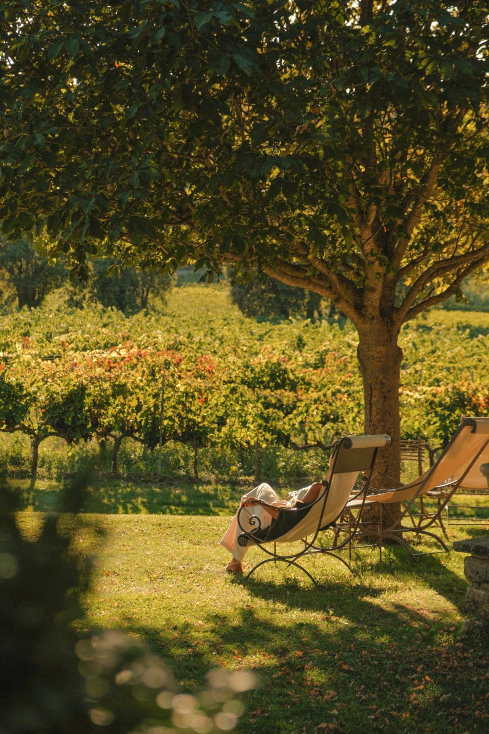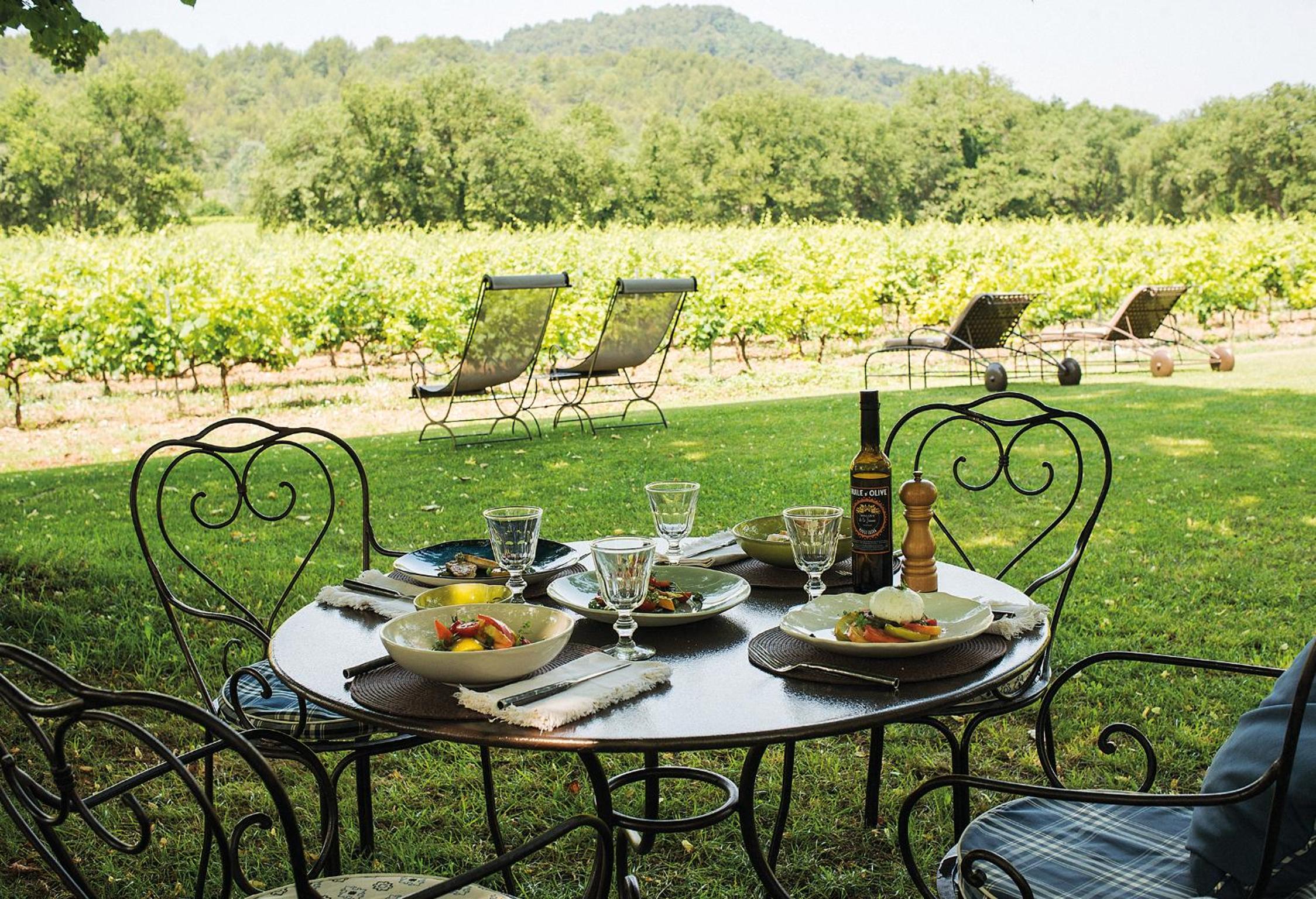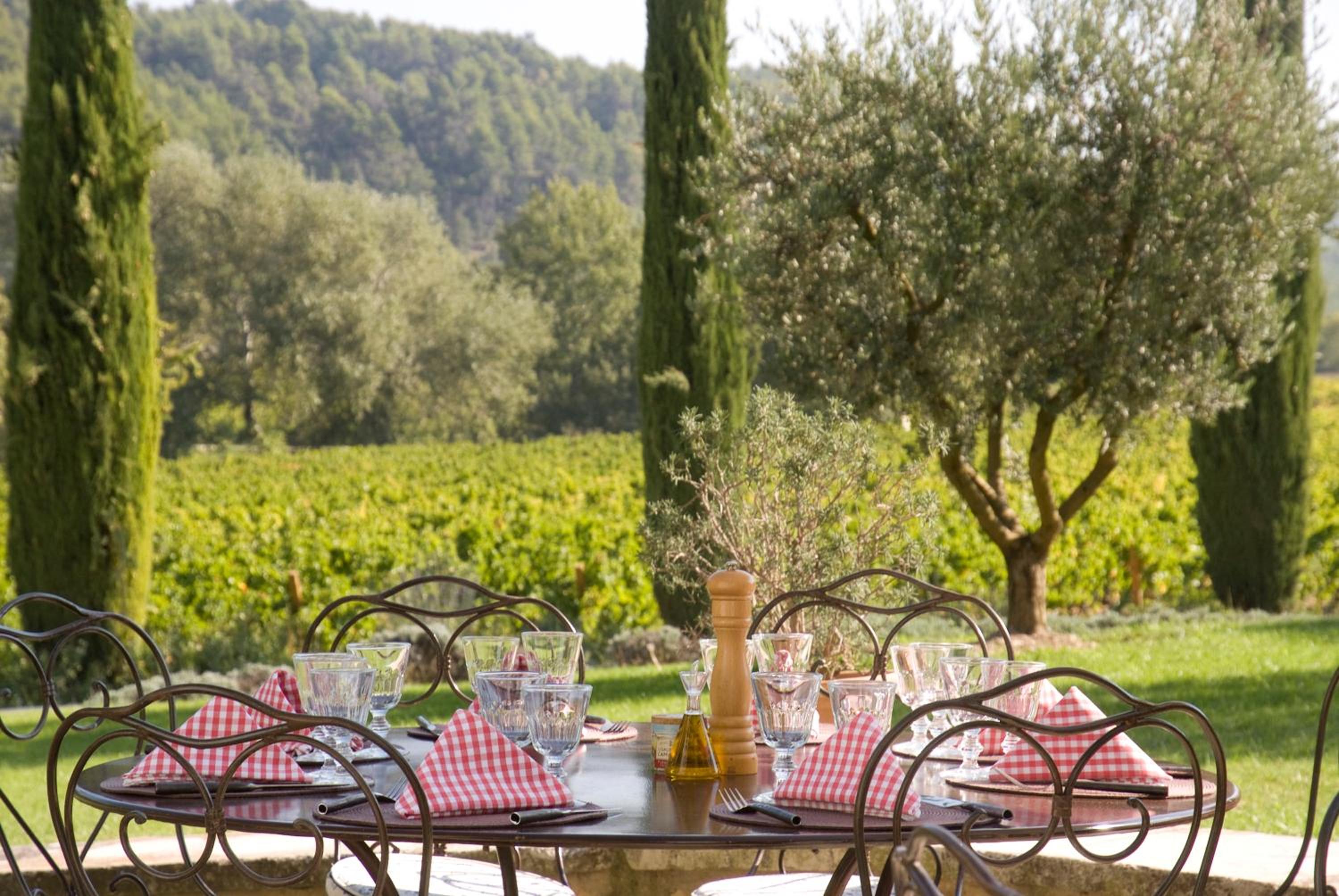 Set in beautiful gardens, alongside the vineyards, with two swimming pools. Dinner was delicious and the tables were outside on the terrace. It was really charming.