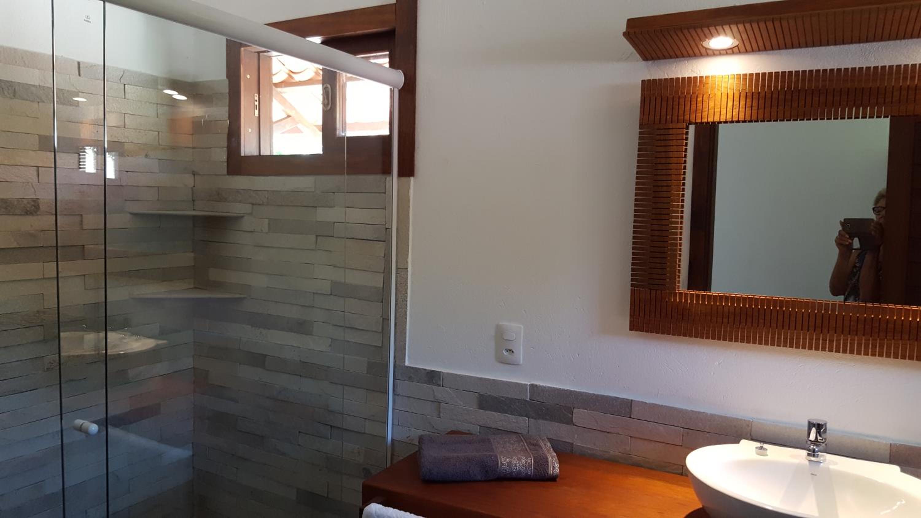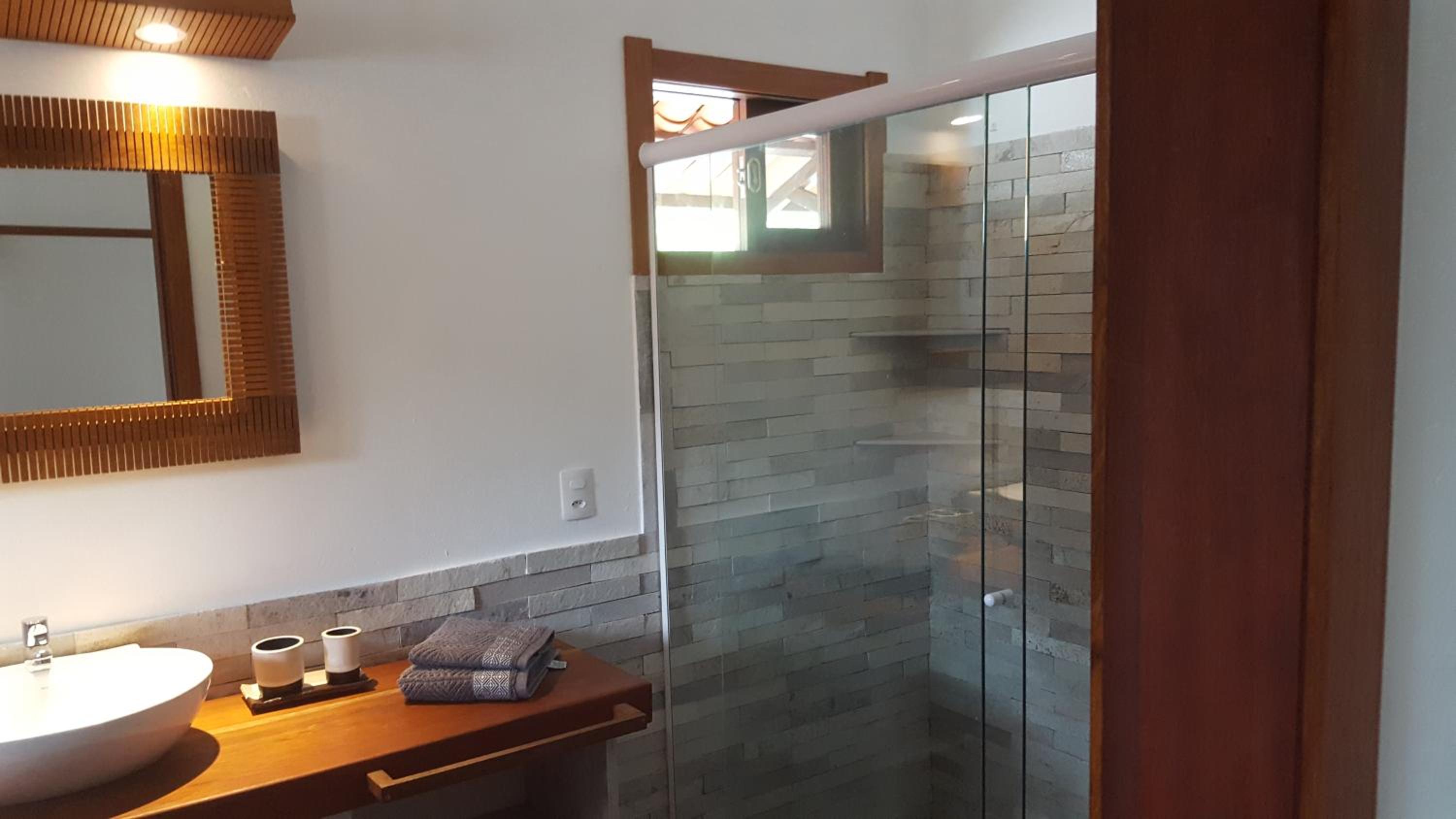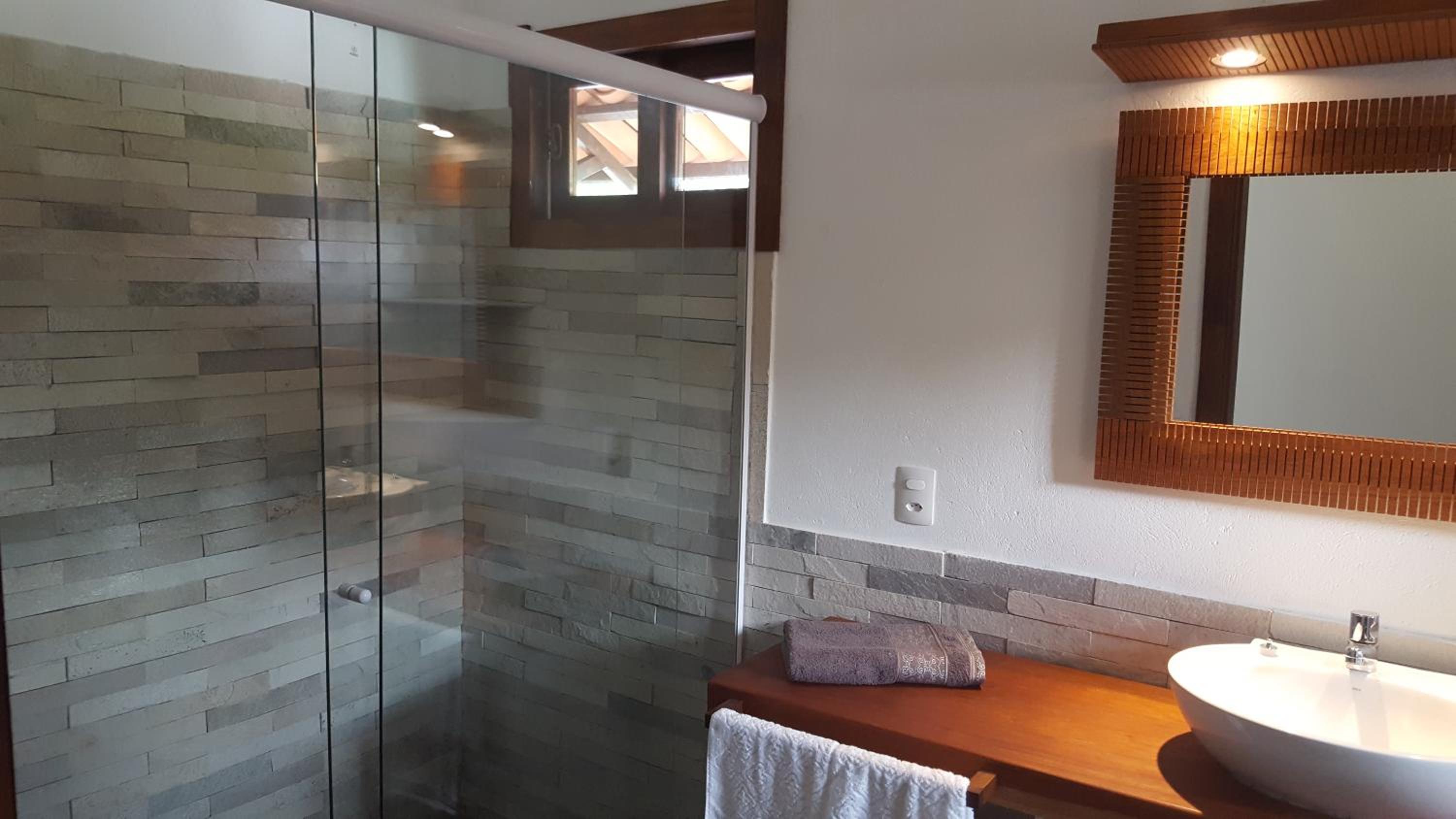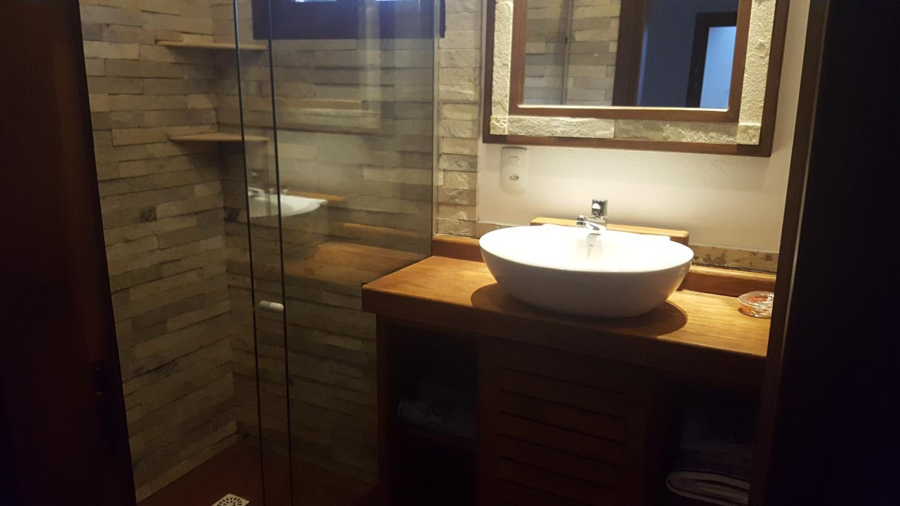 Os banheiros seguem a pegada do chalé, bastante espaço e pressão no chuveiro garantem um banho maravilhoso.