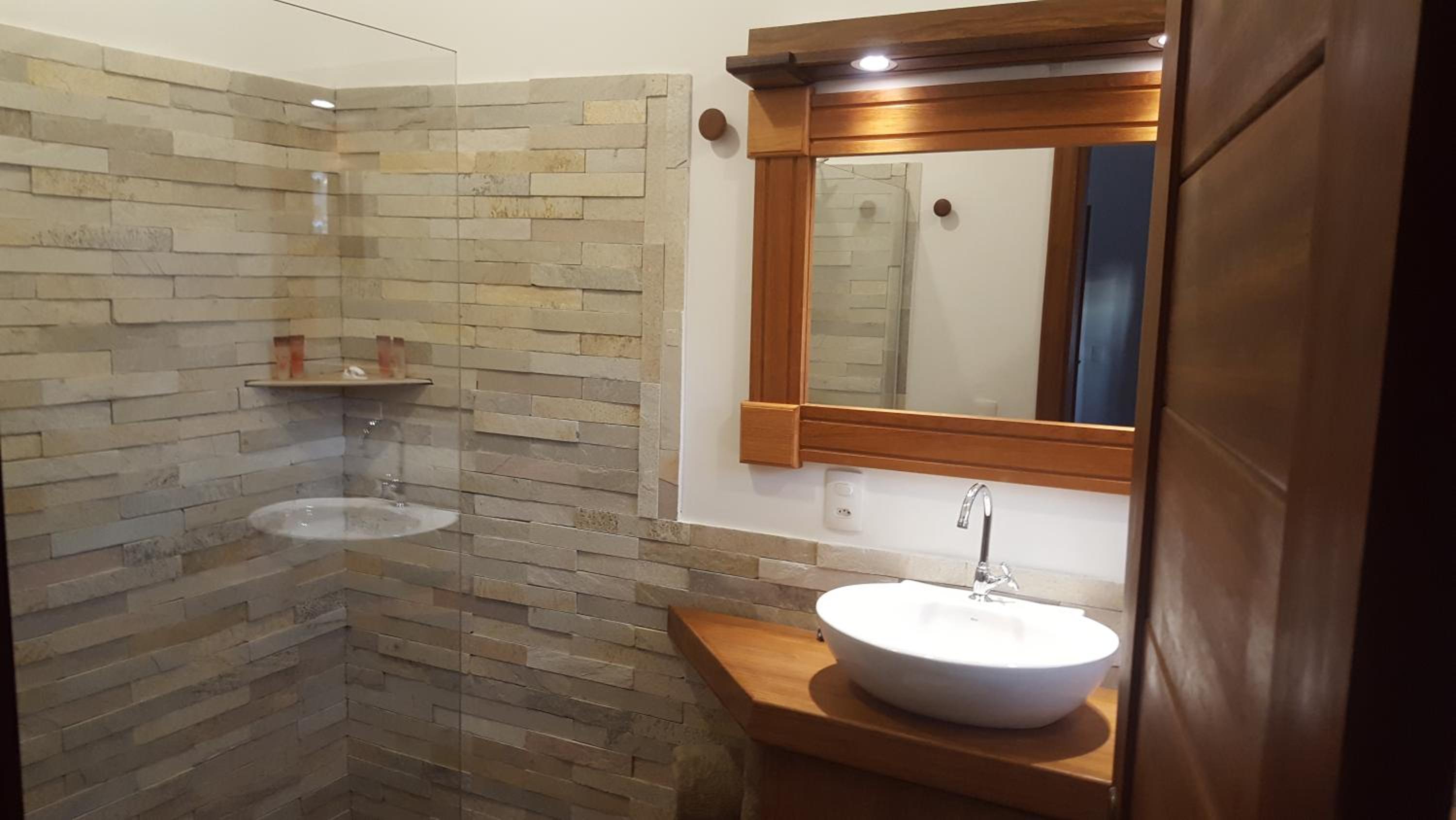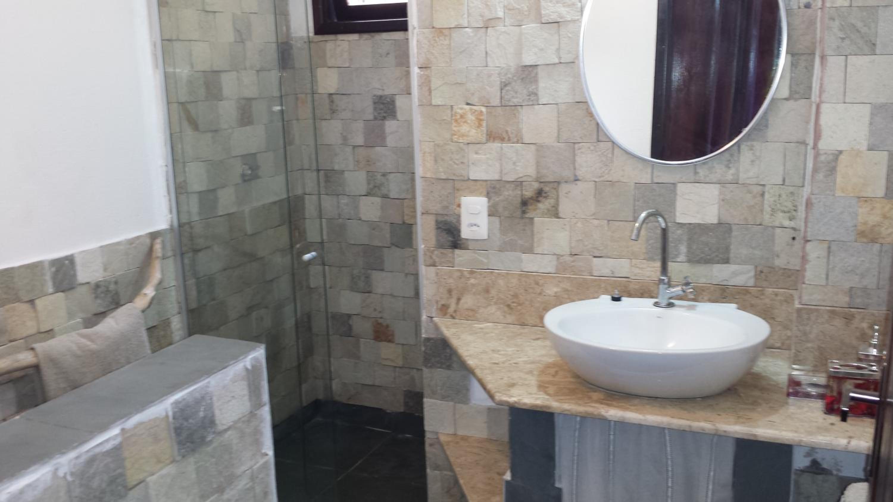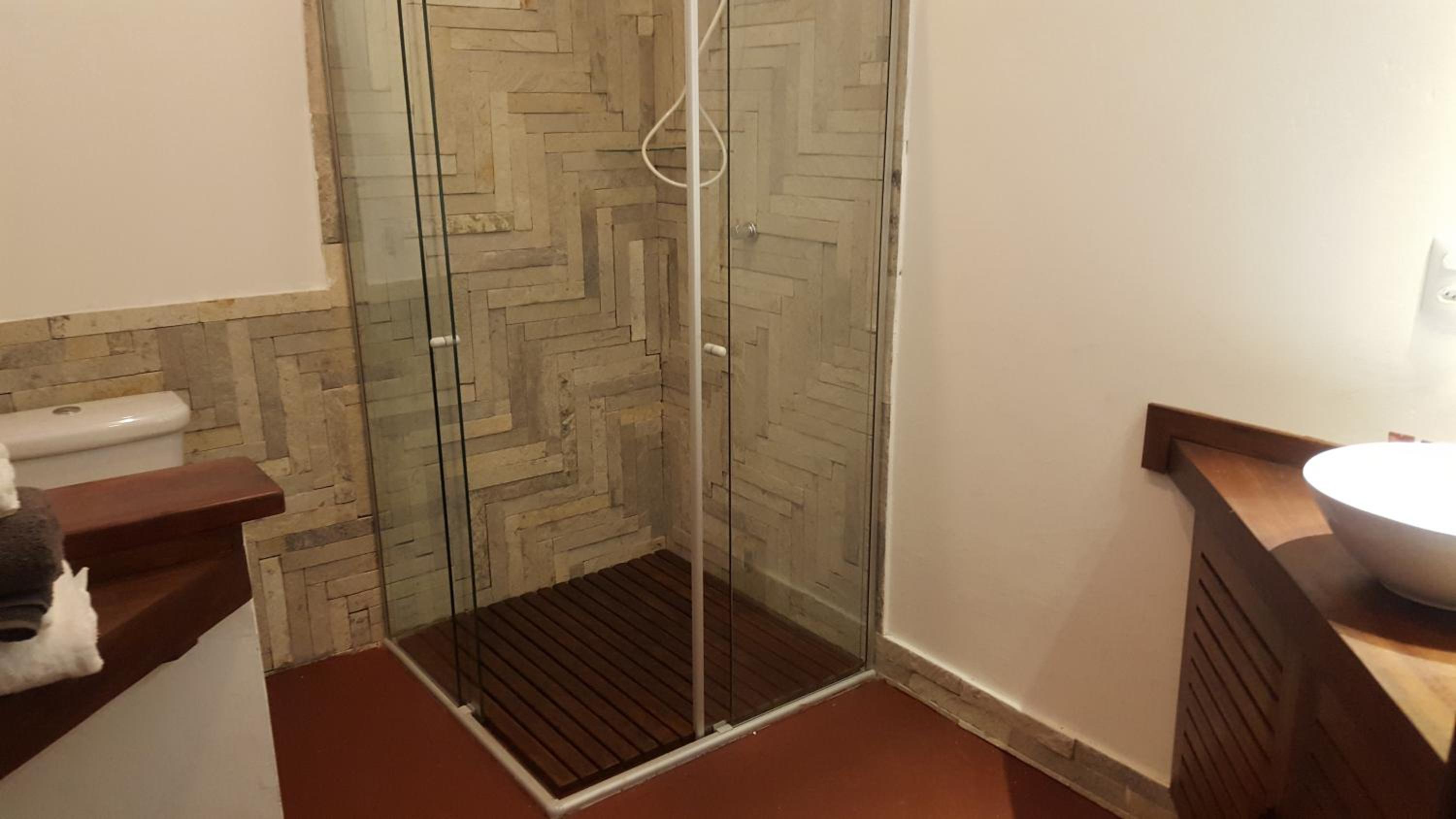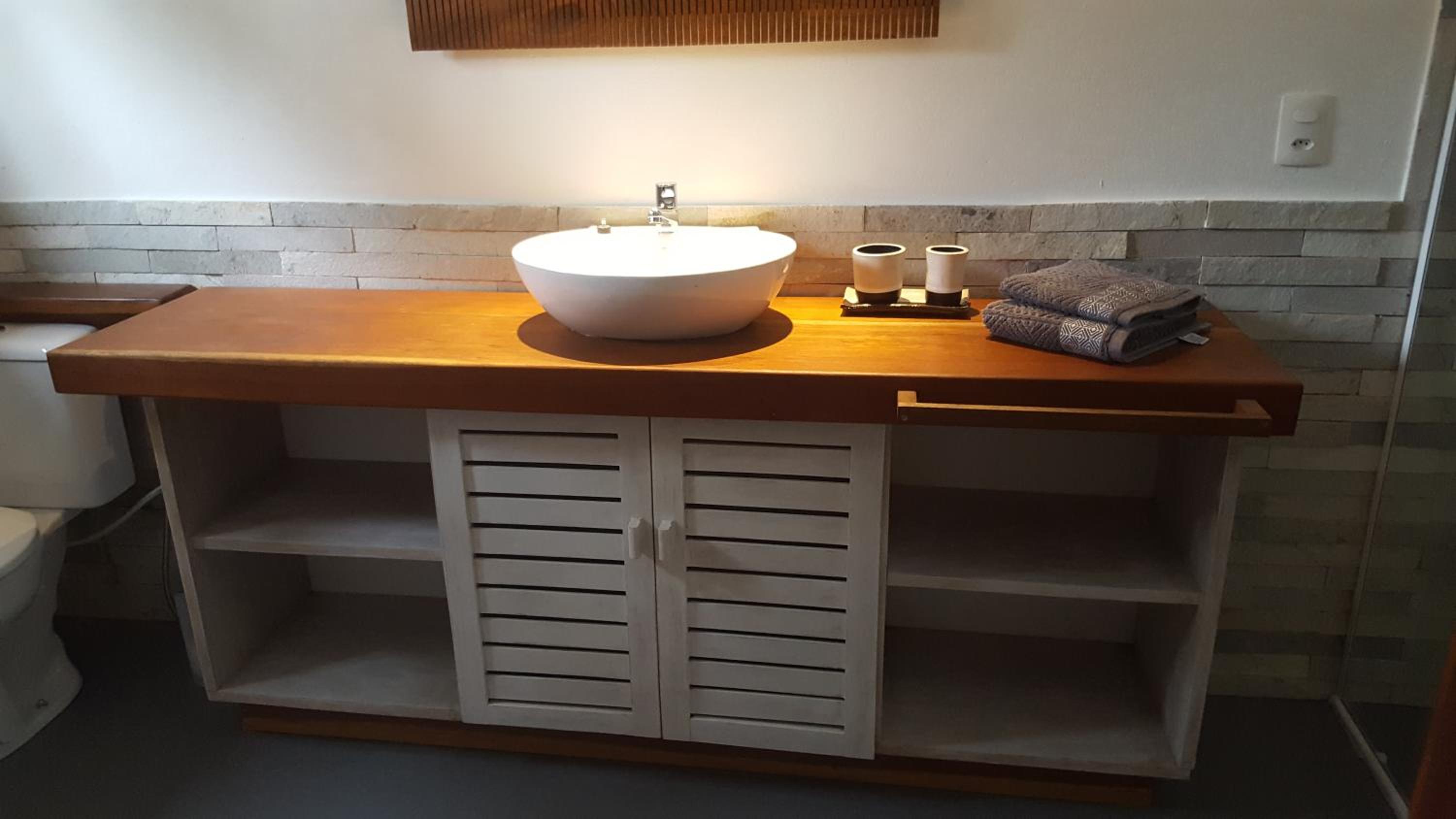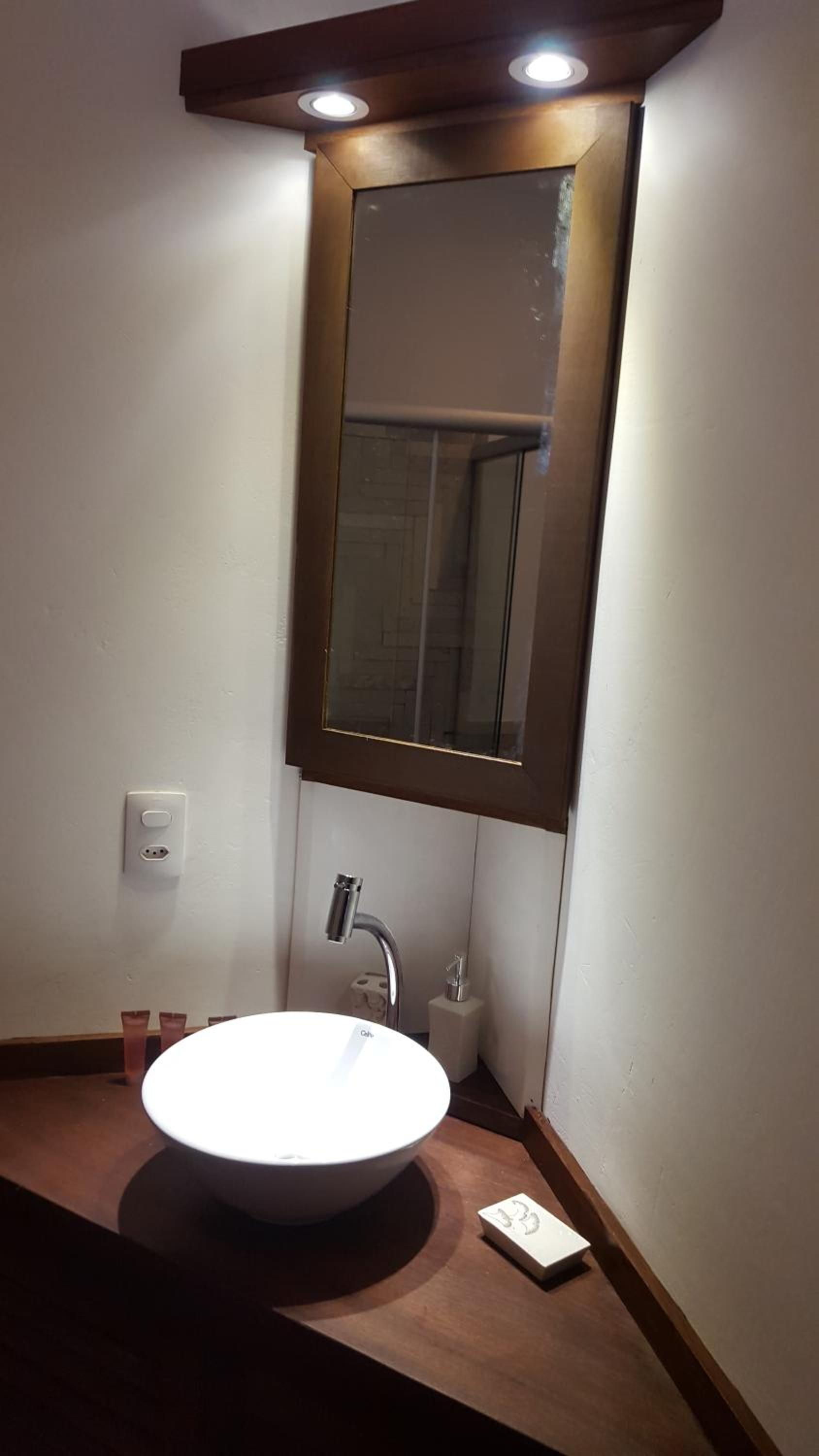 Os banheiros seguem a pegada do chalé, bastante espaço e pressão no chuveiro garantem um banho maravilhoso.