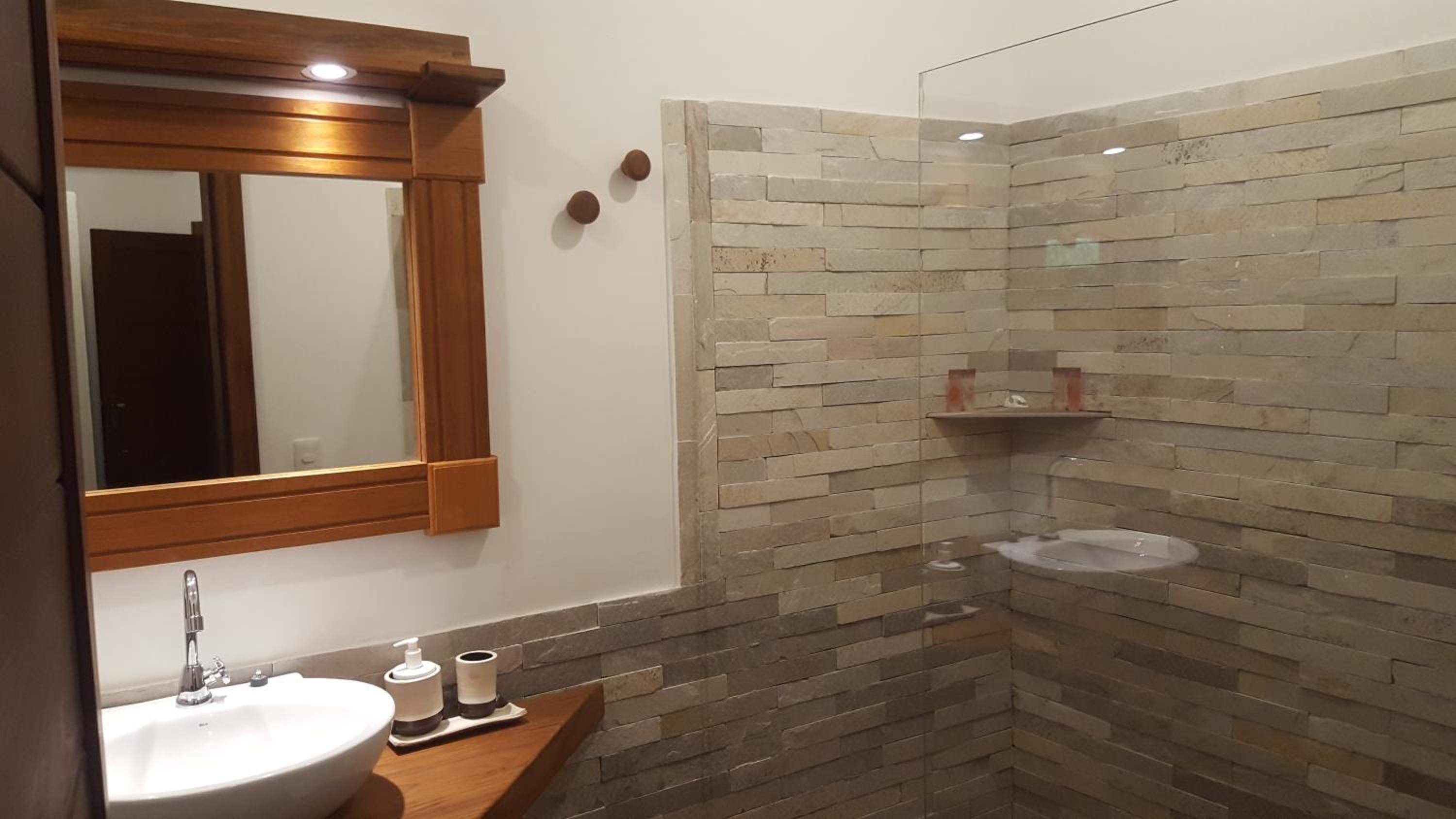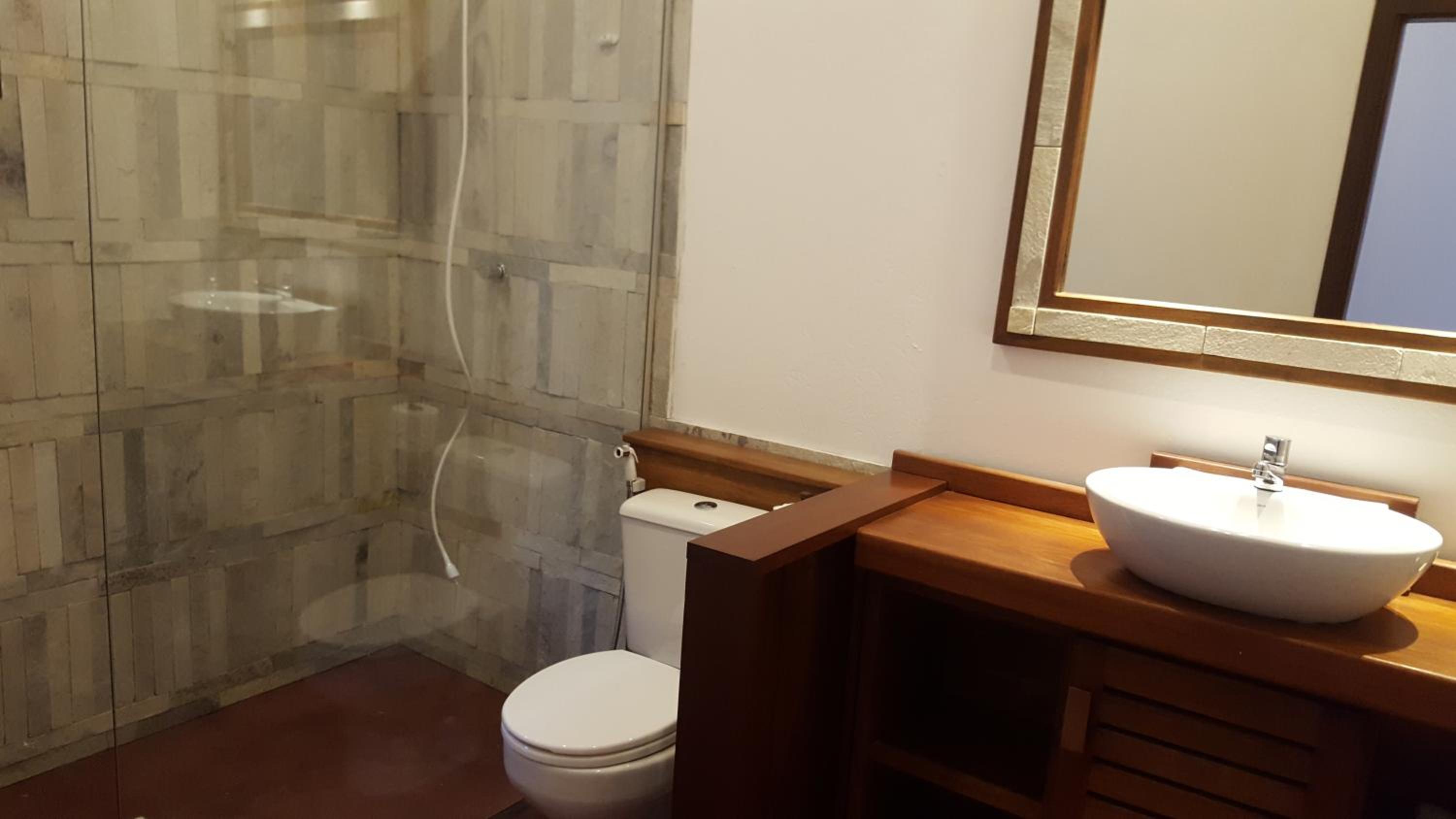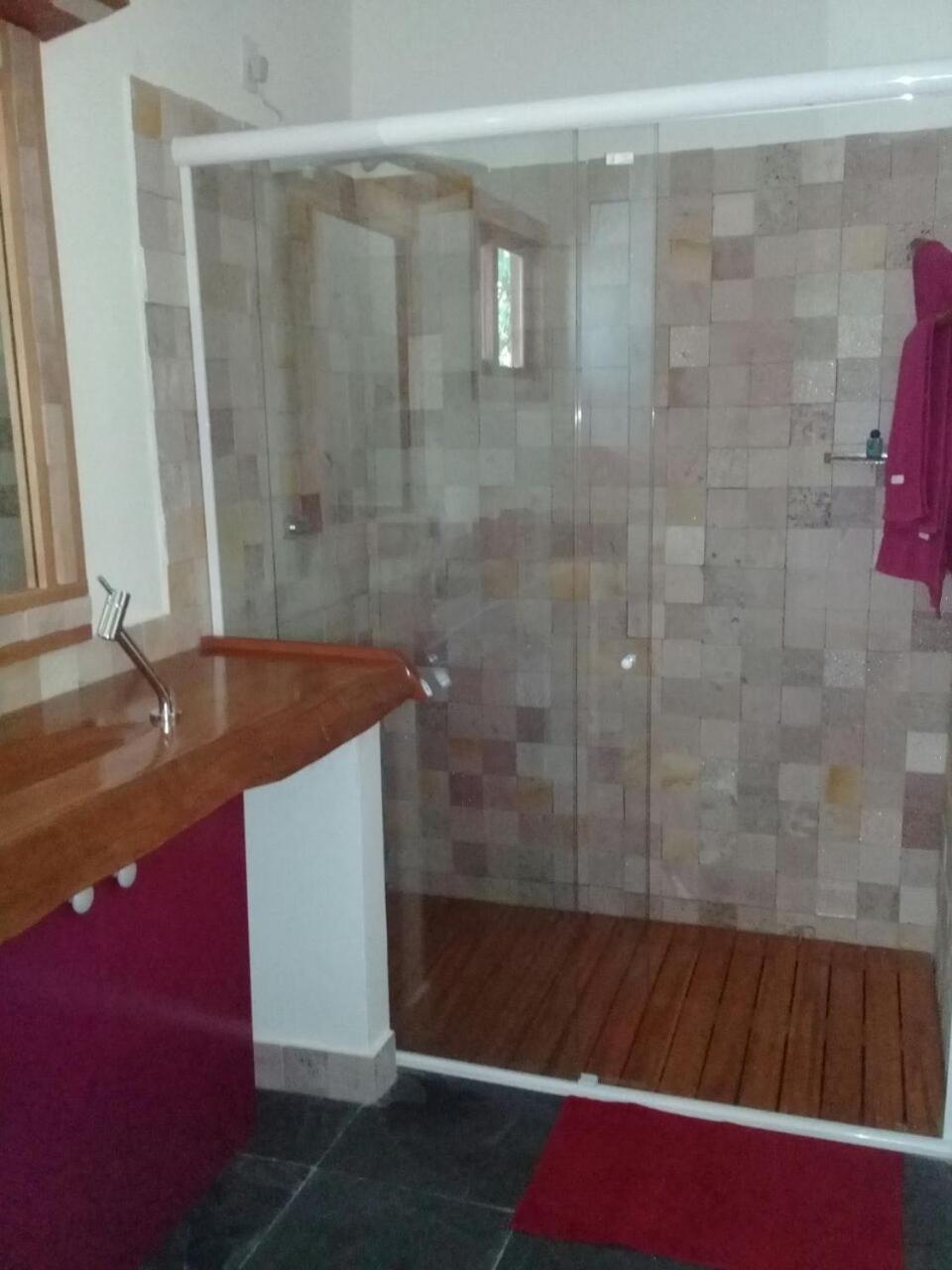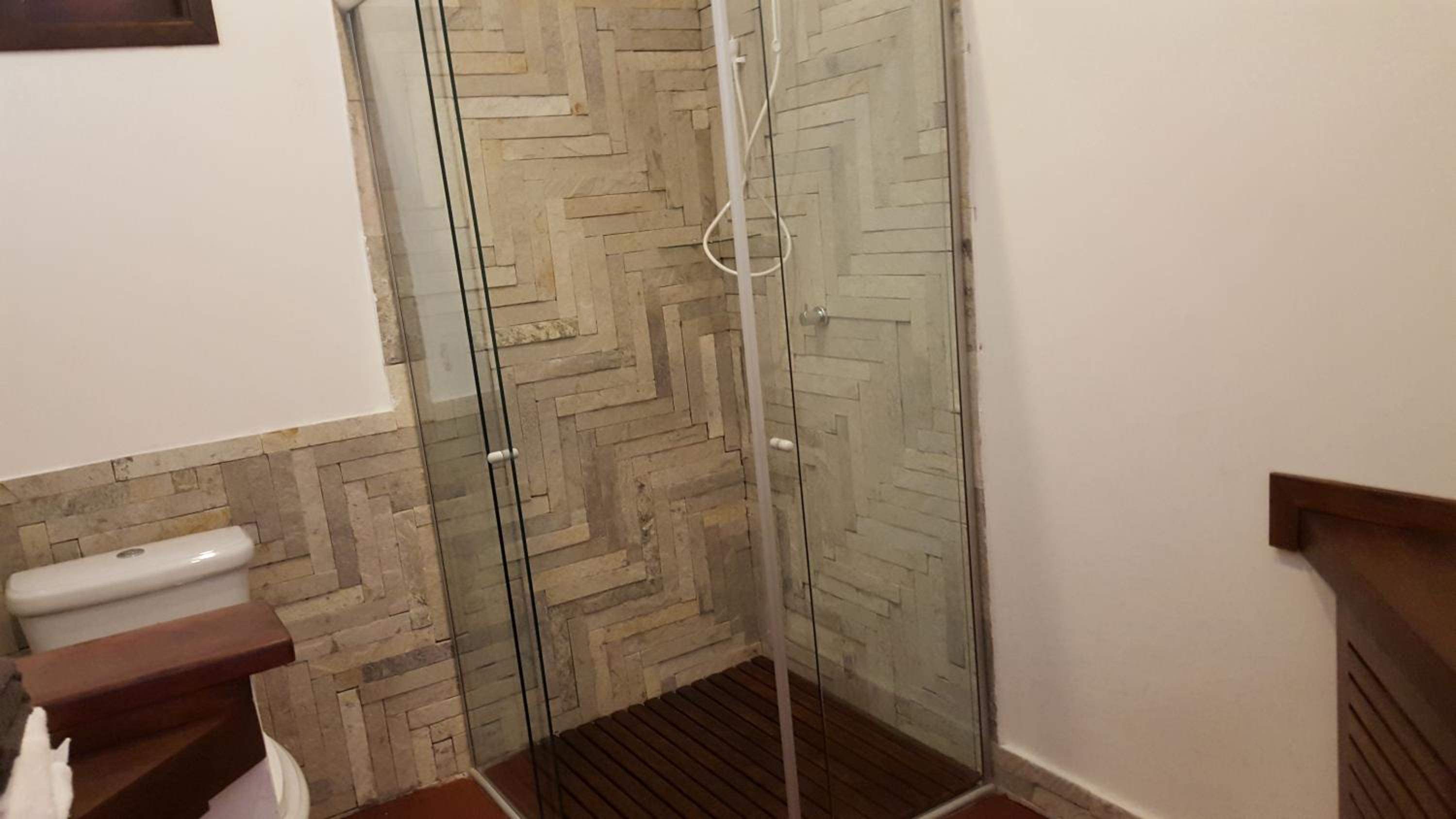 Os banheiros seguem a pegada do chalé, bastante espaço e pressão no chuveiro garantem um banho maravilhoso.