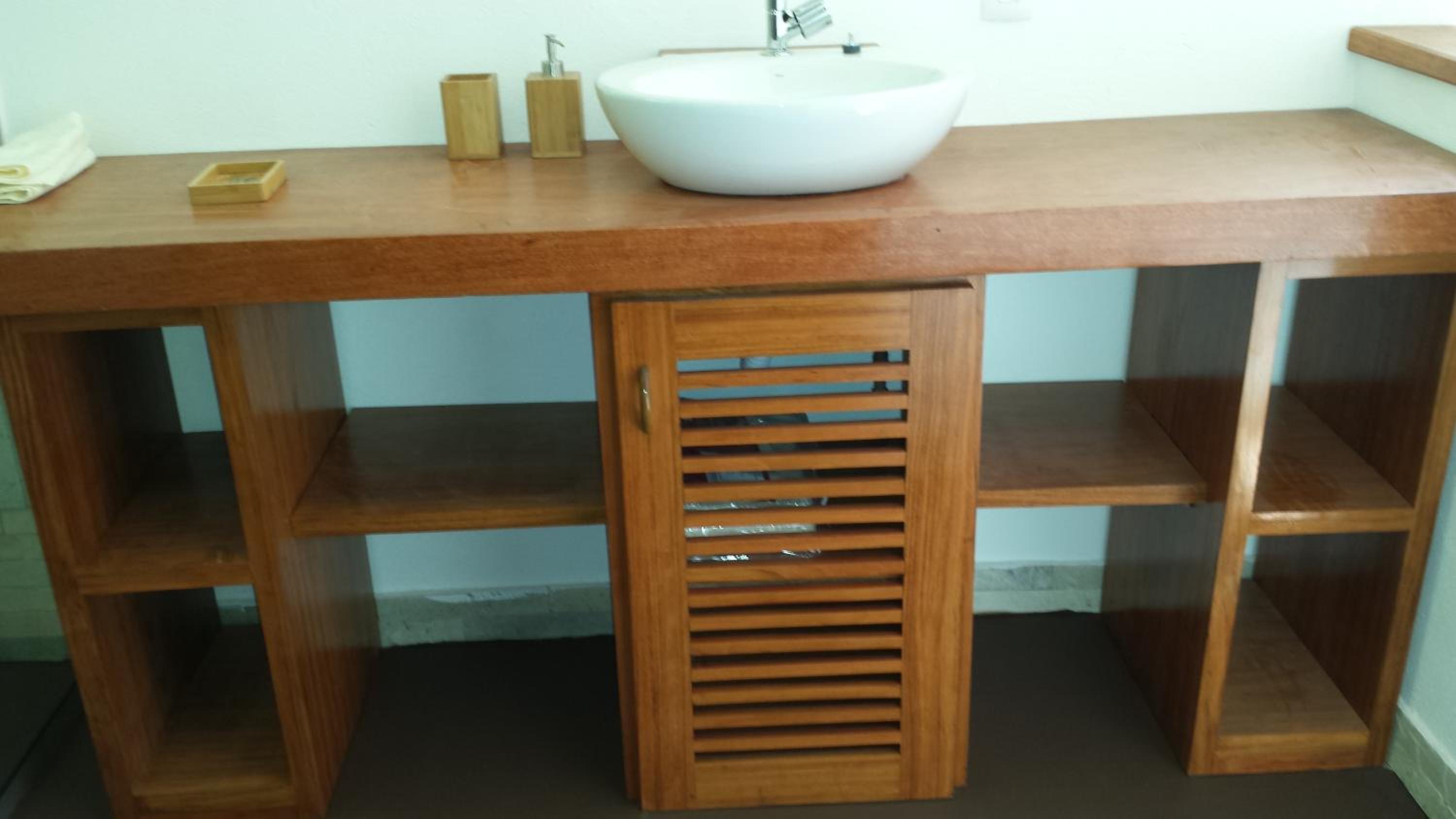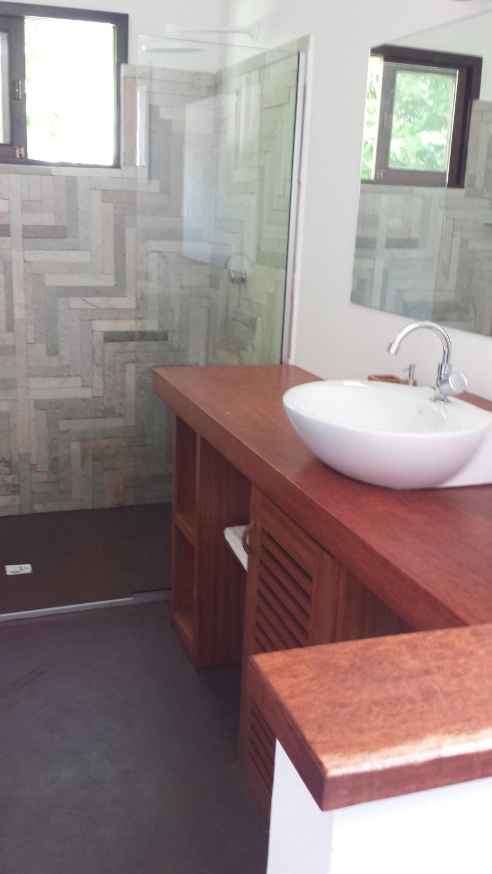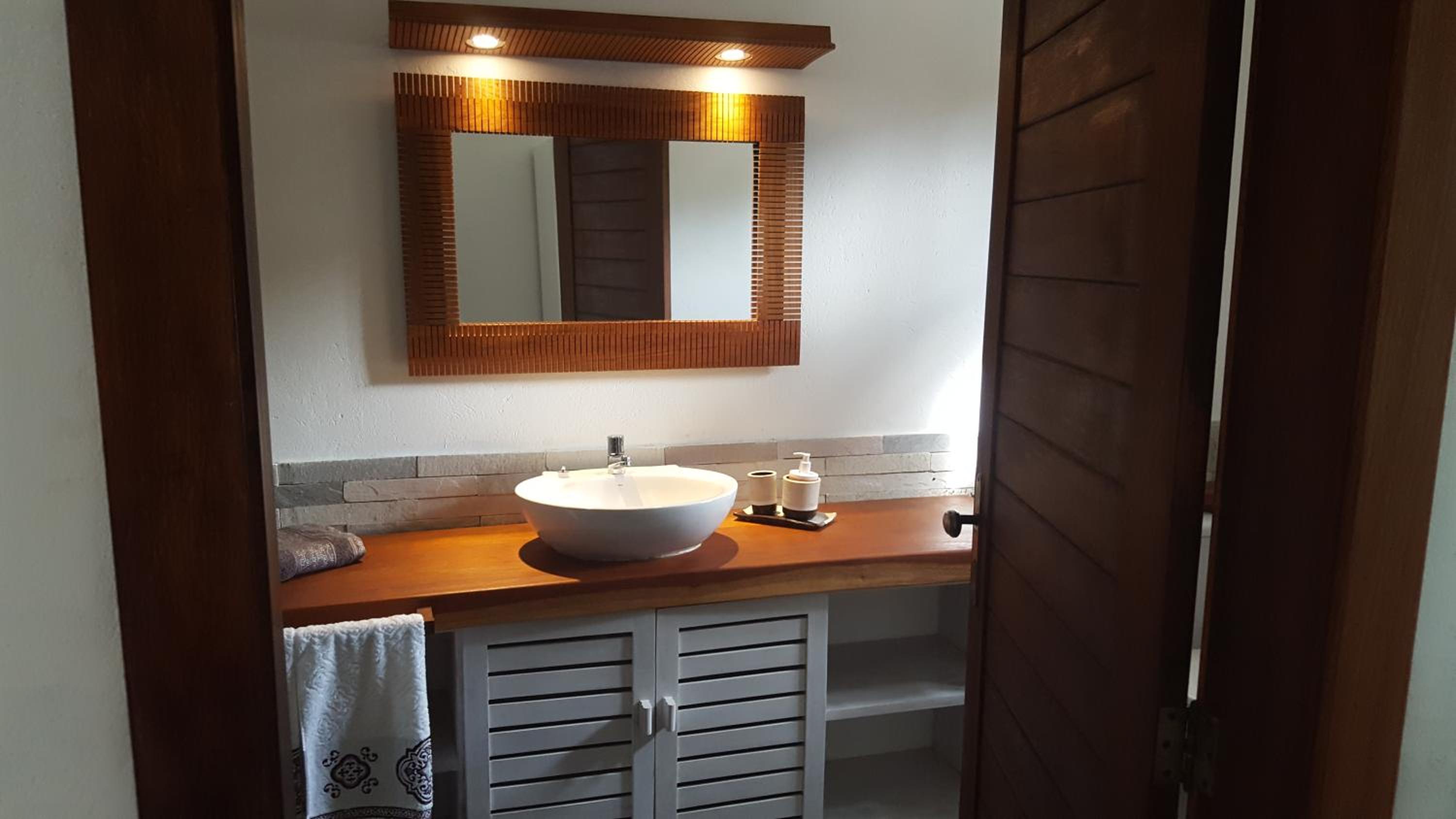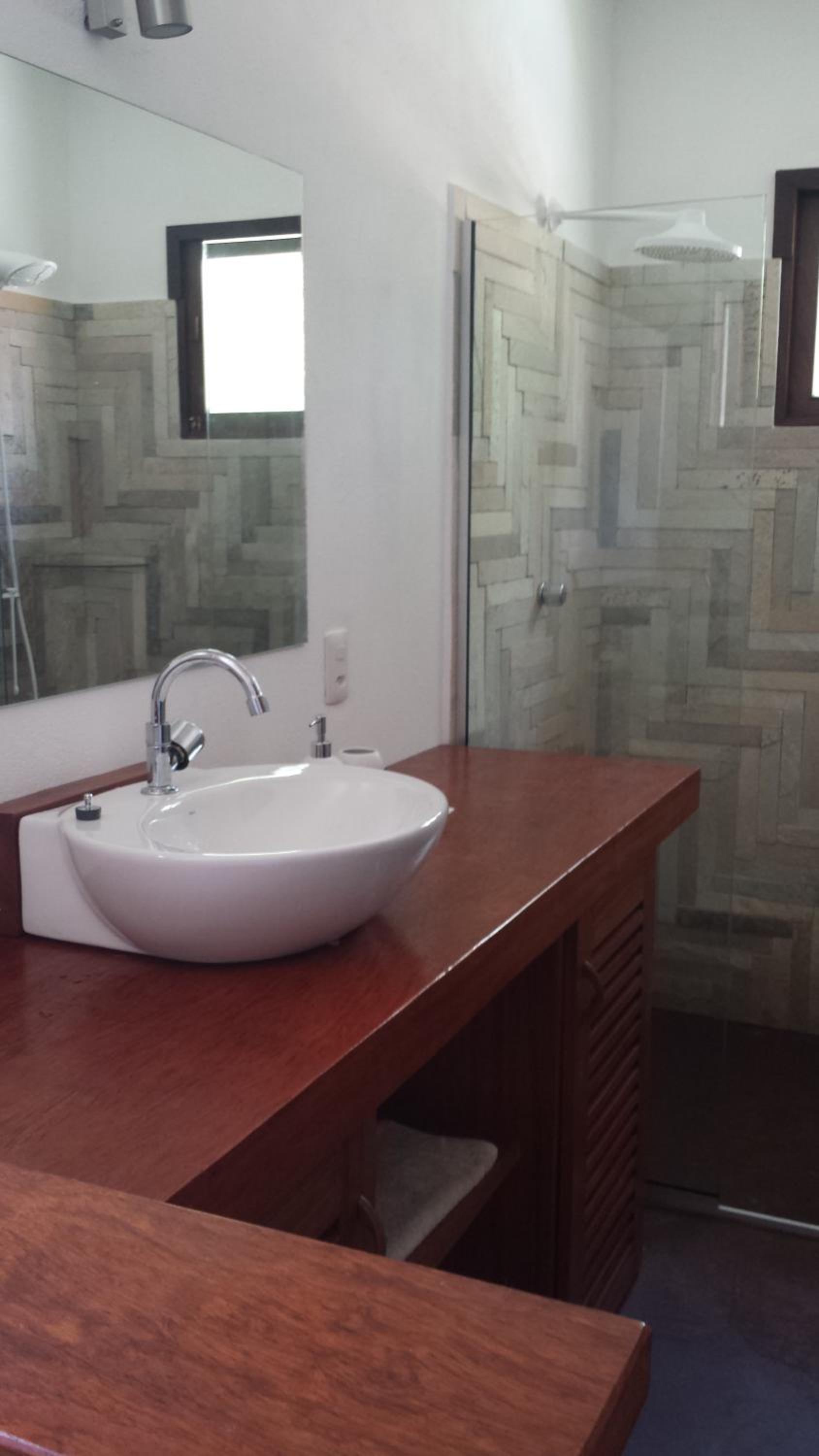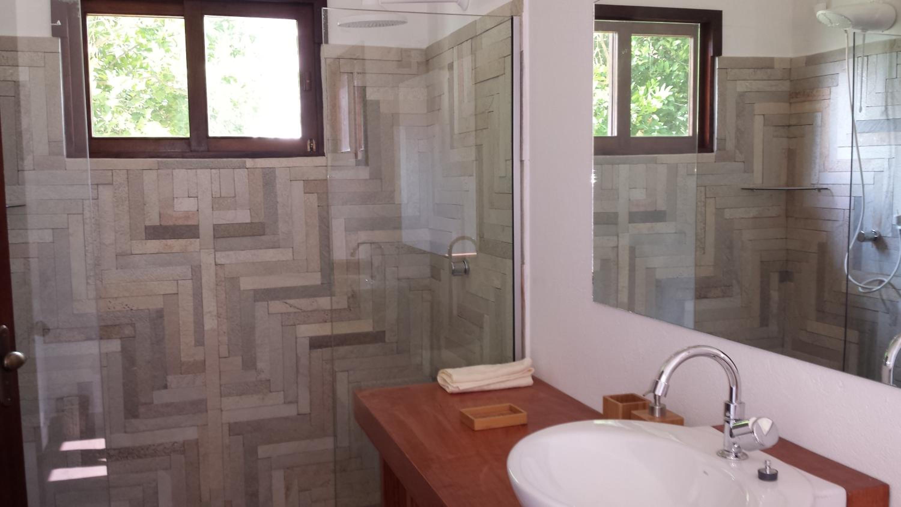 Os banheiros seguem a pegada do chalé, bastante espaço e pressão no chuveiro garantem um banho maravilhoso.