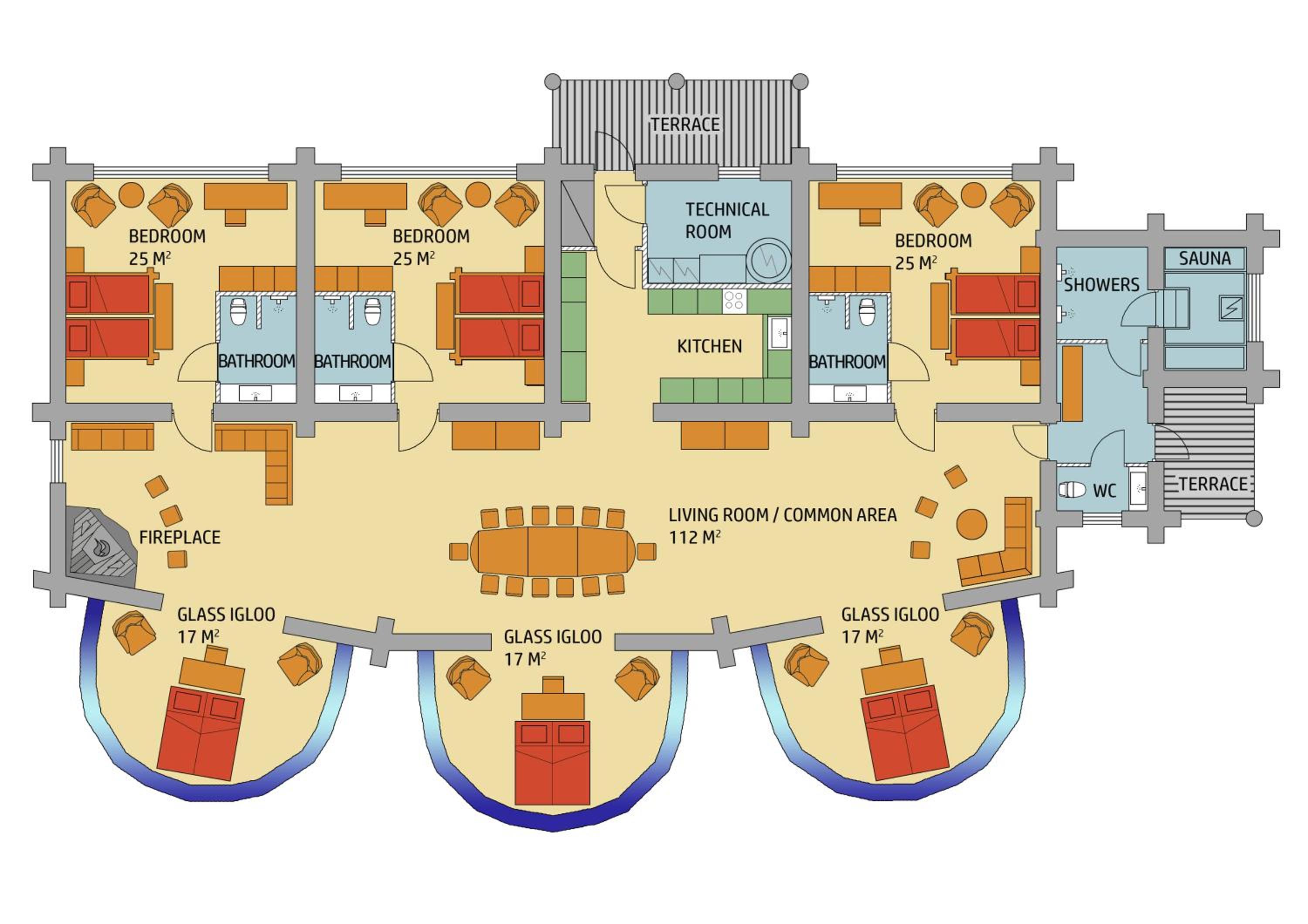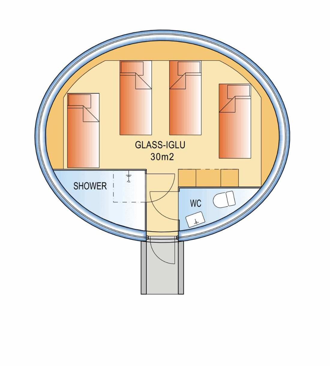The space was extremely cramped, and since there is no partition between the toilet and the bedroom, odors drift throughout the entire igloo. Furthermore, the ceilings are incredibly low; the passageway is so low that I kept hitting my head, which resulted in a bloody nose and bruises. The bedding and curtains felt very cheap with a terrible color scheme; there was absolutely no visual enjoyment. Although it’s a double room, it is only suitable for one person. Additionally, you can clearly see into other rooms from inside, and the door was so difficult to lock that we felt very insecure.
