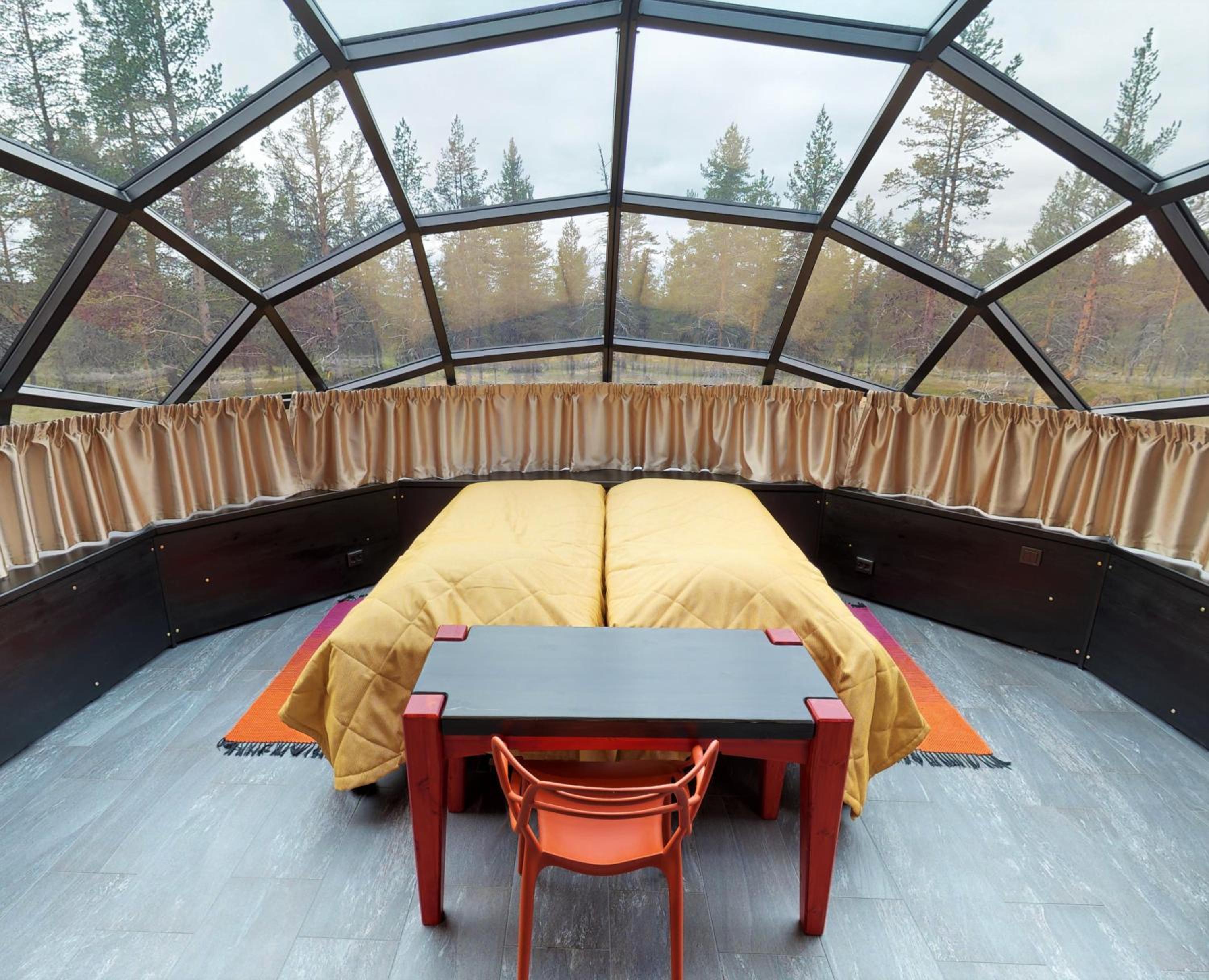 Twin small beds in glass igloo. And curtains were too short for a glass igloo