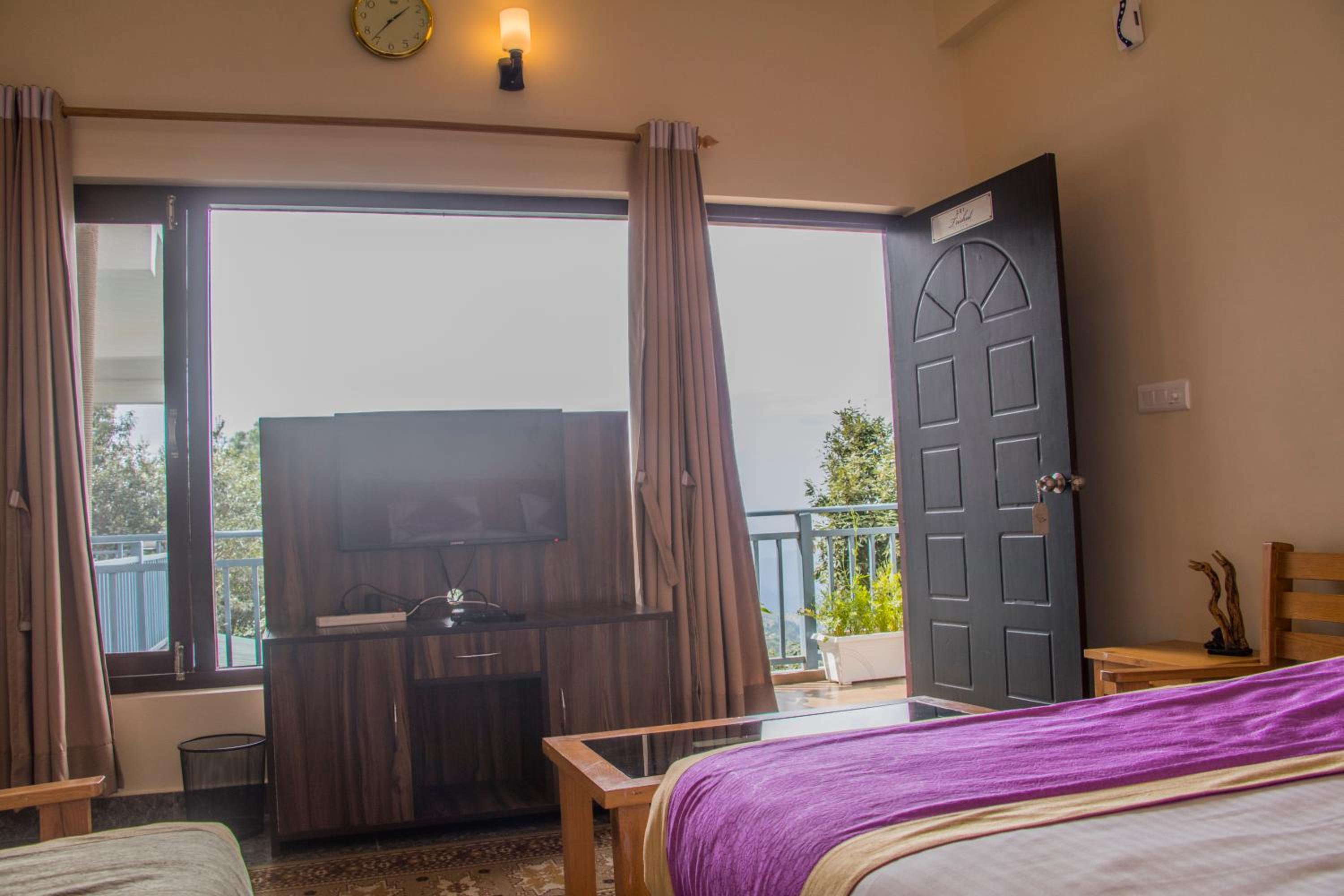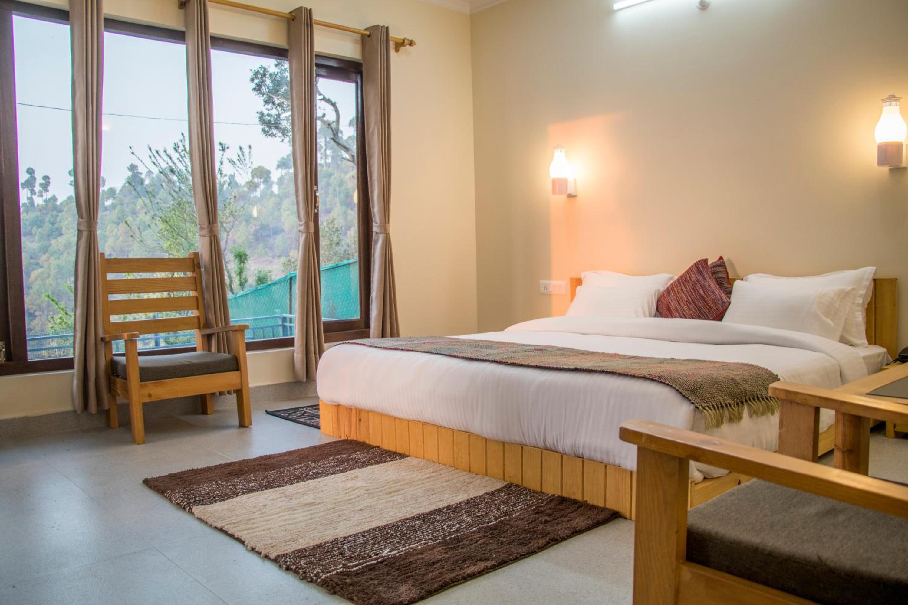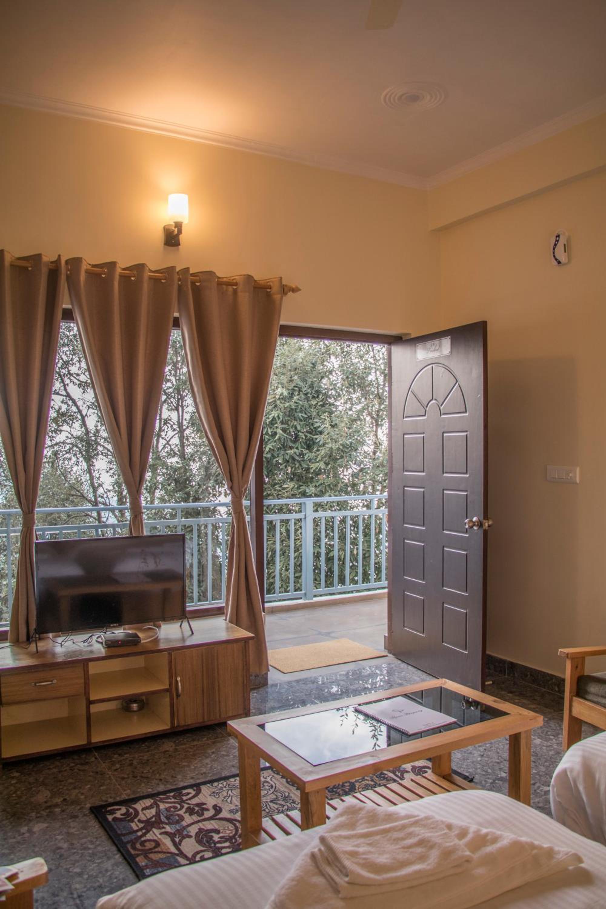 Alpine Rhapsody in Rānīkhet offers elegantly furnished guest rooms with modern amenities, ensuring a comfortable stay. Each room features a cozy seating area, a flat-screen TV, and a private bathroom stocked with complimentary toiletries.