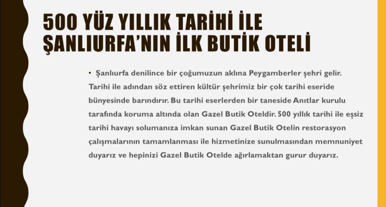 We had a wonderful stay at Gazel Butik Otel, Mr. Fuat and Mr. Adnan were extradinarily hospitable, friendly, and took care of us like Family. The hotel had an amazing view of Abraham's Pool, Urfa Castle, and minutes from Sanliurfa Archeological Museum. We used Mr. Adnan service to take us on several wonderful tours of wherever we wanted to go ( Goblekitepe, Karahantepe, Halfeti, etc.); we felt like the honored guests.