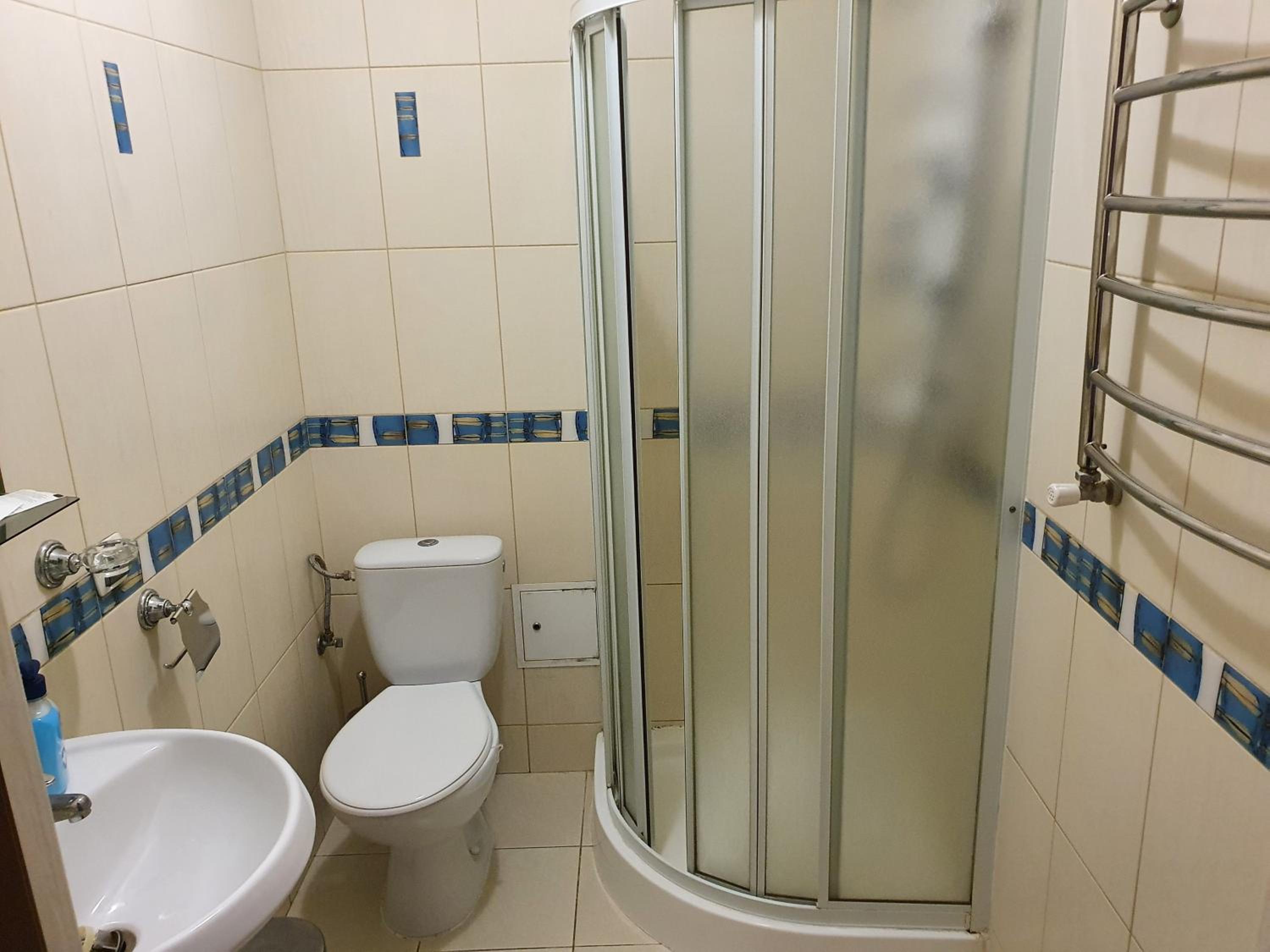 Наявні туалетні та кухонні принади, телевізор, чайник, холодильник (правда шумний), не особо важко по паркуванню.