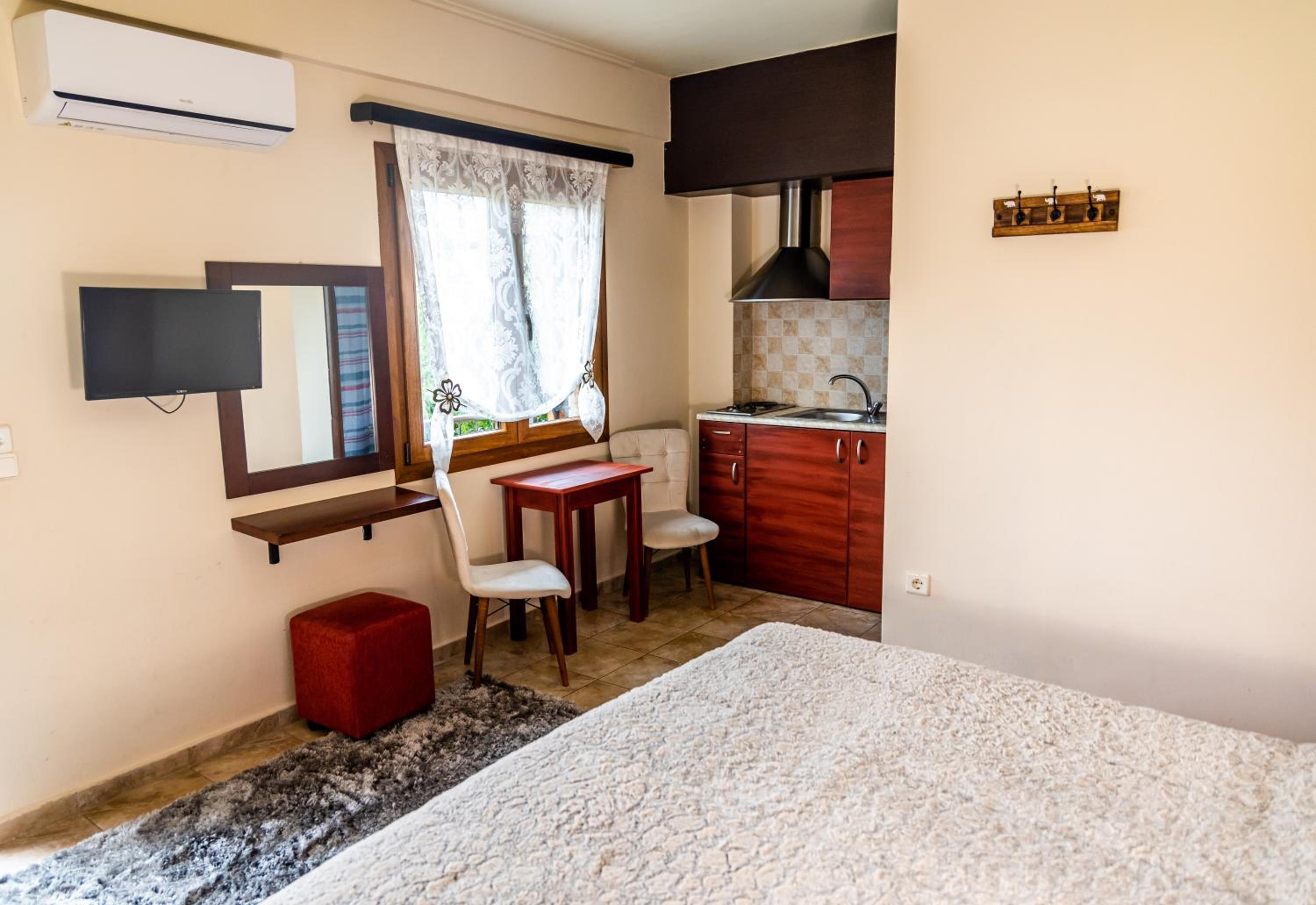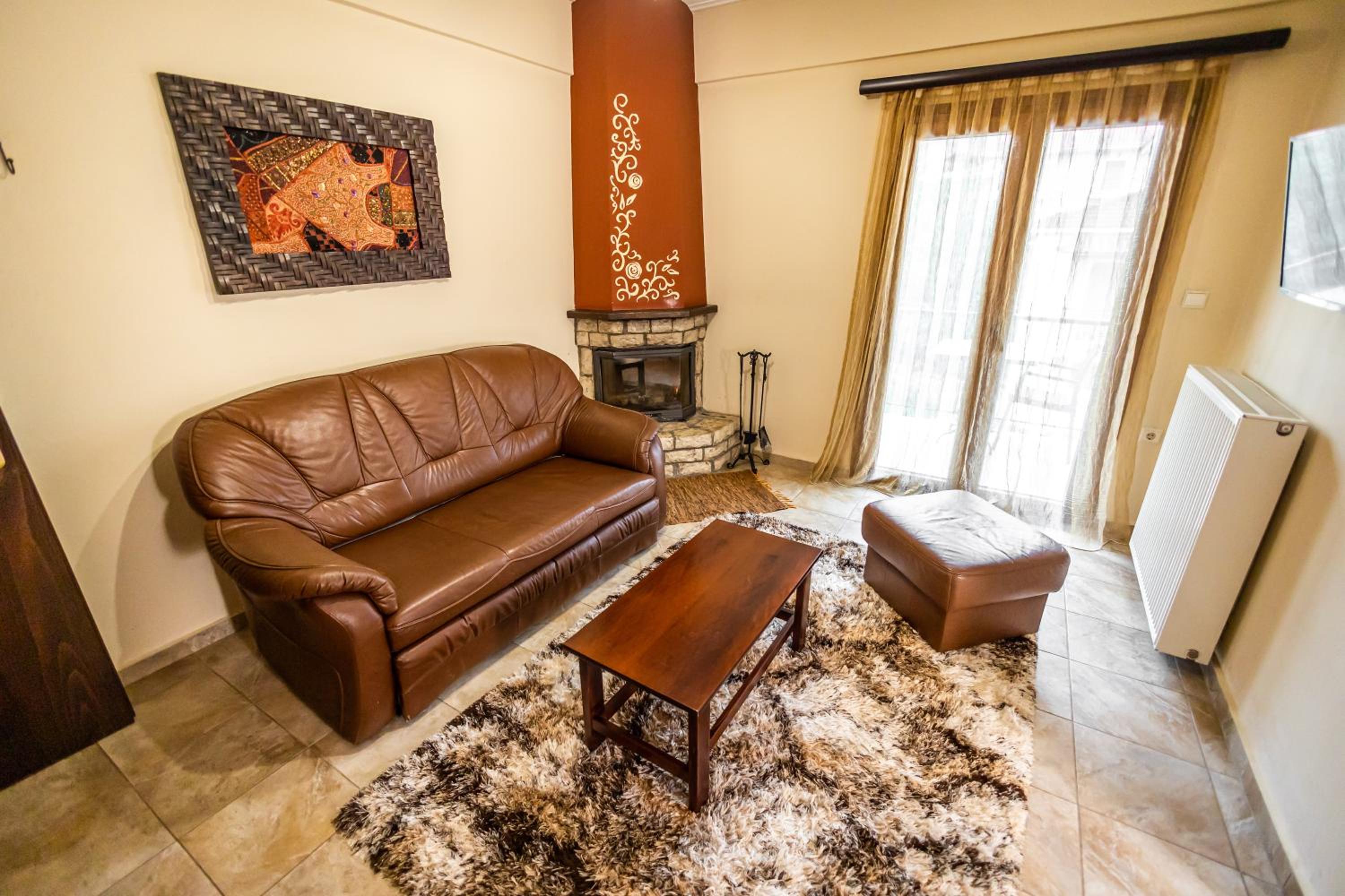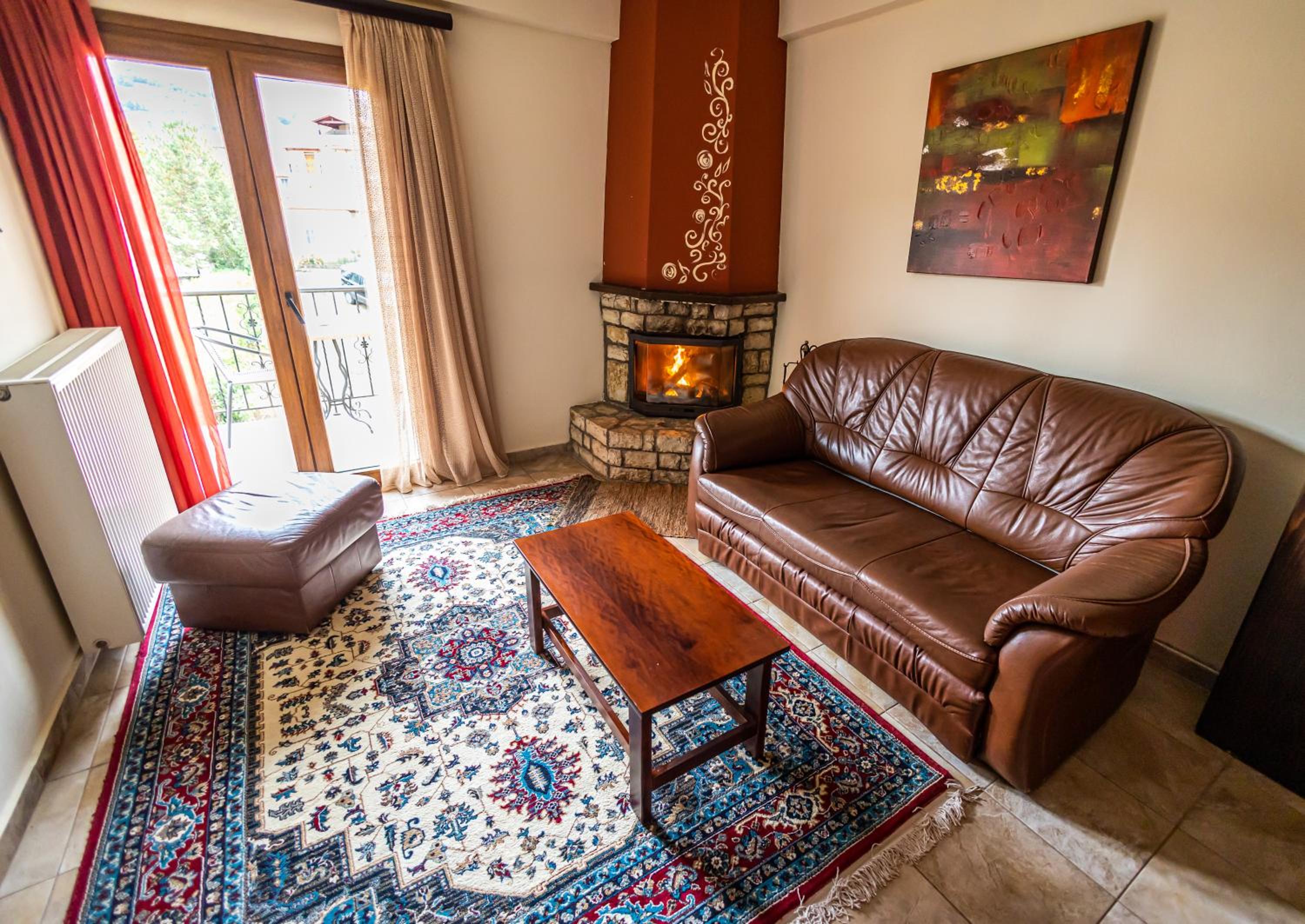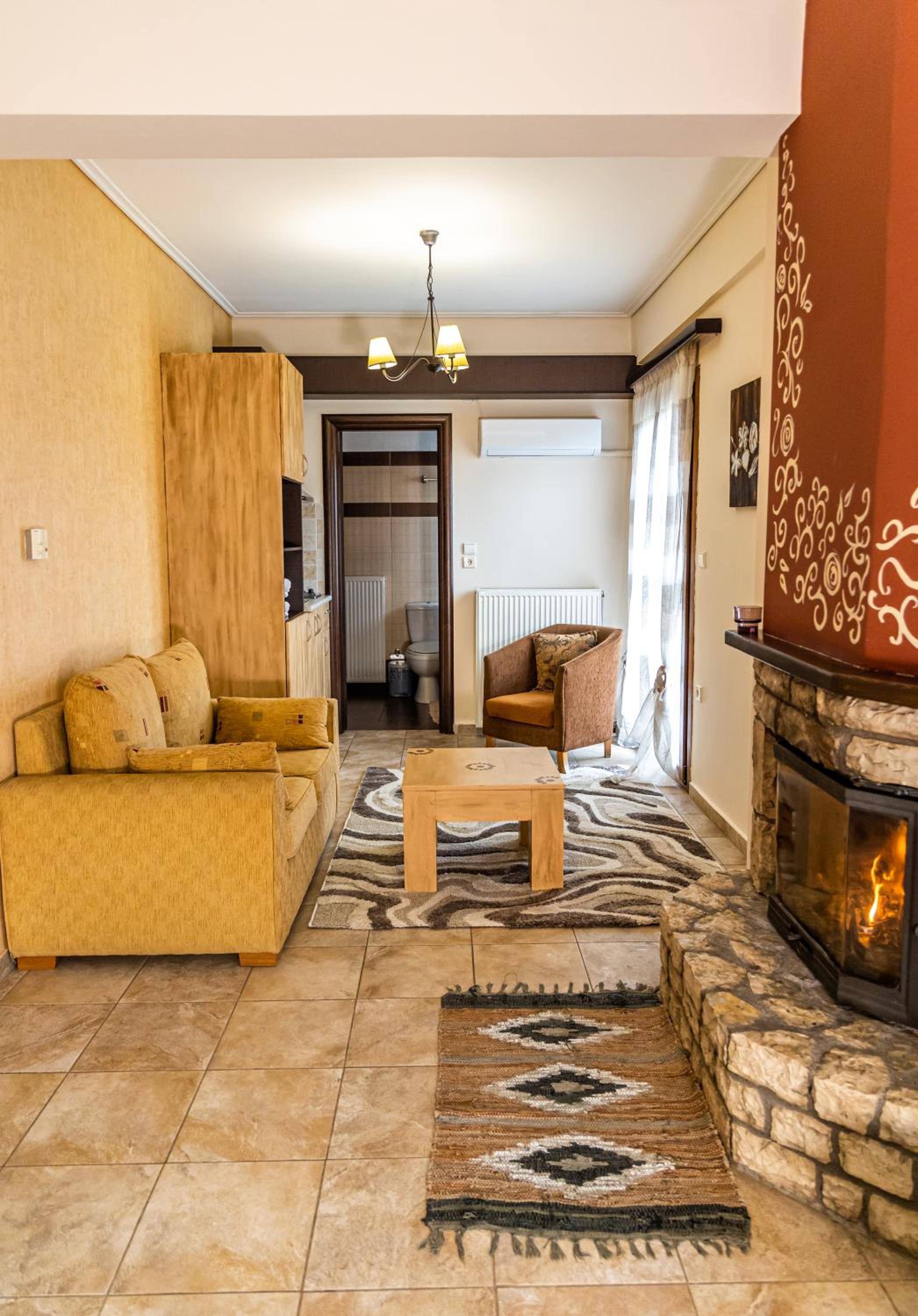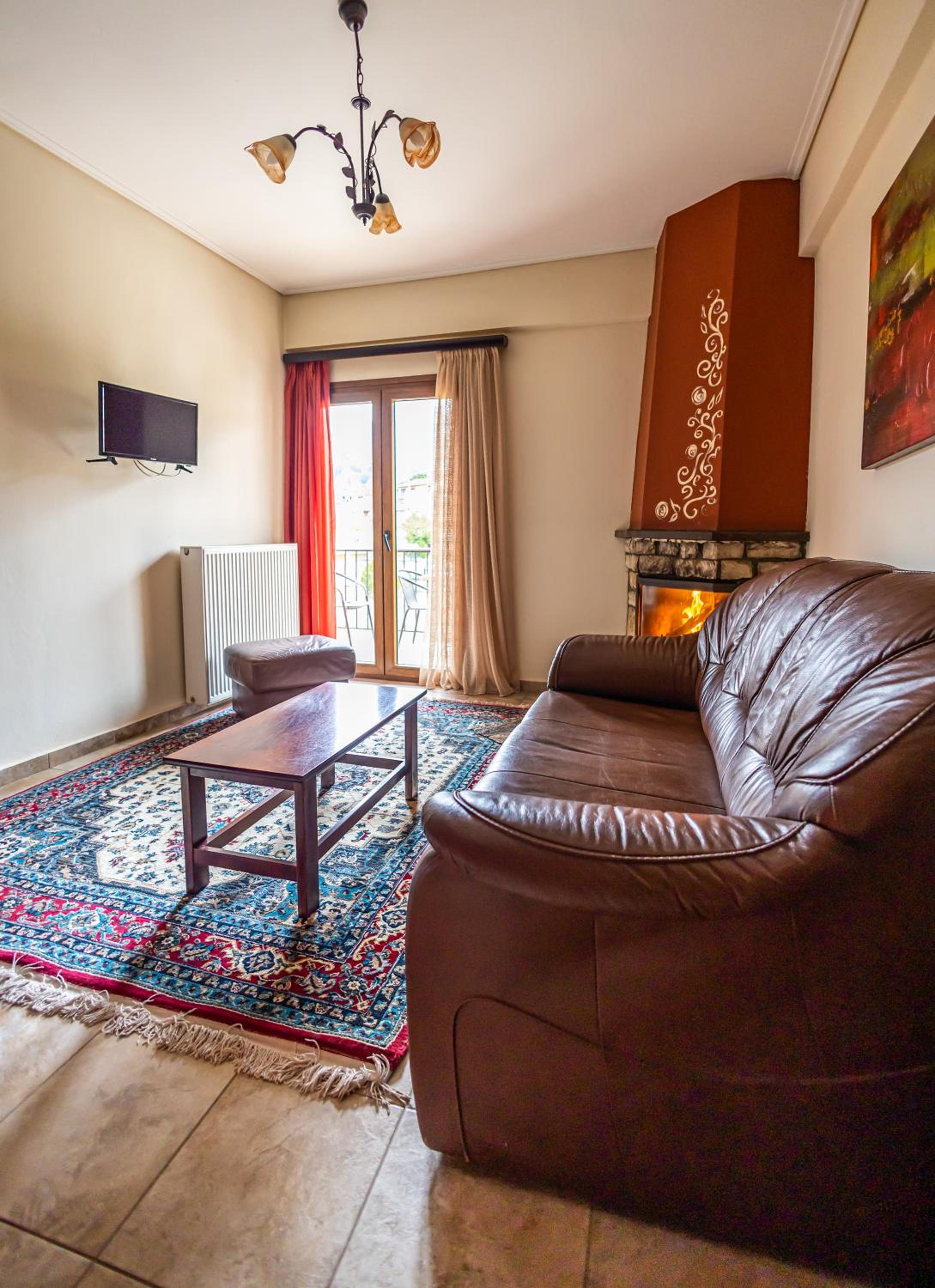 Indulge in our spacious suites and studios at Enastron, each equipped with a kitchen or kitchenette, a cozy seating area with a flat-screen TV, and a private balcony offering stunning views of Helmos Mountain. Upgrade to a unit with a fireplace for added comfort and charm.