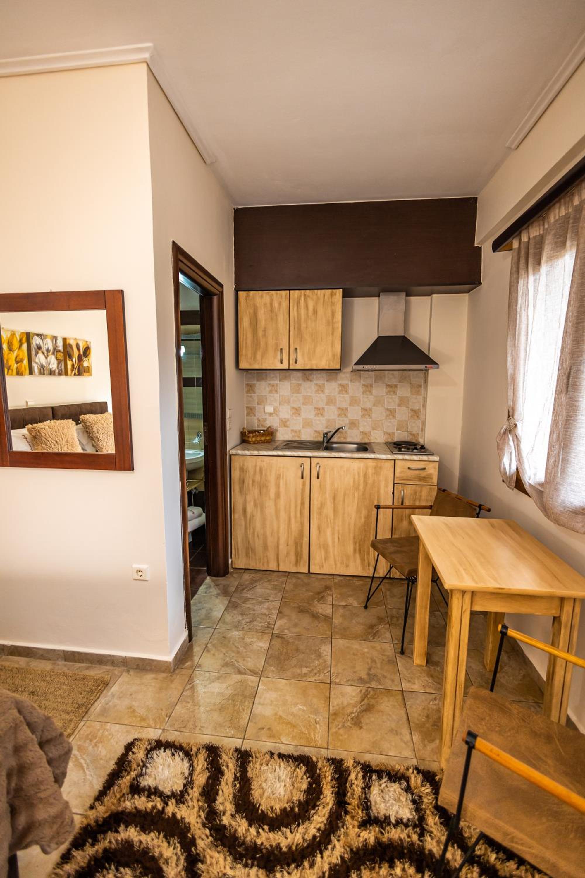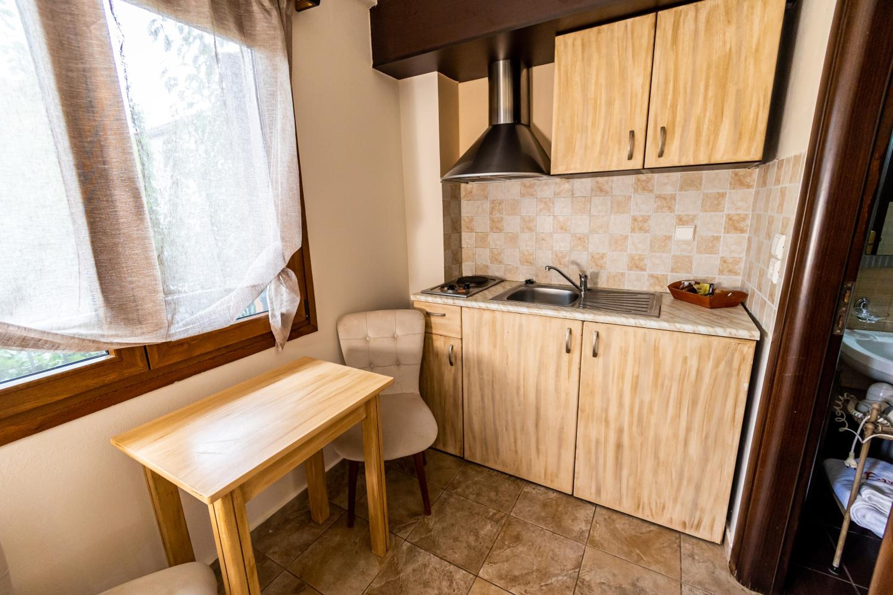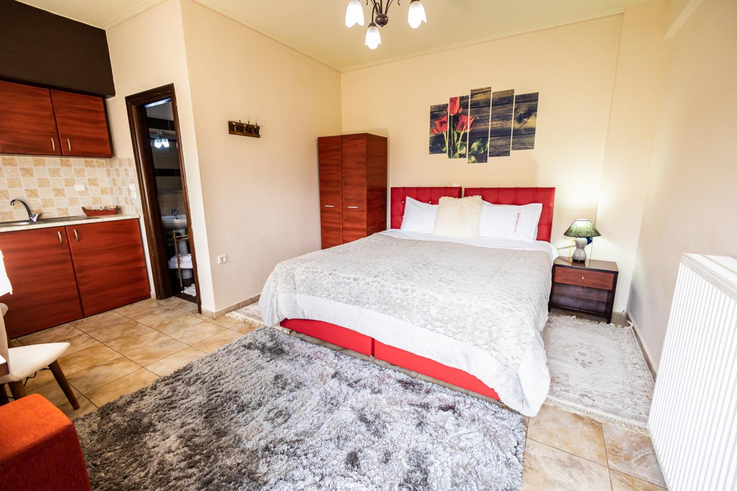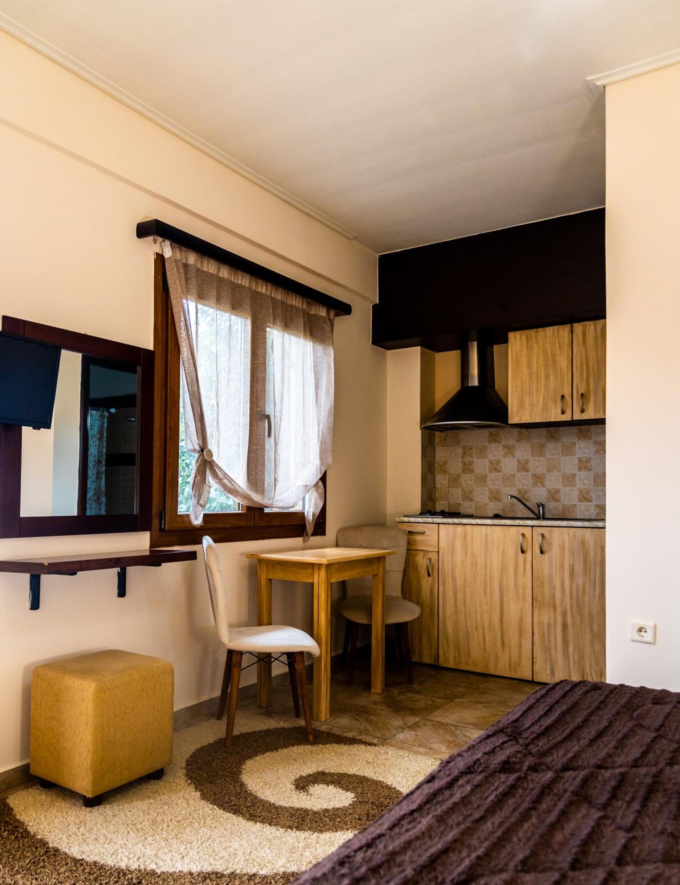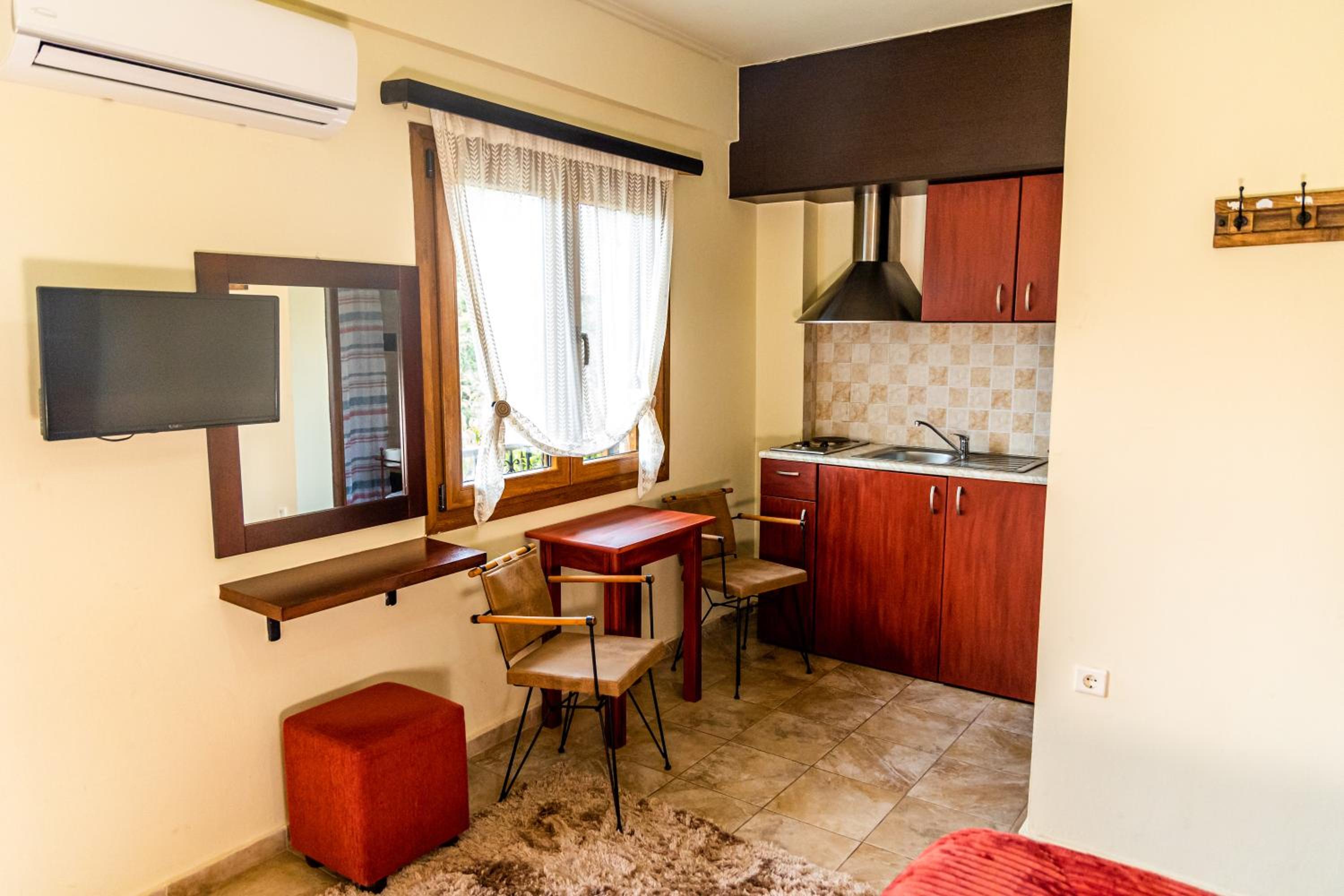 Indulge in our spacious suites and studios at Enastron, each equipped with a kitchen or kitchenette, a cozy seating area with a flat-screen TV, and a private balcony offering stunning views of Helmos Mountain. Upgrade to a unit with a fireplace for added comfort and charm.