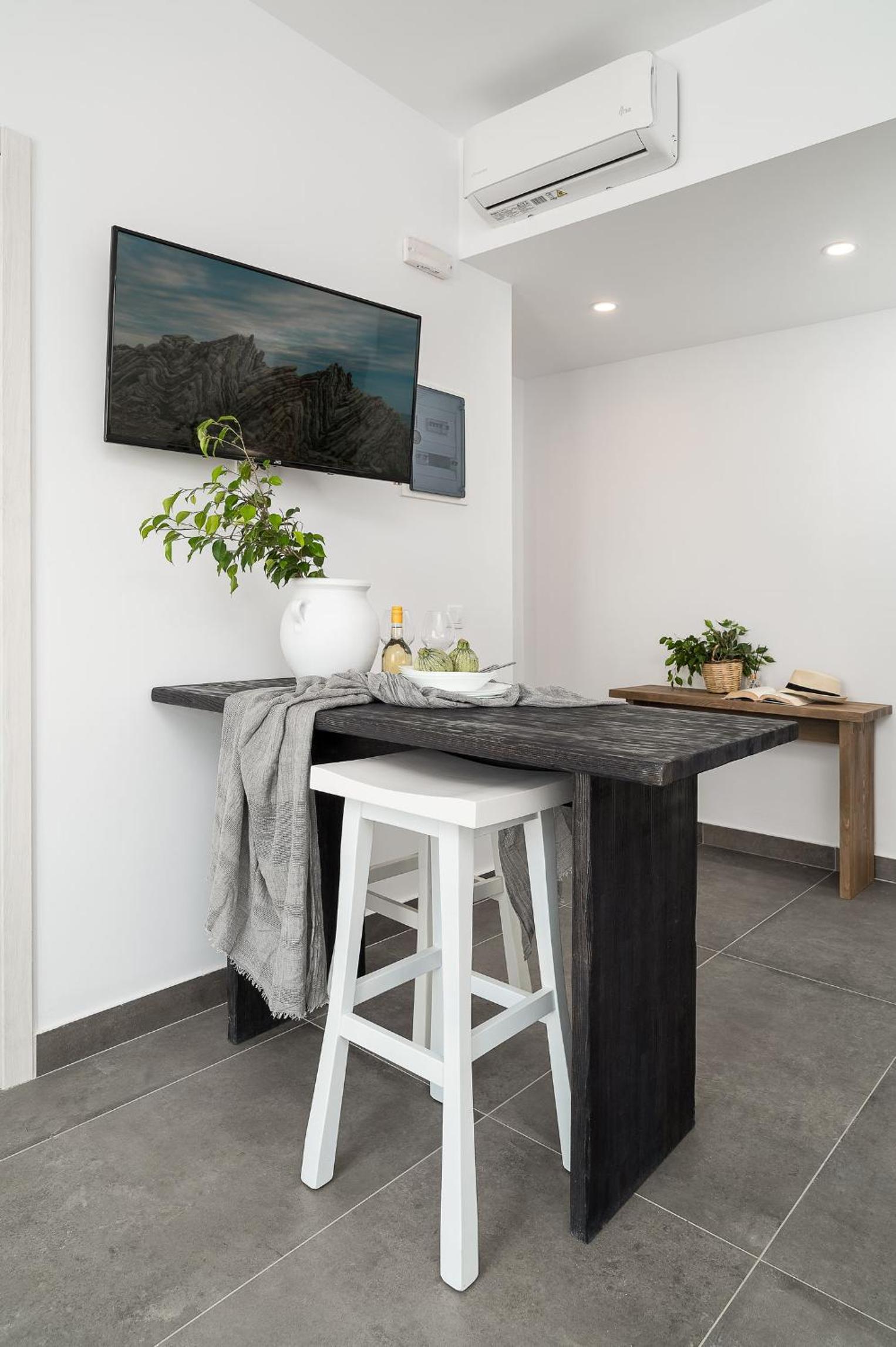 Compact, beautifully decorated, functionality was planned to detail. Everything was perfectly clean. We loved our little safe haven room, the house, the owners, the village, everything. There was a well made info file of restaurants, beaches, shops etc which we used. We felt that our studio had a warm and welcoming heart that helped us rest after a long travel day.