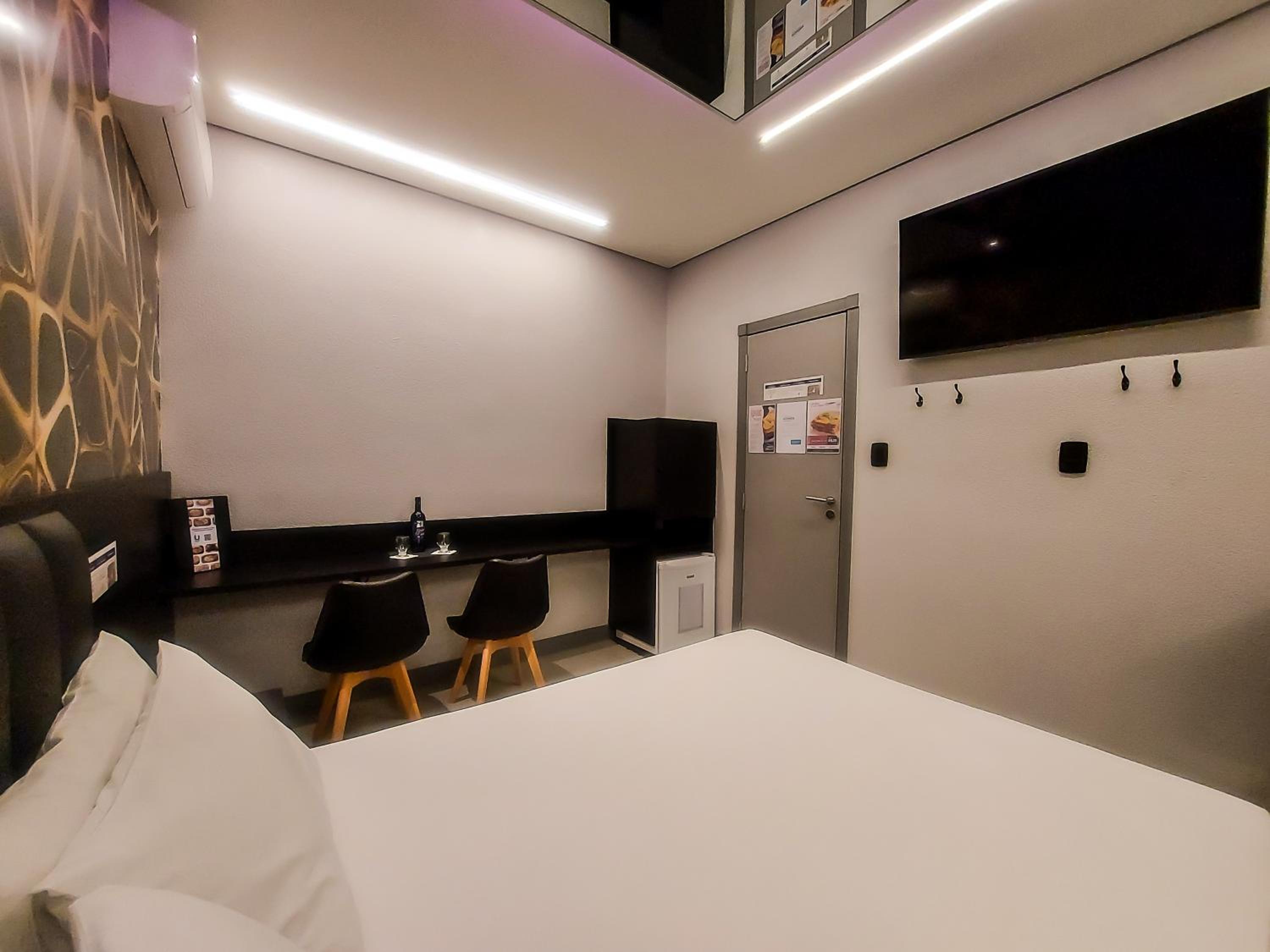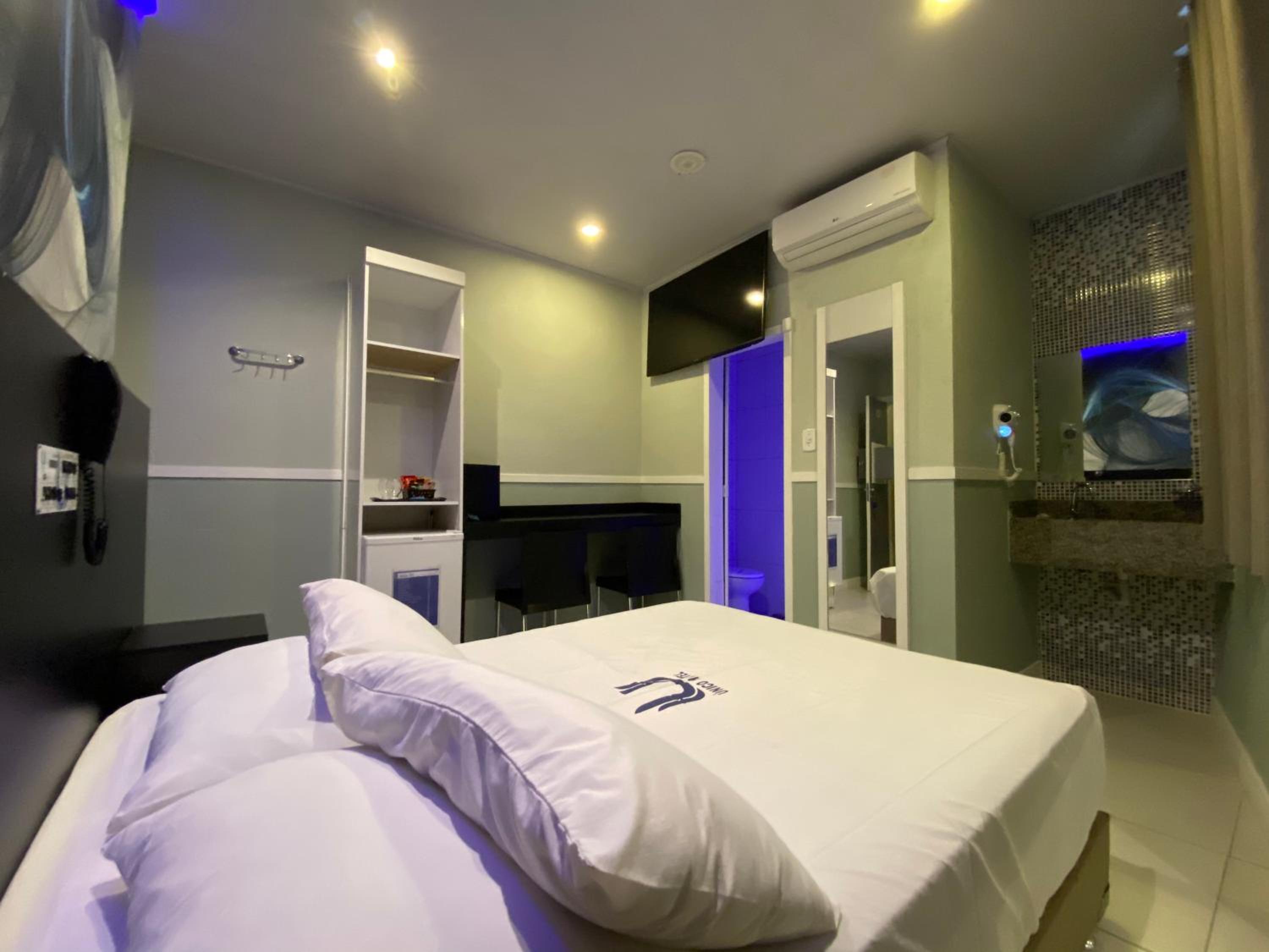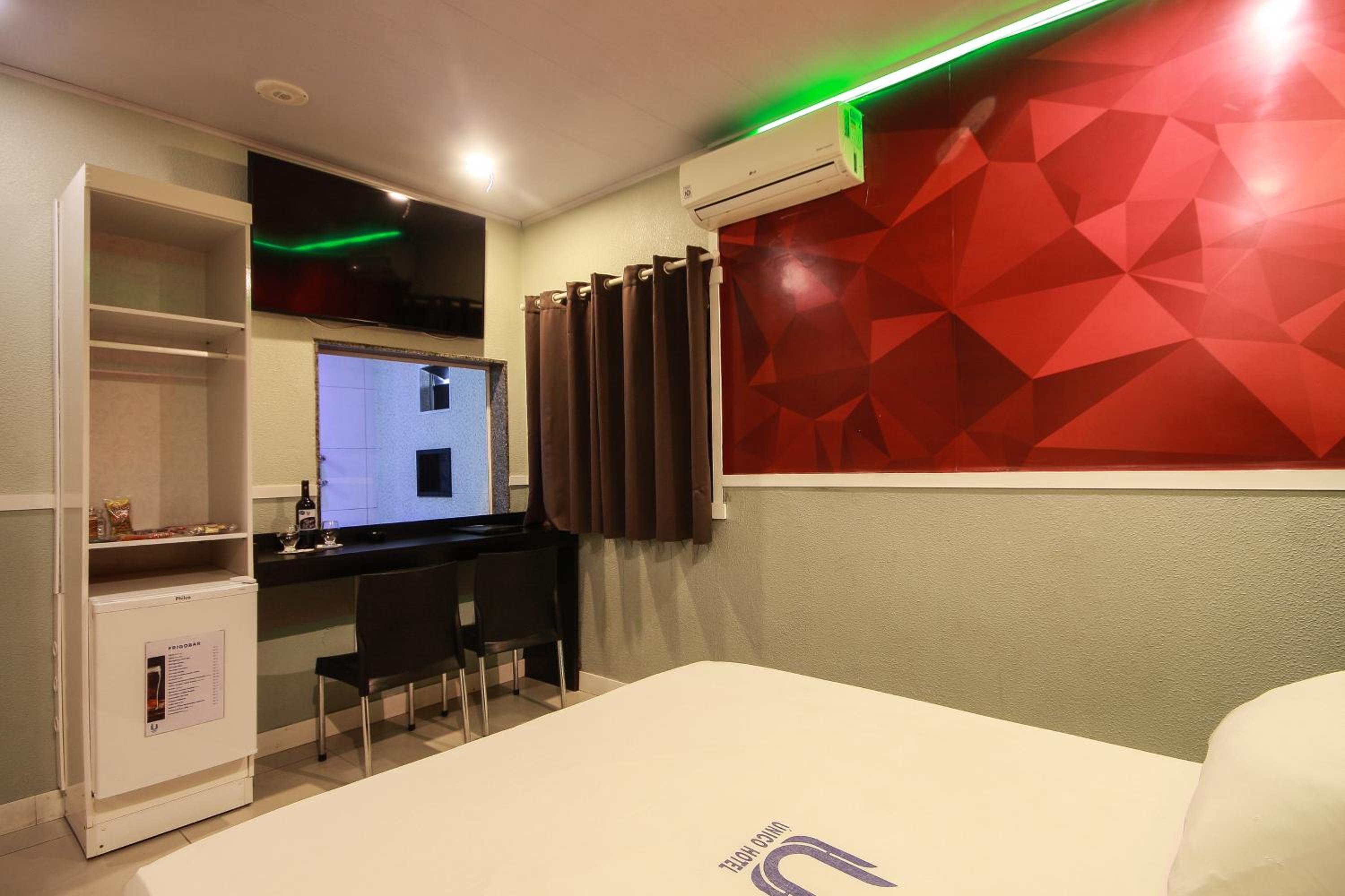 Each room at Único Motel Faria Lima is equipped with modern amenities including a desk, flat-screen TV, and air conditioning, ensuring a comfortable stay for guests.
